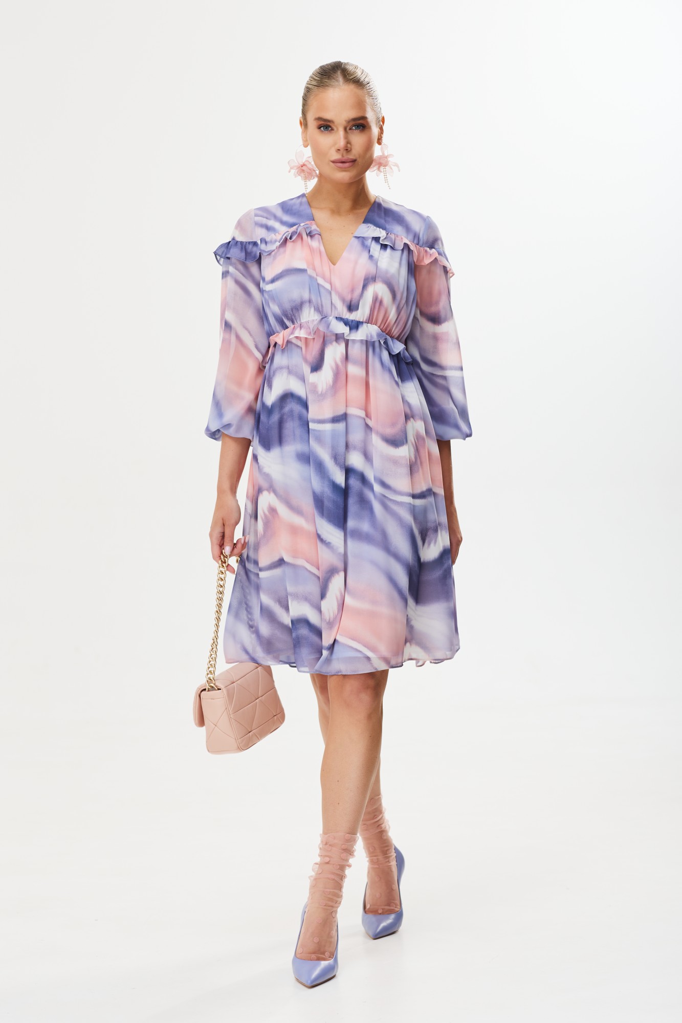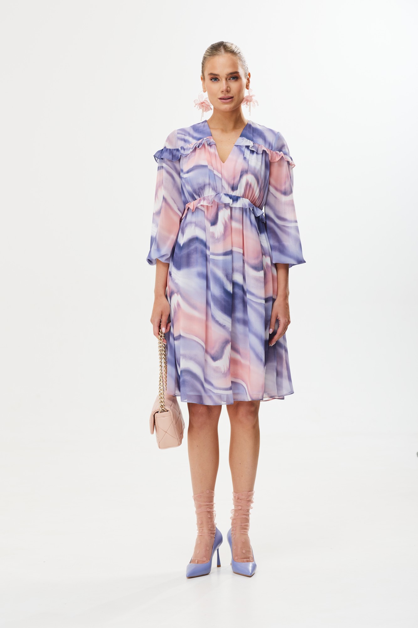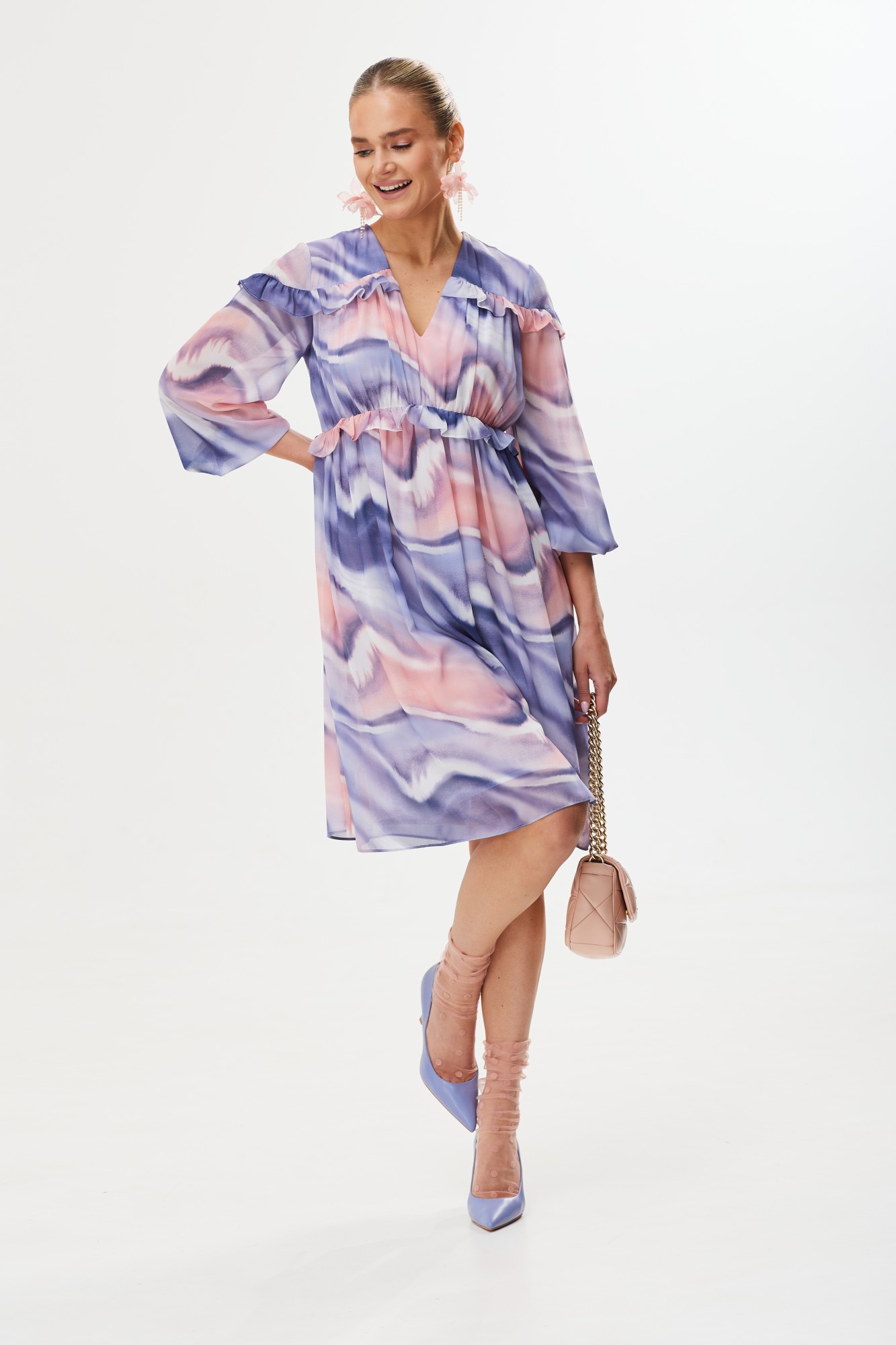 Женственное весеннее платье в нежных оттенках сирени и розы не оставит равнодушной ни одну представительницу прекрасного пола. Модель украшена лаконичными рюшами спереди и сзади. Рукав в 3/4 идеально подходит для весенней погоды. Платье можно надеть на прогулку, встречу с друзьями или вечеринку.