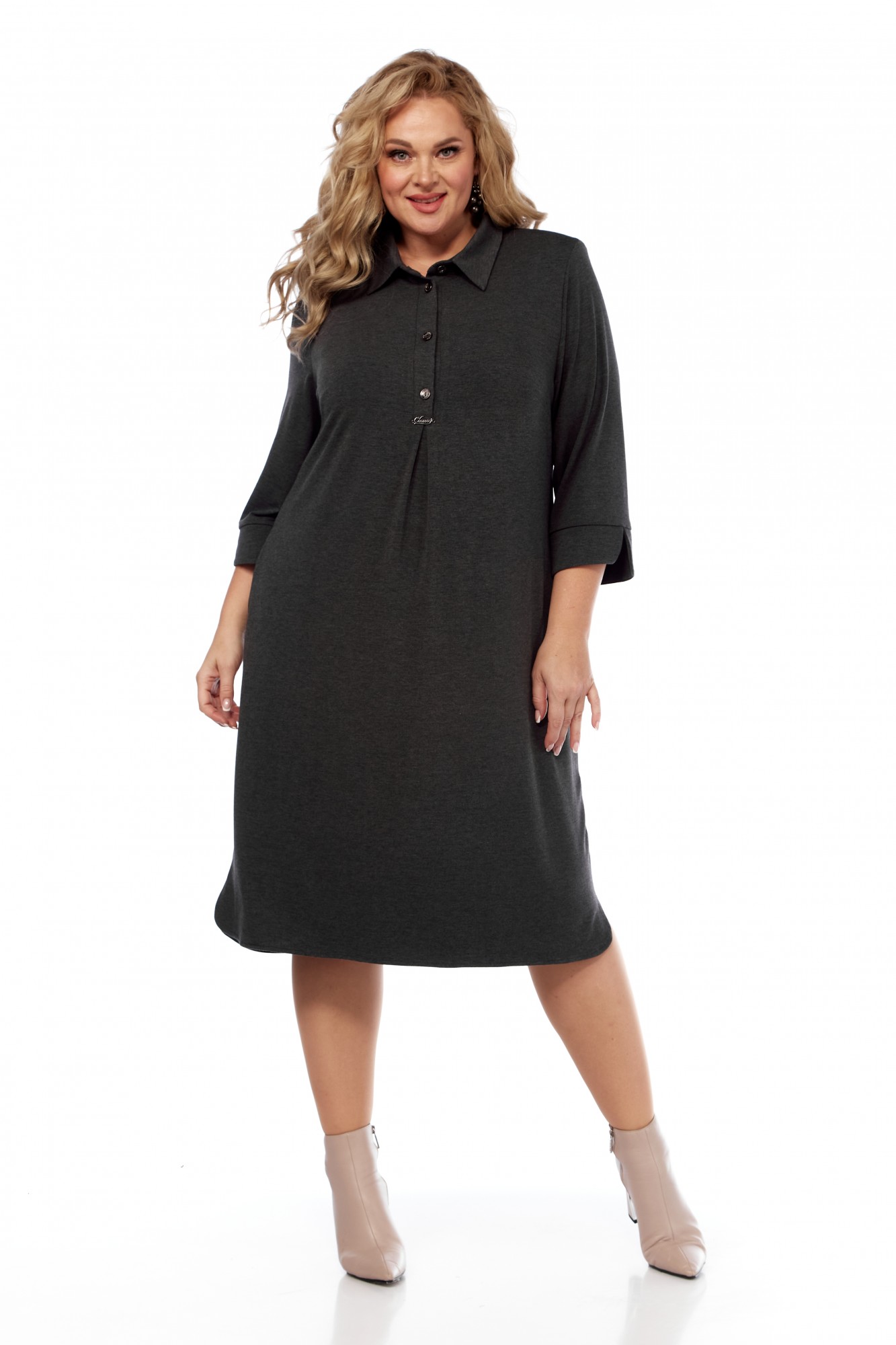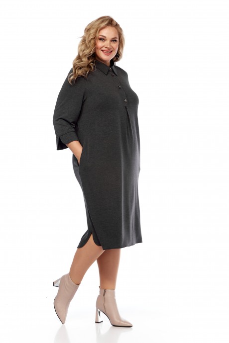 Уникальные притачные манжеты с закругленным разрезом добавляют изысканности, а воротник рубашечного типа и застежка на четыре декоративные пуговицы придают платью элегантный вид.