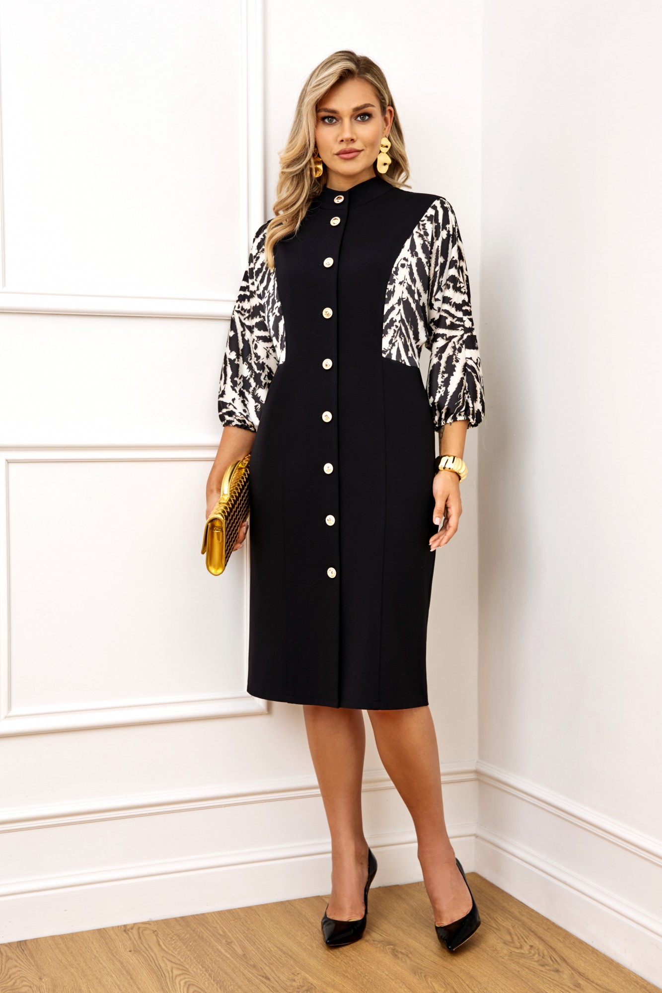 Стильное женское платье, выполнено из высококачественного трикотажа, рукава платья выполнены из атласной ткани с модным дизайнерским принтом, в стиле летучая мышь, по низу рукав на резинке. Платье с застежкой по переду на пуговицы, с горловиной стойкой, что придает модели особый стиль и шарм. Модель удобная и практичная, отлично подойдет для ежедневной носки и торжественного мероприятия.