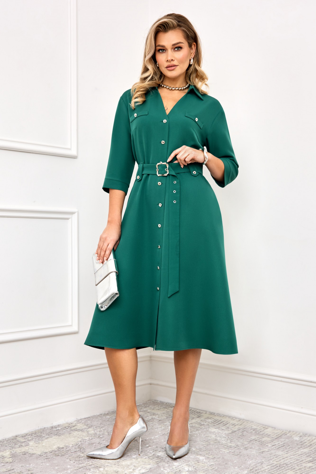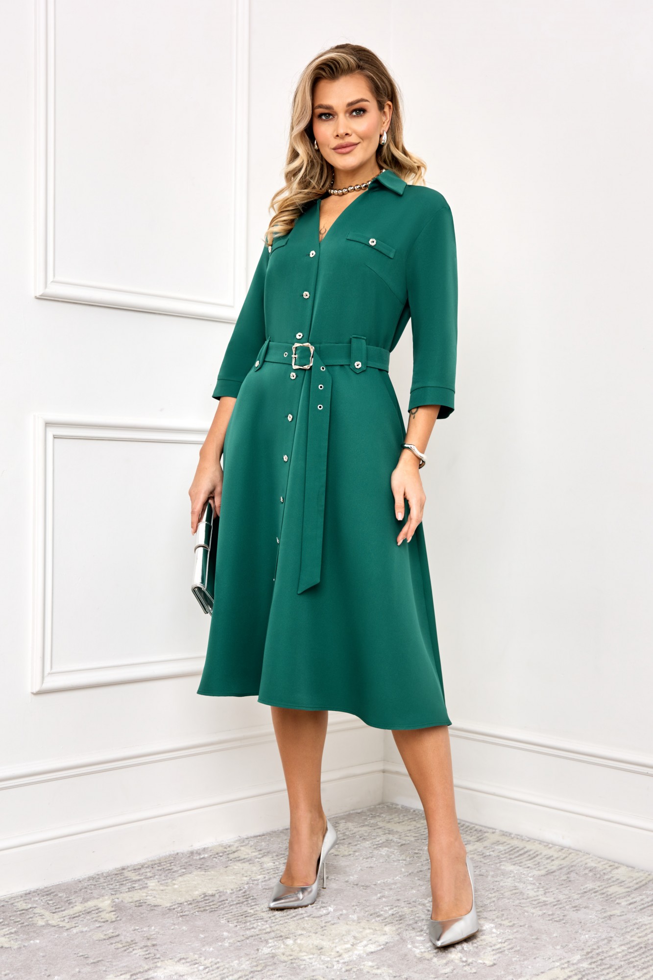 Элегантное женское платье, выполнено из роскошной плательной ткани Барби с напылением. Платье А-силуэта, отрезное по линии талии. Платье по переду с застежкой на пуговицы, в боковых швах юбки функциональные карманы. Рукав втачной, слегка спущенный, по низу с манжетой. По талии пояс из основной ткани, с застежкой на металлическую пряжку. По груди пришита листочка, декорирована пришивной пуговицей. Модель прекрасно подойдет для торжественного мероприятия и ежедневной носки.