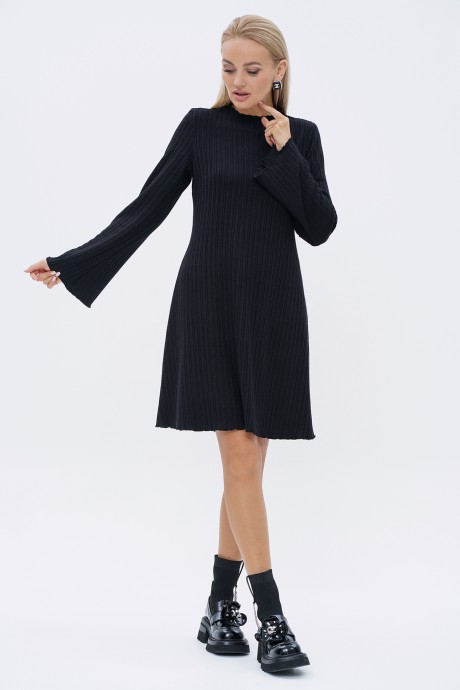 Платье А-образного силуэта с расширением книзу, с цельнокроеной стойкой, с втачными, одно шовными, длинными рукавами книзу расширенные. Горловина, низ изделия и рукава обработаны узкой крае обмёточной строчкой «флешь».