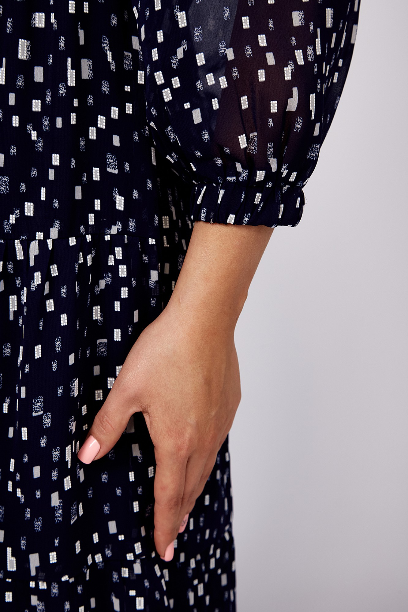 Каждый сезон диктует свои правила, но вне сезона остается платье из шифона, которое одинаково хорошо подходит как для повседневности, так и для особых случаев. Оно выполнено из нежного шифона, что создает впечатление легкости и невесомости. Платье дополнено рукавом длиной ¾ с манжетой на резинке, воротником-стойкой, а также планкой на петли и пуговицы, что придает ему особую изюминку и необычайный шарм. Платье на подкладке. Ярусные воланы придают платью свободу и воздушность. Такой фасон будет актуален в любом образе - как в повседневном casual, так и в праздничном. Если Вы дополните платье коротким деловым жакетом и туфлями на каблуке, то в нём можно пойти на работу в офис. Универсальная длина миди также будет отлично сочетаться с кедами или кроссовками в спортивном стиле. А если Вы хотите насладиться уютным городским вечером и вдруг станет прохладно, то просто возьмите с собой на прогулку джинсовку оверсайз.