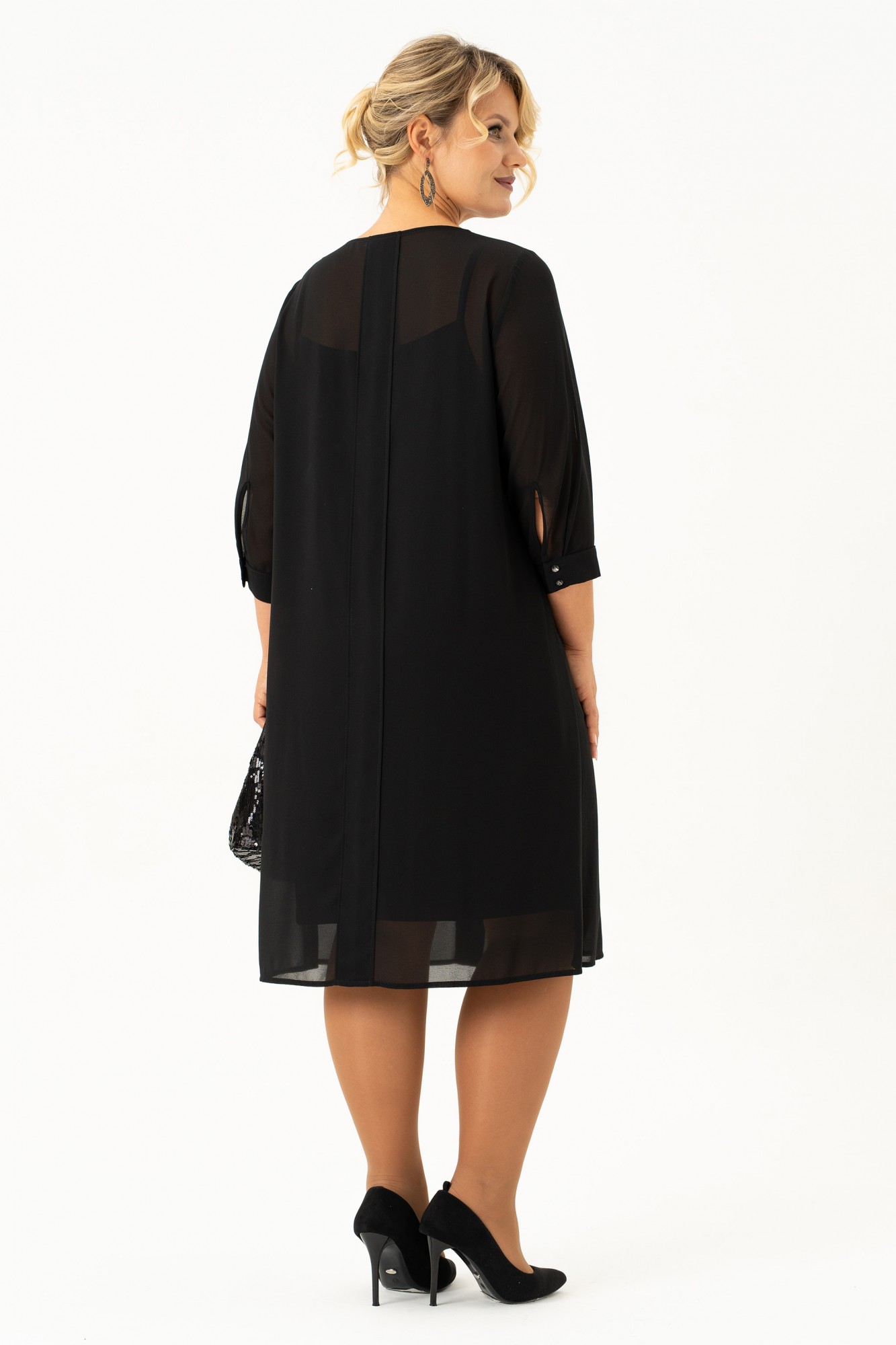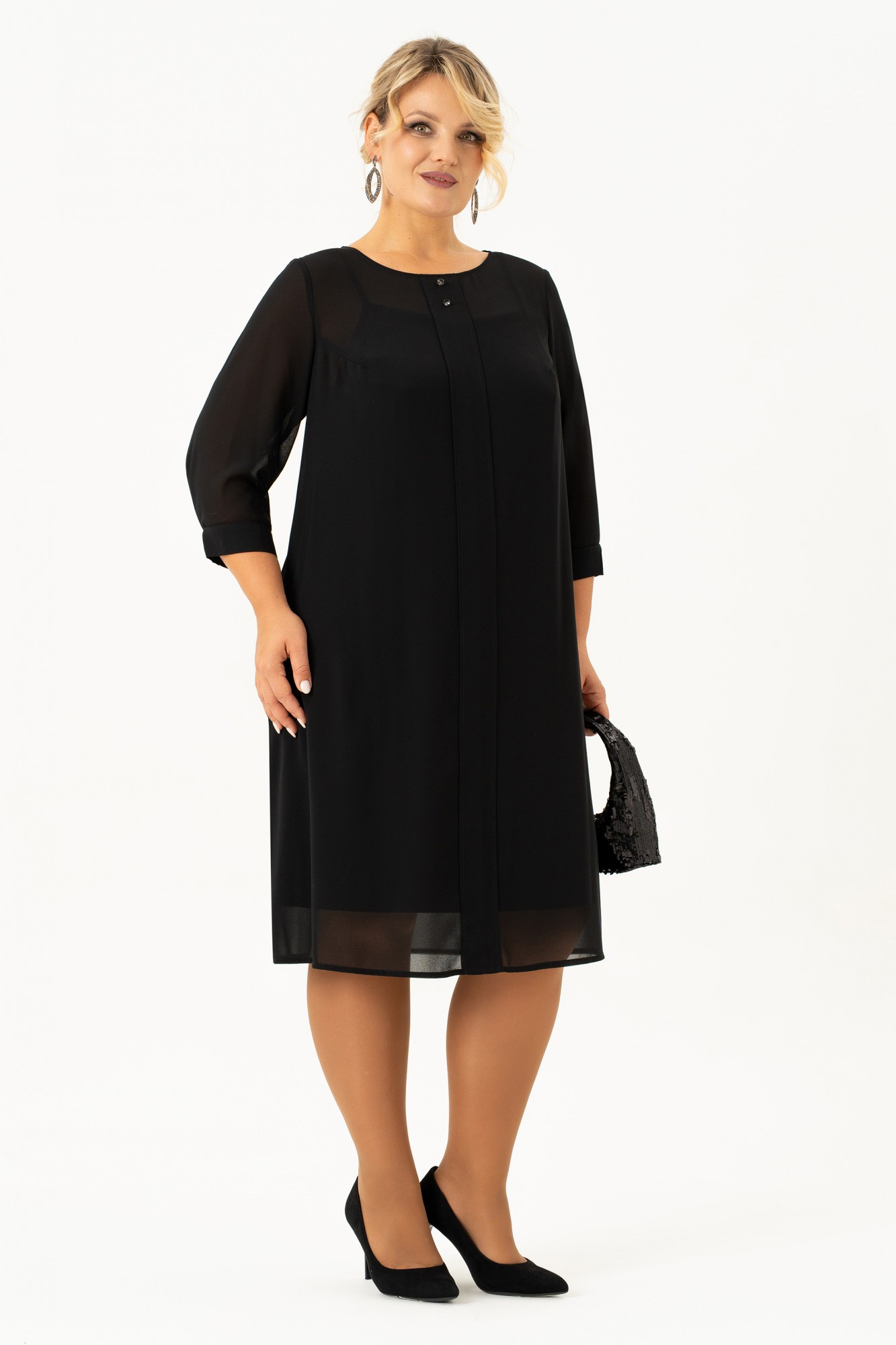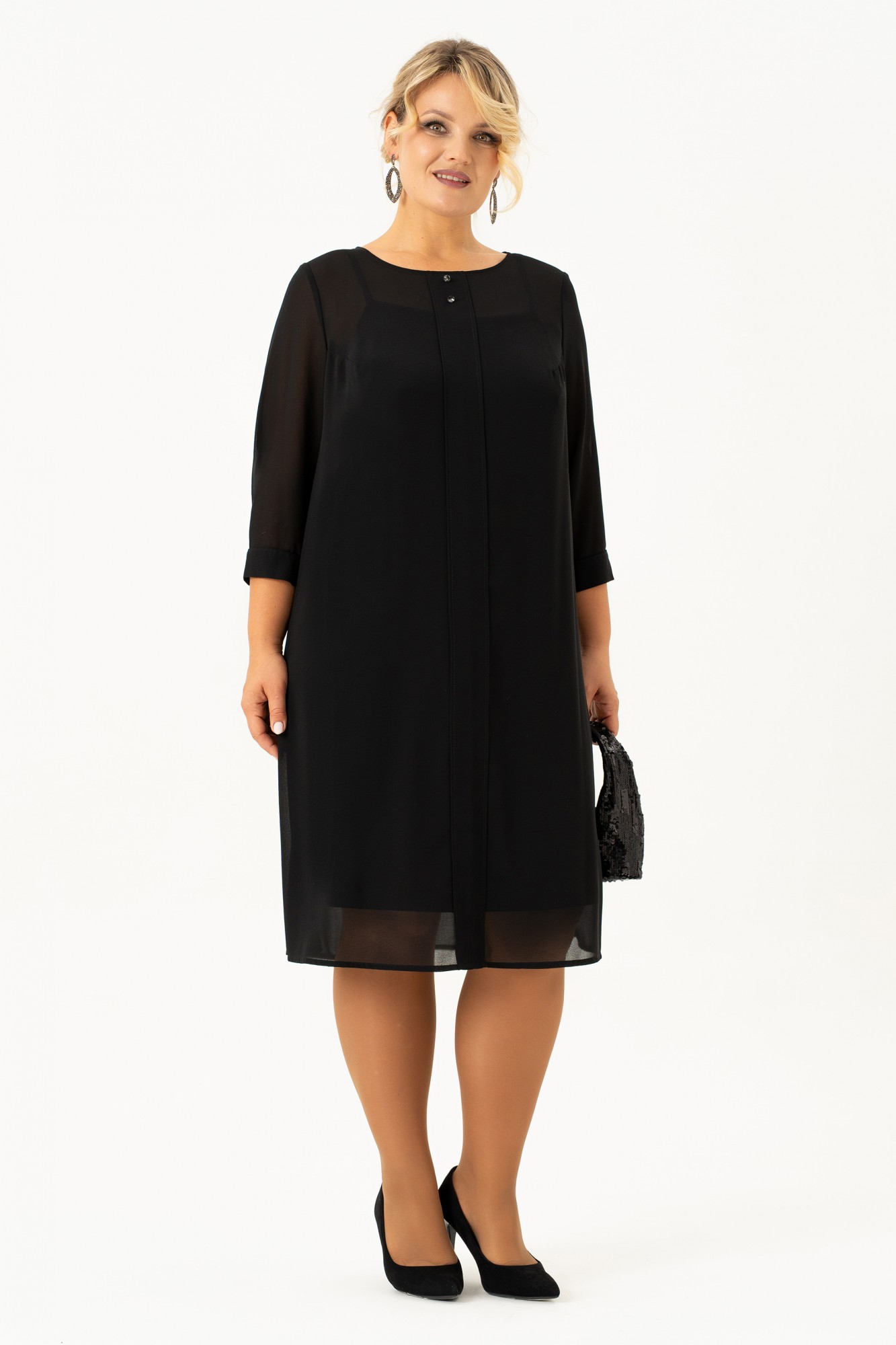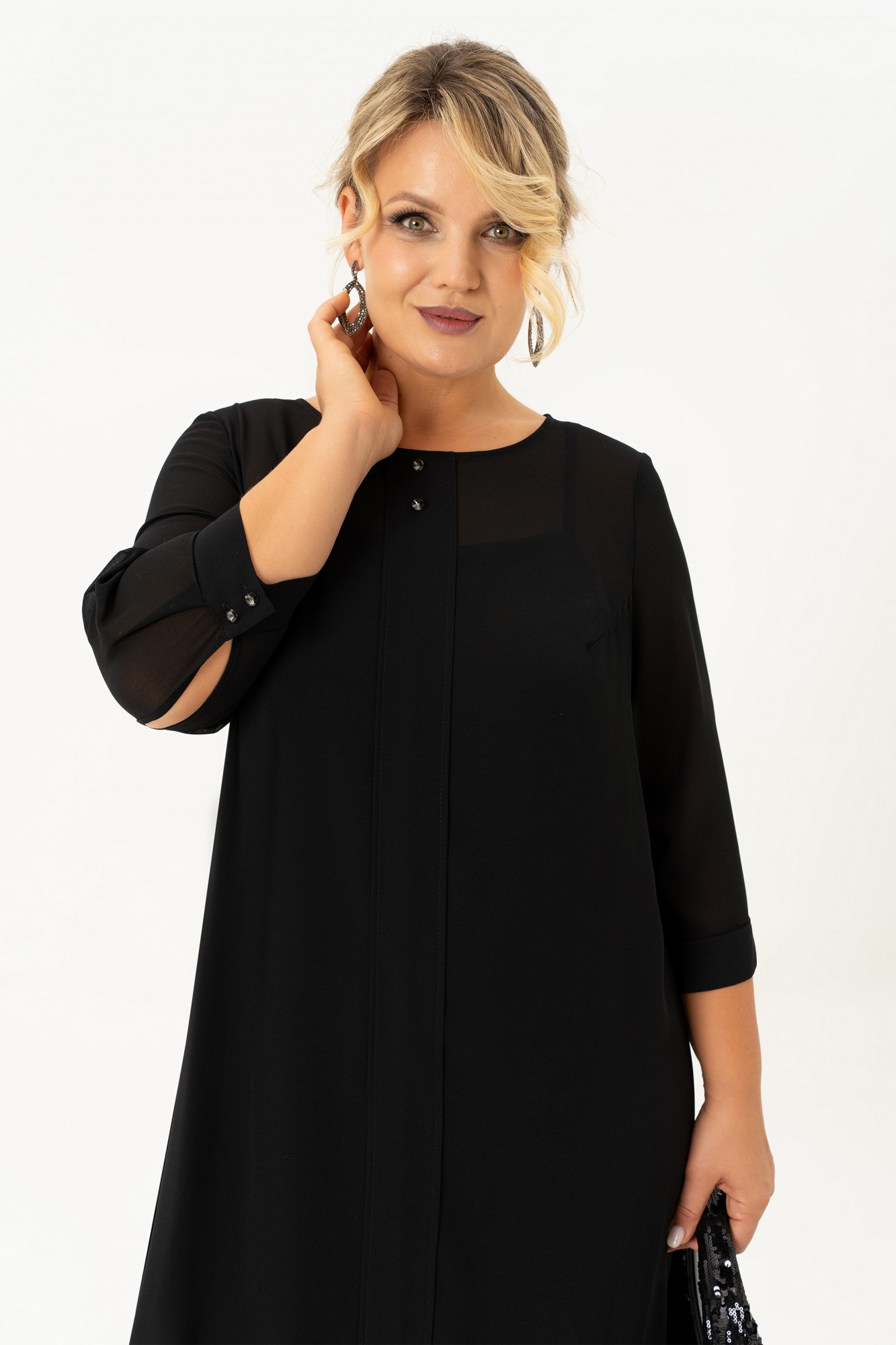 Нарядно повседневное, универсальное, элегантное черное платье с рукавом длиной ¾ на манжете и отдельным подкладом поможет Вам в создании абсолютно разных образов. Платье имеет классический прямой крой с бантовыми складками по переду и по спинке, которые добавляют романтичность и элегантность. Платье подойдет как высоким, так и невысоким женщинам, благодаря своей миди длине. Верхнее платье выполнено из шифона, горловина декорирована пуговицами. Нижнее платье из ткани "масло" на бретелях. Это платье Вы можете легко использовать как вечернее, платье для прогулки или на свидание, на день рождения или клуб, для фотосессии или романтического вечера. Такое платье будет уместно в любом гардеробе.