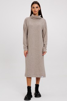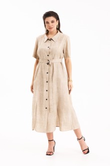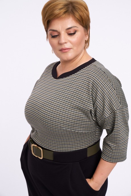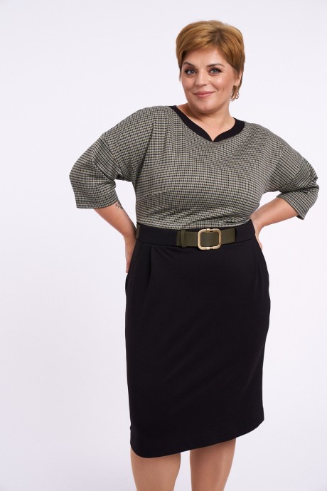 Платье женское, приталенного силуэта, выполнено из двух видов трикотажной ткани. Вырез горловины овальный с притачной фигурной планкой из контрастной ткани, по спинке выполнен разрез и застёжка на 2 воздушные петли и пуговицы. По переду расположены нагрудные вытачки. Платье отрезное по линии талии с притачным поясом. На поясе переда расположена широкая шлёвка для декоративного ремня (ремень не идет в комплекте). В нижней передней части платья имеются боковые карманы и складки. В нижней задней части платья - талиевые вытачки. Спинка со средним швом, в котором имеется потайная тесьма-молния. В левом боковом шве имеется разрез. Линия плеча спущена, рукав втачной. В качестве декора используется готовый ремень. Платье может использоваться как для повседневной носки, так и для работы в офисе, в школе, удобное, силуэт подчёркивает достоинства фигуры, за счёт качеств трикотажа, приятное на ощупь и не сковывает движение.