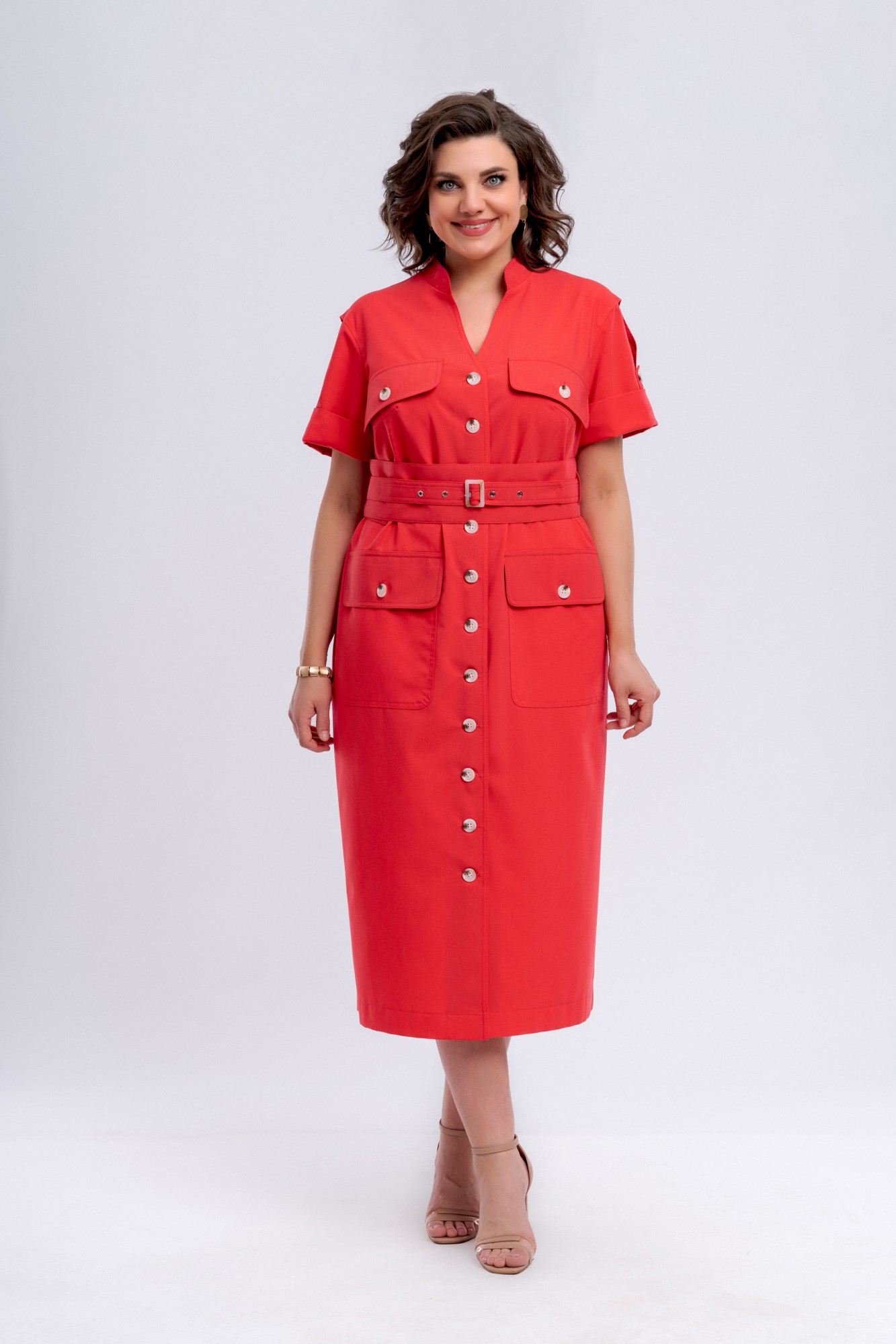 Платье женское полуприлегающего силуэта, зауженное к низу. По переду платья расположены нагрудные вытачки, накладные клапаны и накладные карманы с клапаном. Спинка - цельная. Вырез горловины V-образный. Воротник – стойка с закругленными концами. Застежка – центральная бортовая на петли-пуговицы. Рукав короткий, разрезной по центру. Вверху от оката рукава V-образный разрез. Рукав с притачной манжетой и воздушной петлей с пуговицей. В качестве декора используется пояс из основной ткани, который состоит из двух поясов. Нижний пояс - широкий, застегивается на пришивные кнопки по боковому шву. Верхний пояс - узкий, крепится на нижнем с помощью шлевок, застегивается на пряжку. Платье очень женственное, удобное, не сковывает движения, может подойти на все случаи в жизни, как для вечерних прогулок по городу, так и для работы.