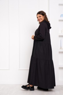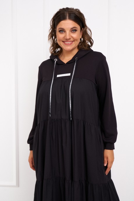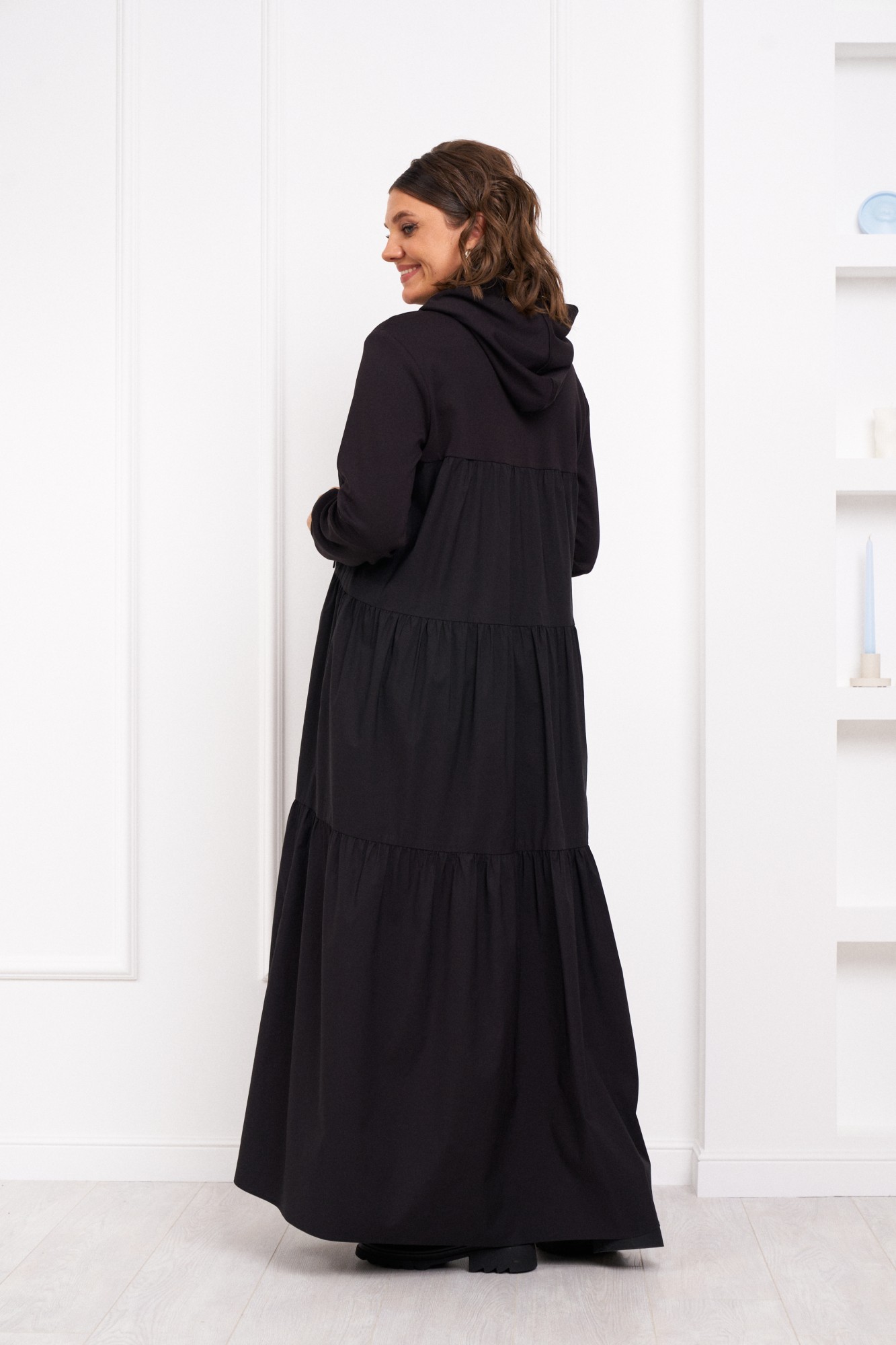 Молодежное платье свободного силуэта, выполнено из двух видов ткани, кокетки, рукава, капюшон - из трикотажа. По переду и спинке три оборки. Рукав втачной, длинный, заканчивается манжетой. Отделкой служат люверсы и шнур.