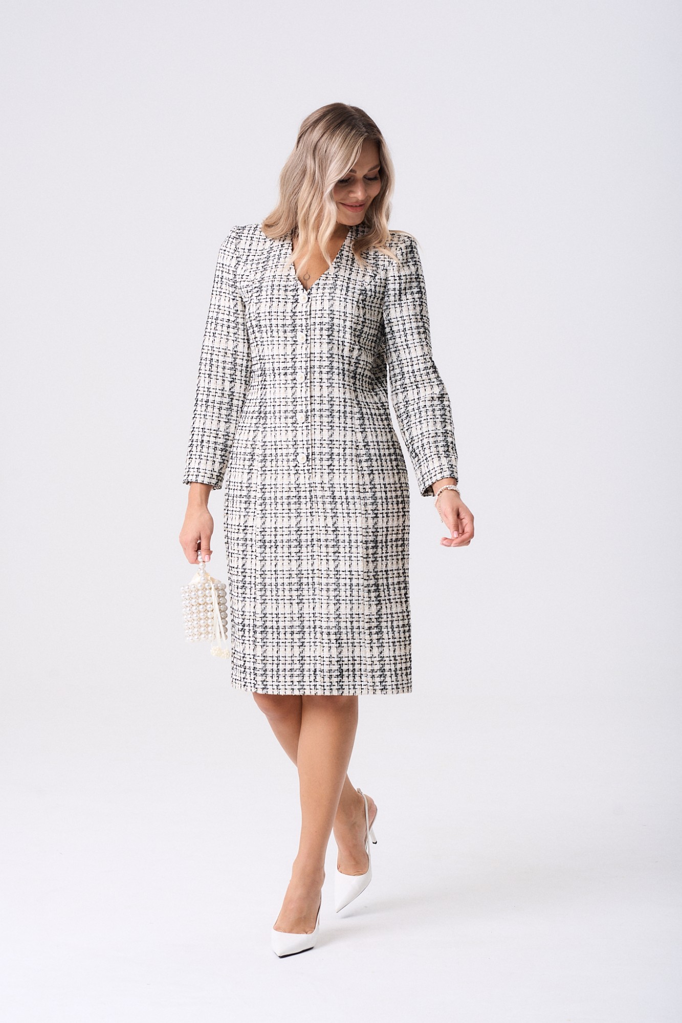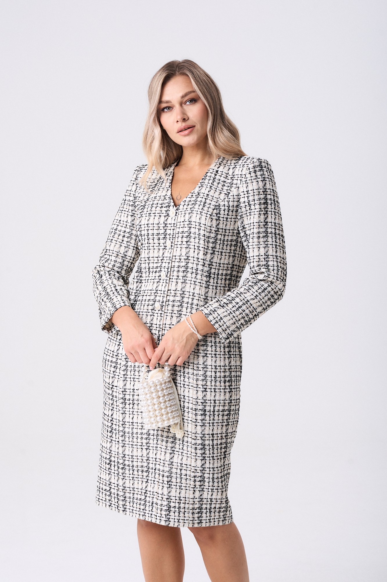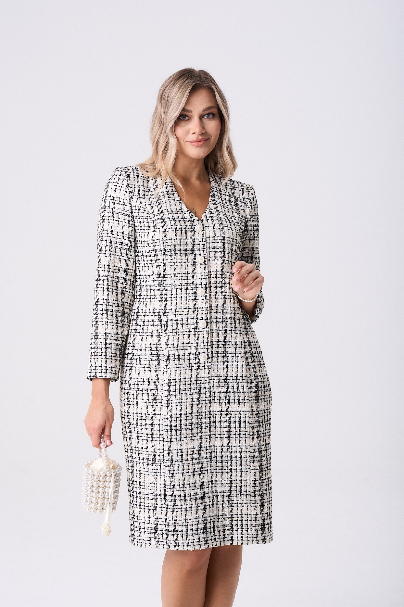 Платье женское полуприлегающего силуэта в стиле шанель длинной ниже колена. По полочке обработаны рельефы, в среднем шве функциональная планка, затягивающаяся на петли и пуговицы до линии бедра. Вырез горловины V-образный. По спинке обработаны таллиевые выточки. Рукав втачной, длинный.