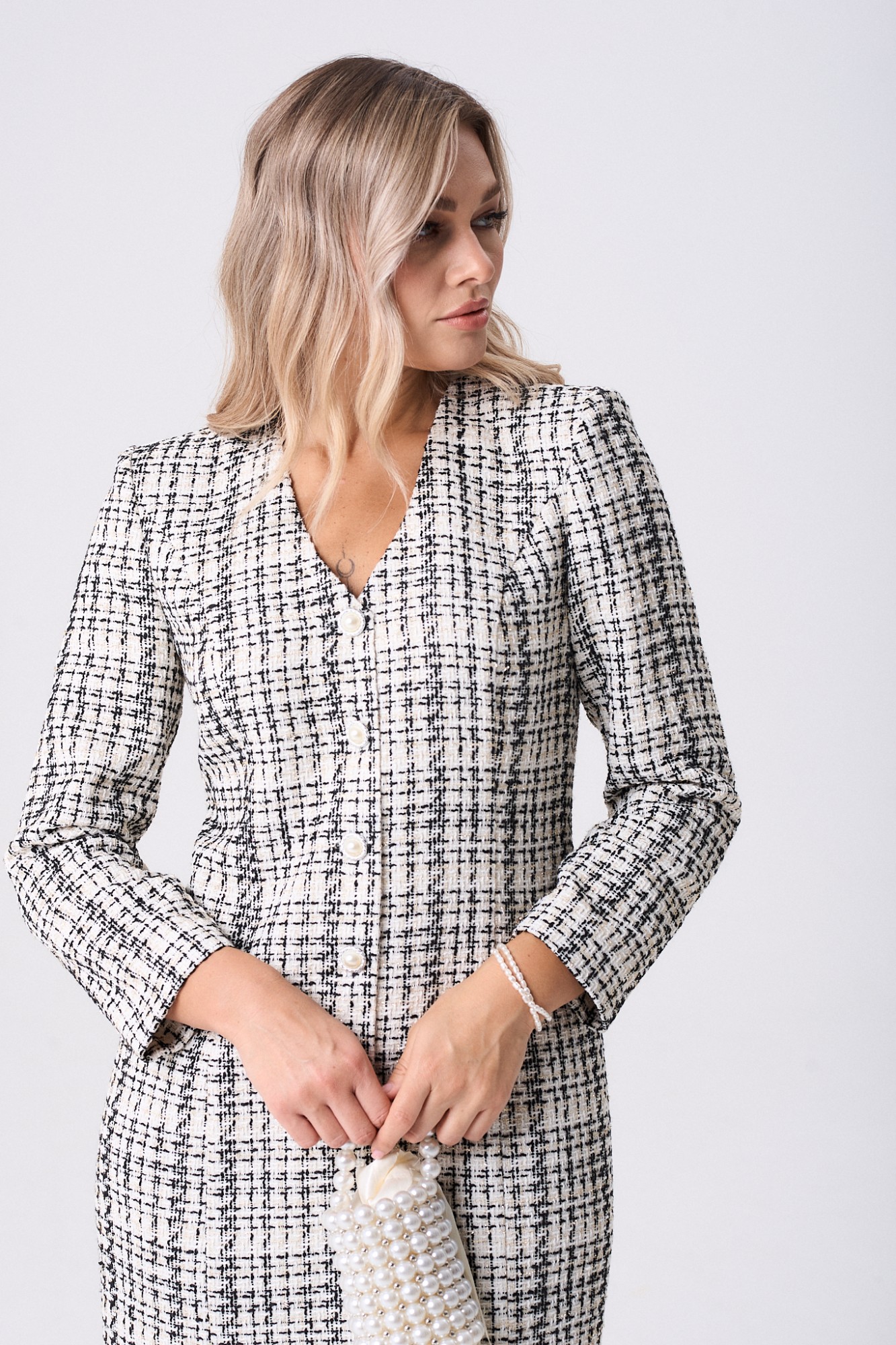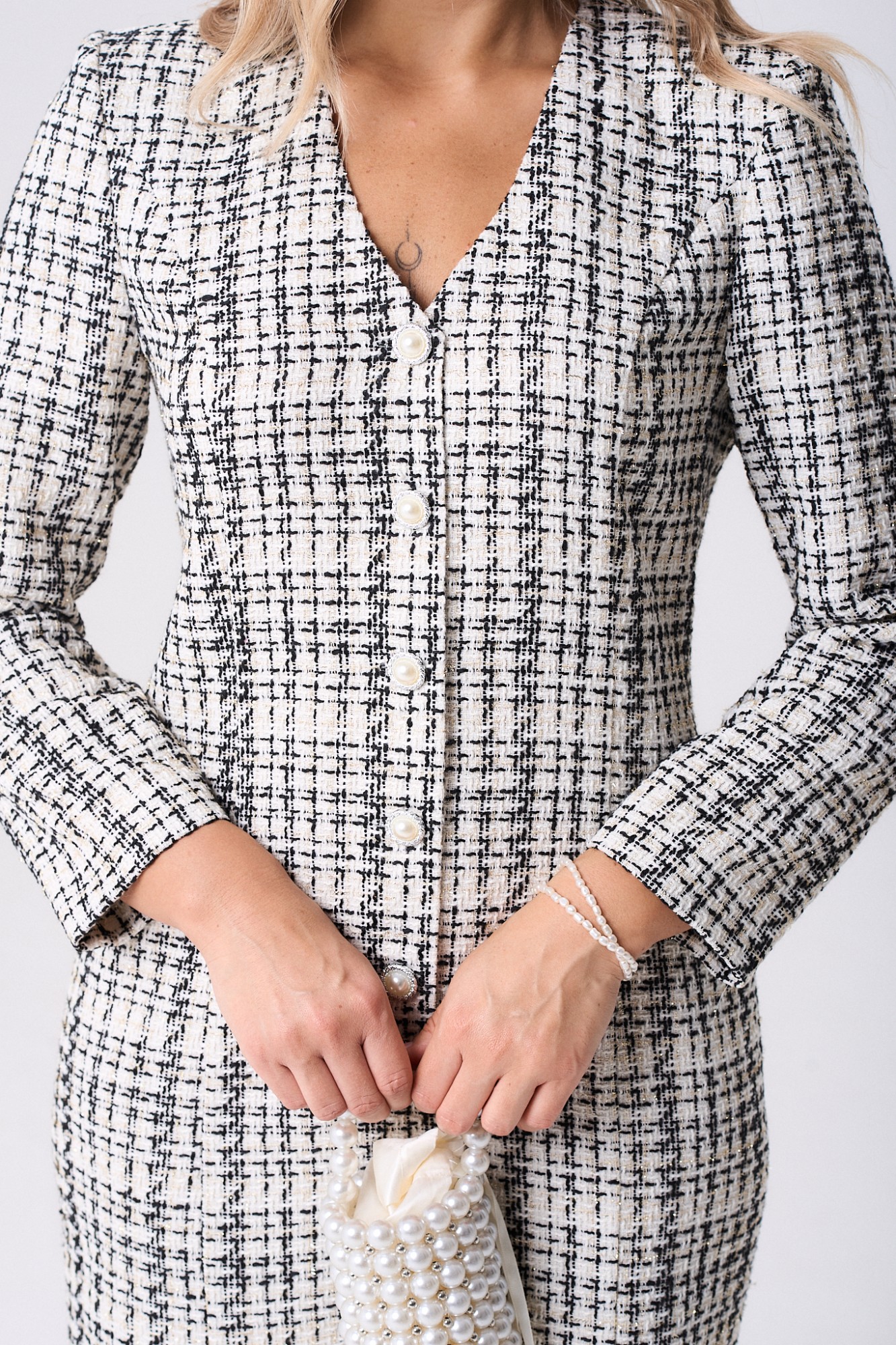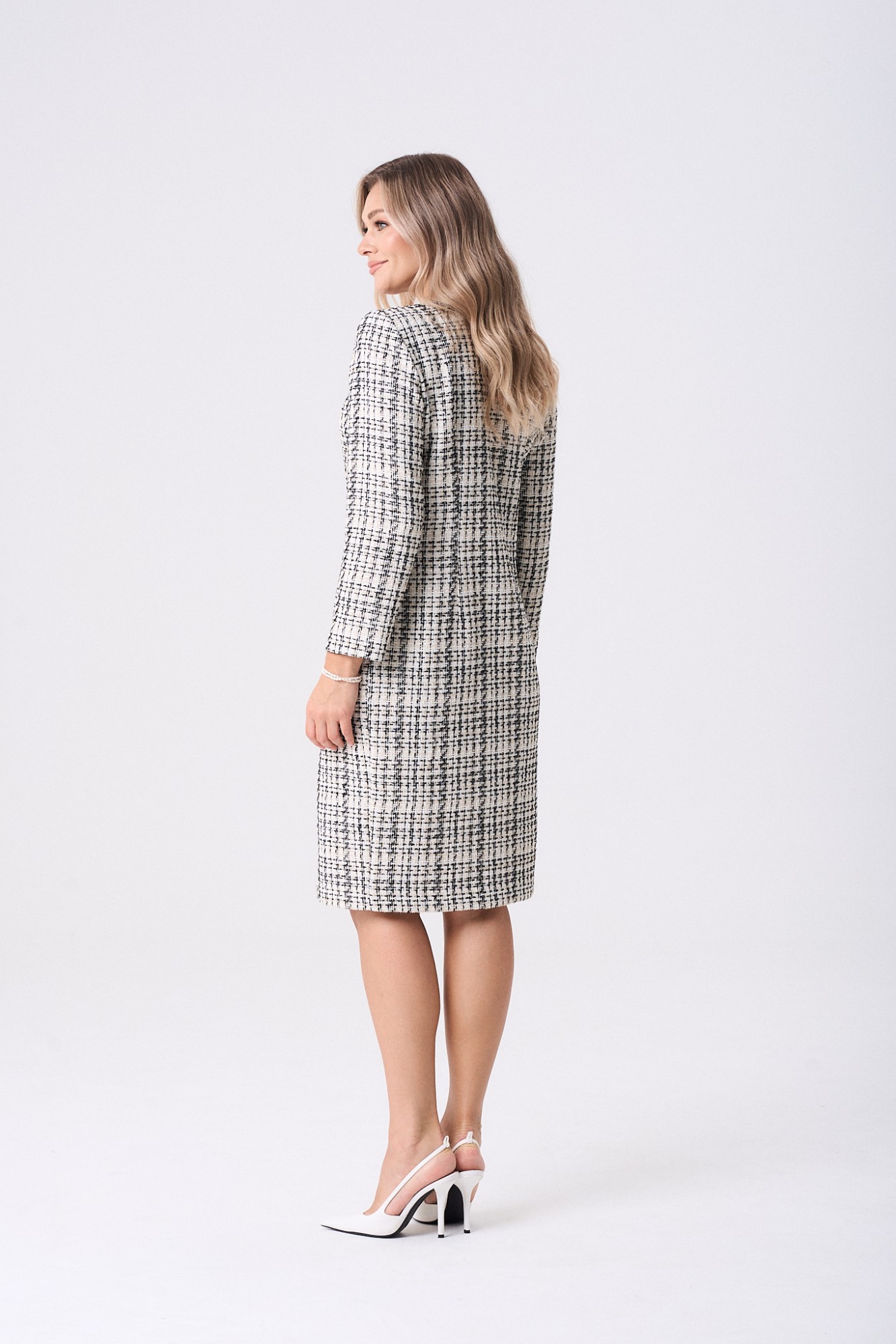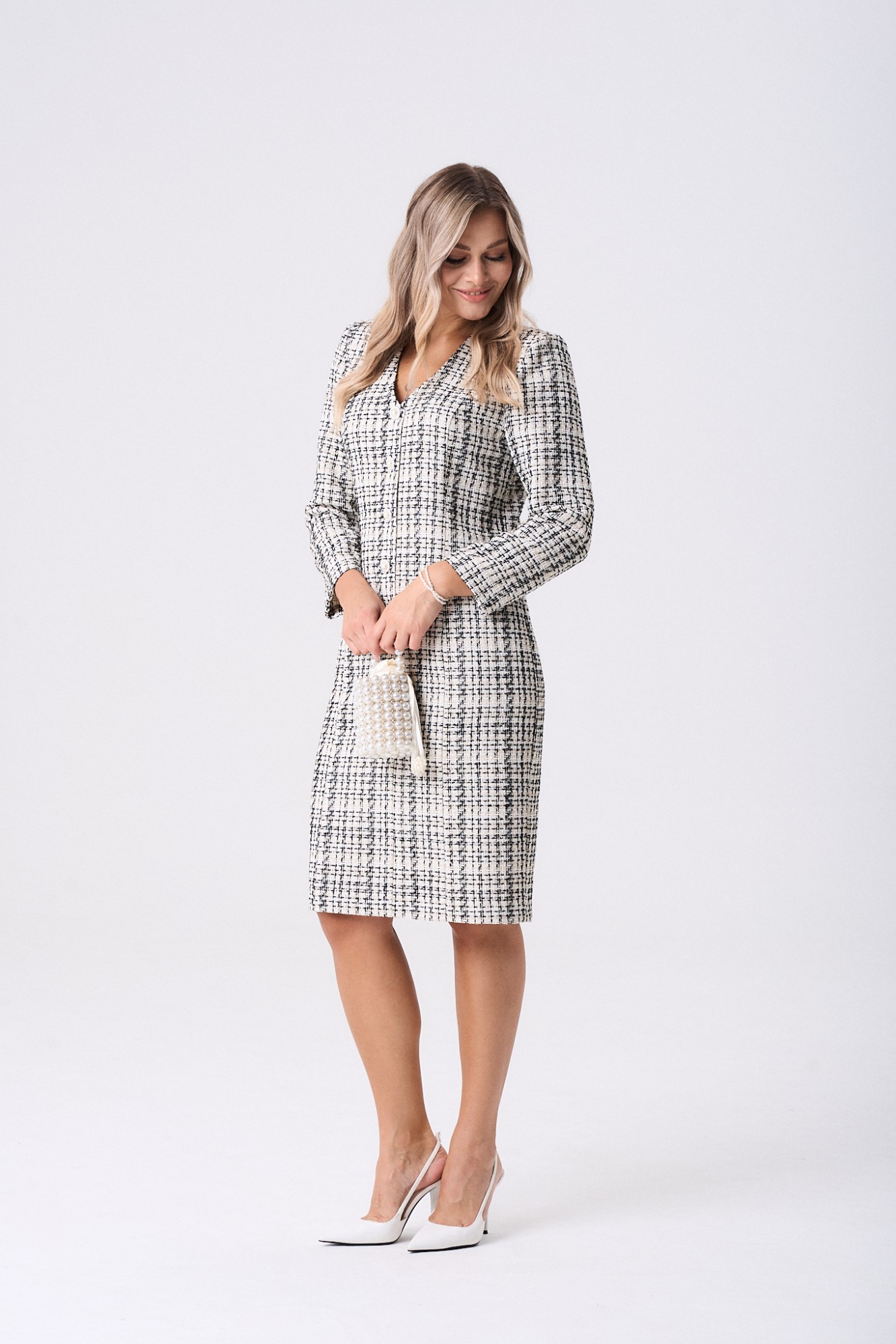 Платье женское полуприлегающего силуэта в стиле шанель длинной ниже колена. По полочке обработаны рельефы, в среднем шве функциональная планка, затягивающаяся на петли и пуговицы до линии бедра. Вырез горловины V-образный. По спинке обработаны таллиевые выточки. Рукав втачной, длинный.