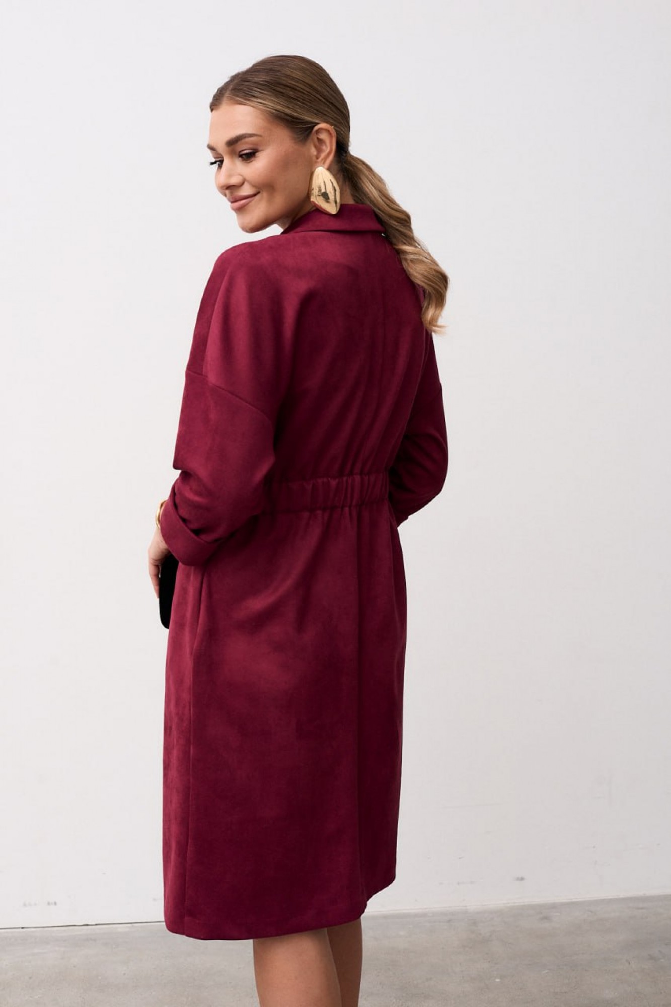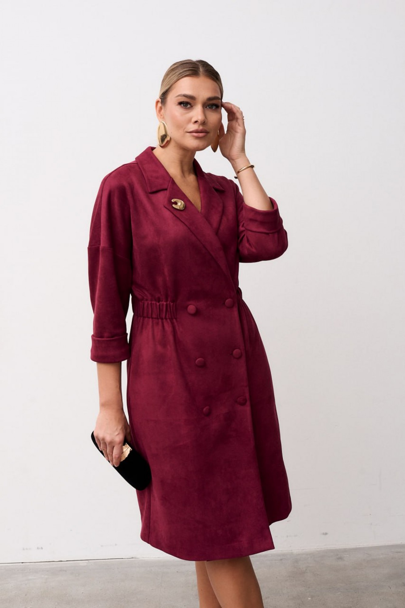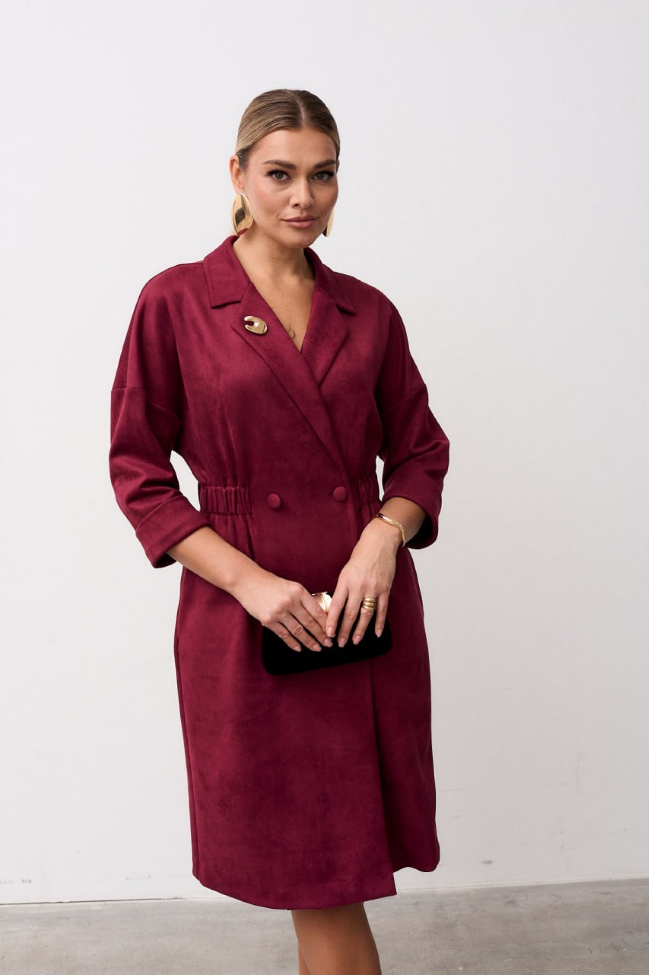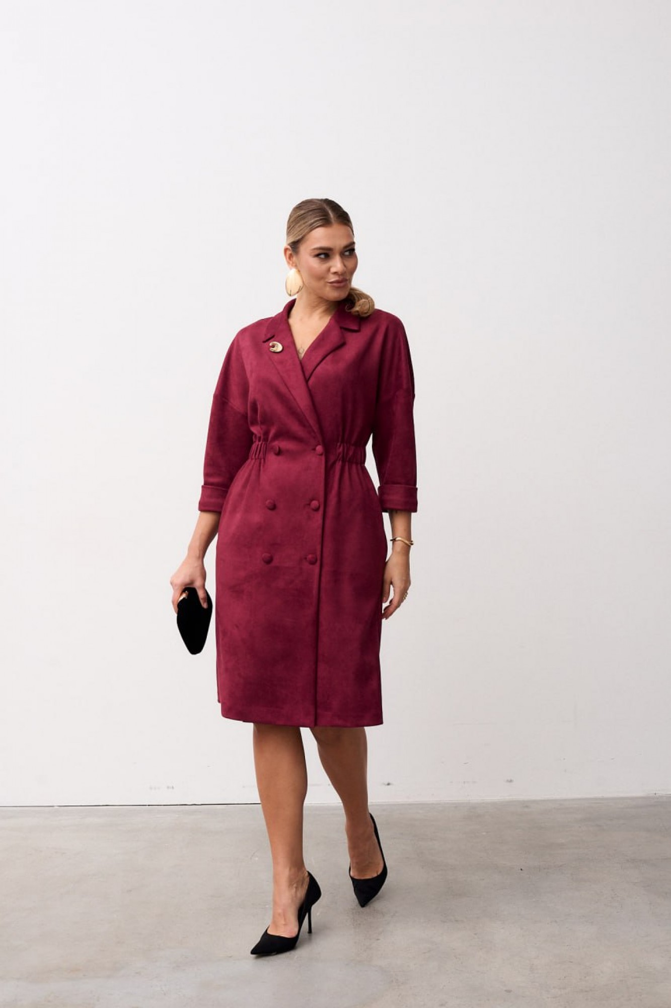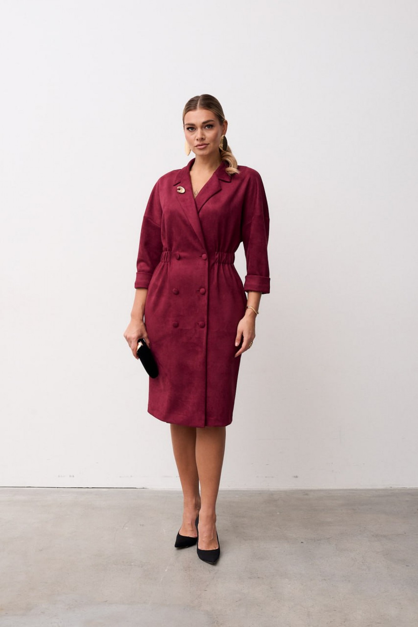 Платье женское полуприлегающего силуэта выполнена из мягкой замшевой ткани. Платье длинной за колено, слегка зауженное к низу. Застёжка центральная, двубортная застёгивающаяся на петли и пуговицы, воротник пиджачного типа с отложными лацканами. По линии талии вставлена кулиса с эластичной тесьмой благодаря чему платье садится идеально на любой тип фигуры. В боковых швах обработаны карманы. Рукав втачной длинной ¾ по низу притачная манжета. Линия плеча спущена.