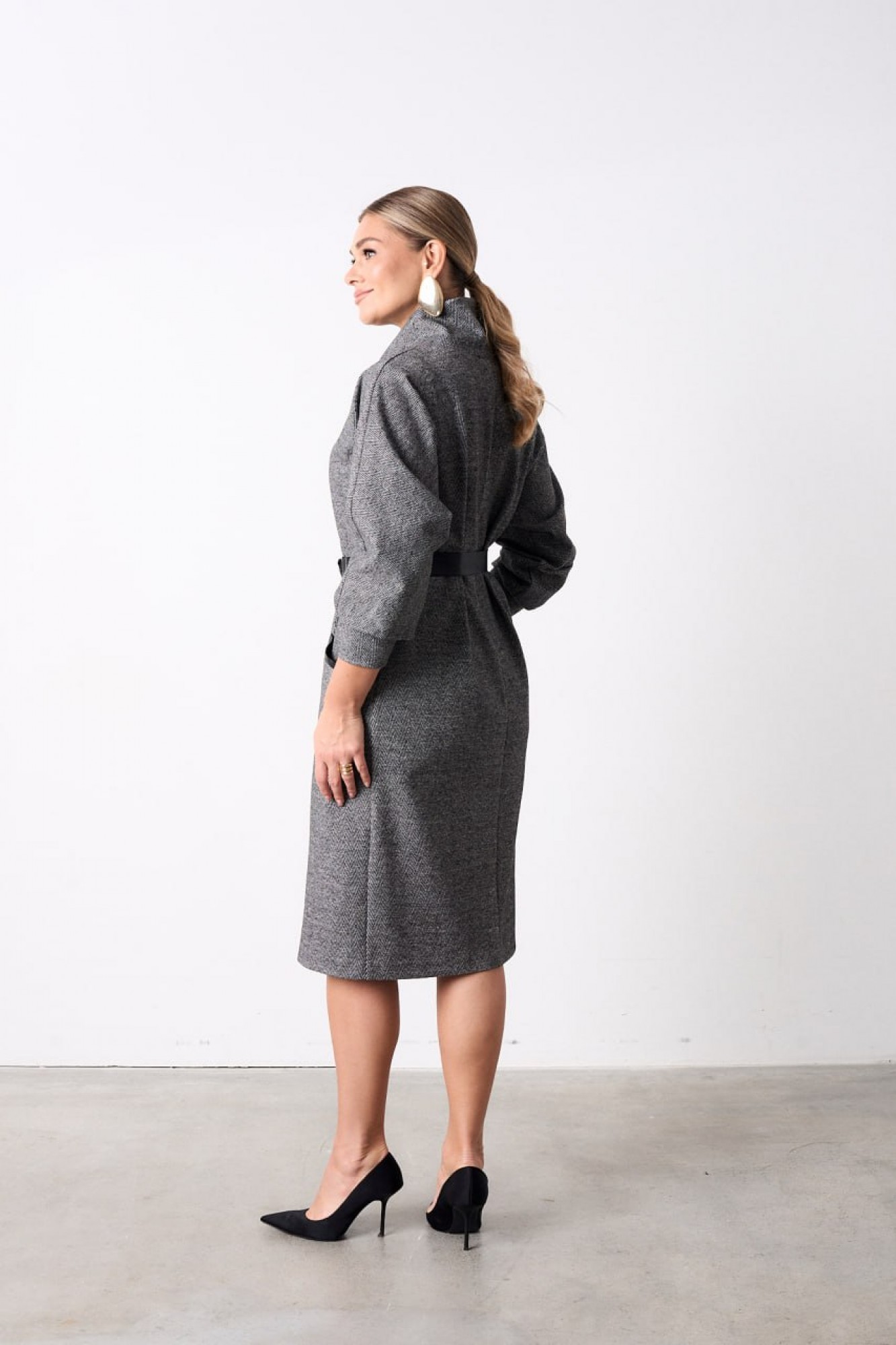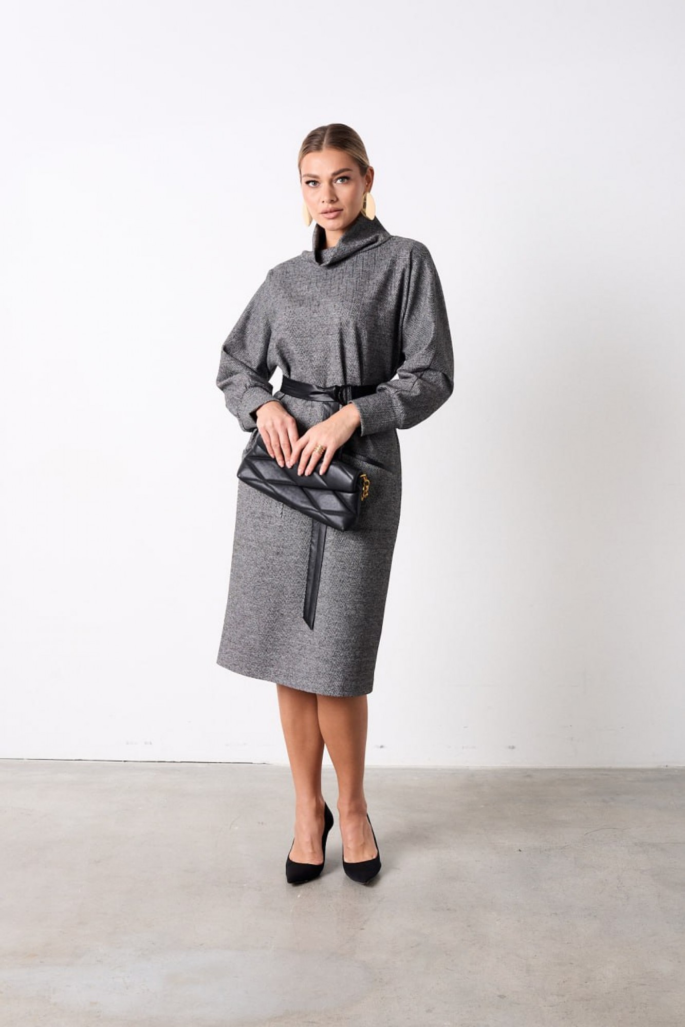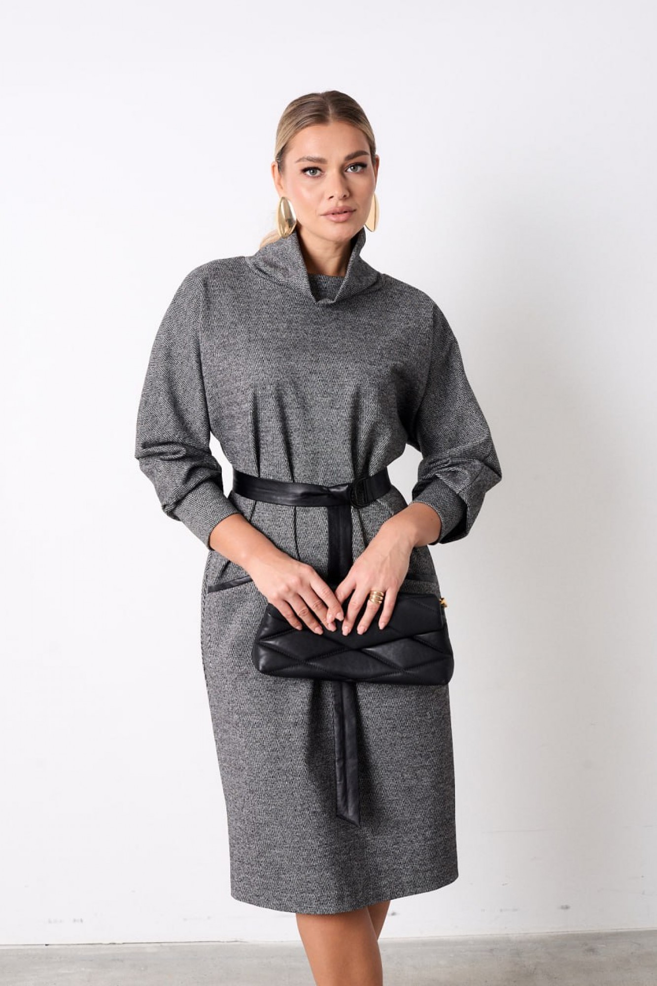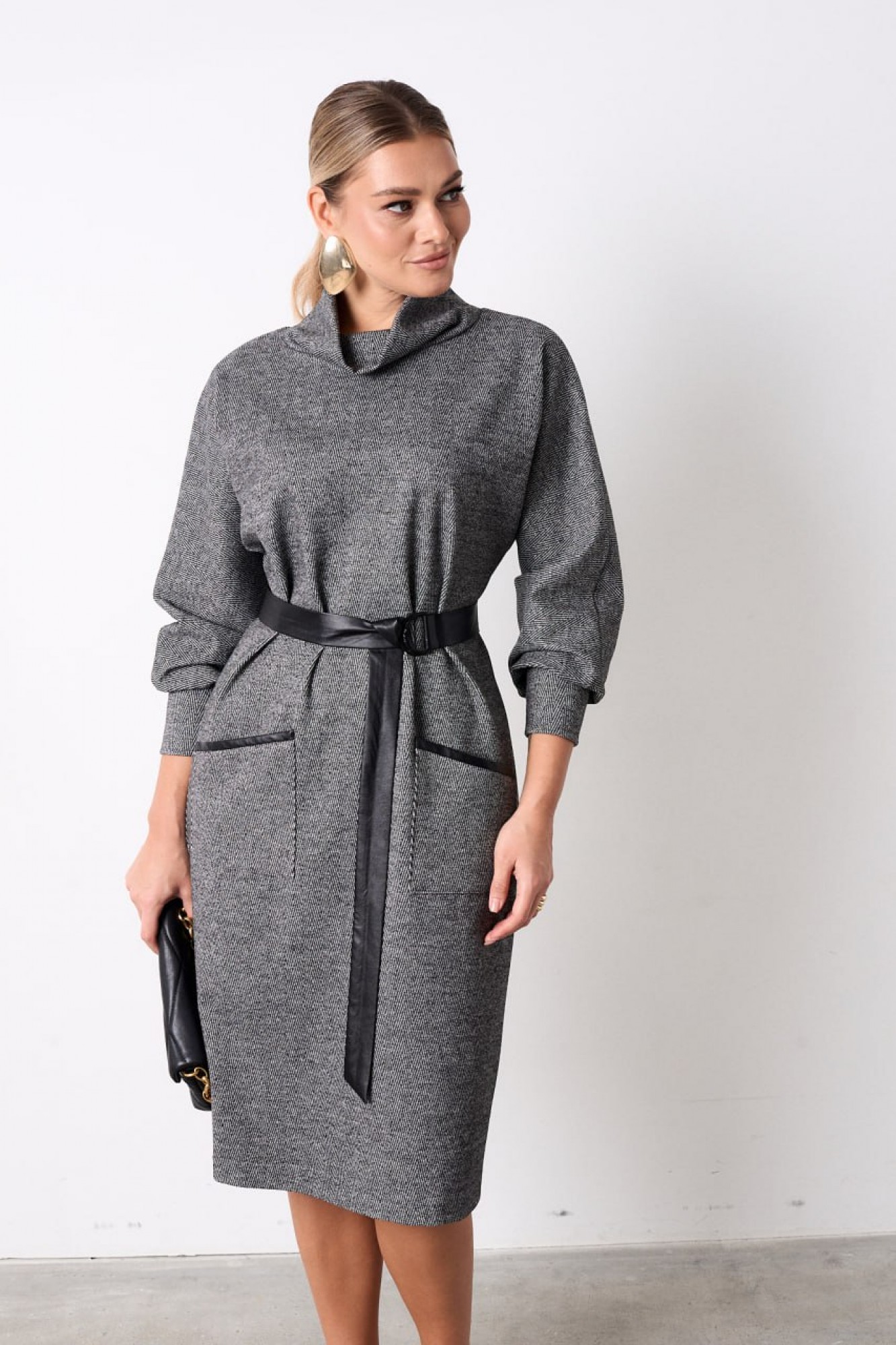 Платье полуприлегающего силуэта из мягкого уютного трикотажа длинной чуть ниже колена. По полочке в области бёдер настрочены накладные карманы с отделкой из кожи. По горловине обработан воротник-хомут. Рукав длинный цельнокроеный, по низу притачная манжета. Платье дополнено съемным поясом из кожи фиксирующимся на пряжку протяжку.