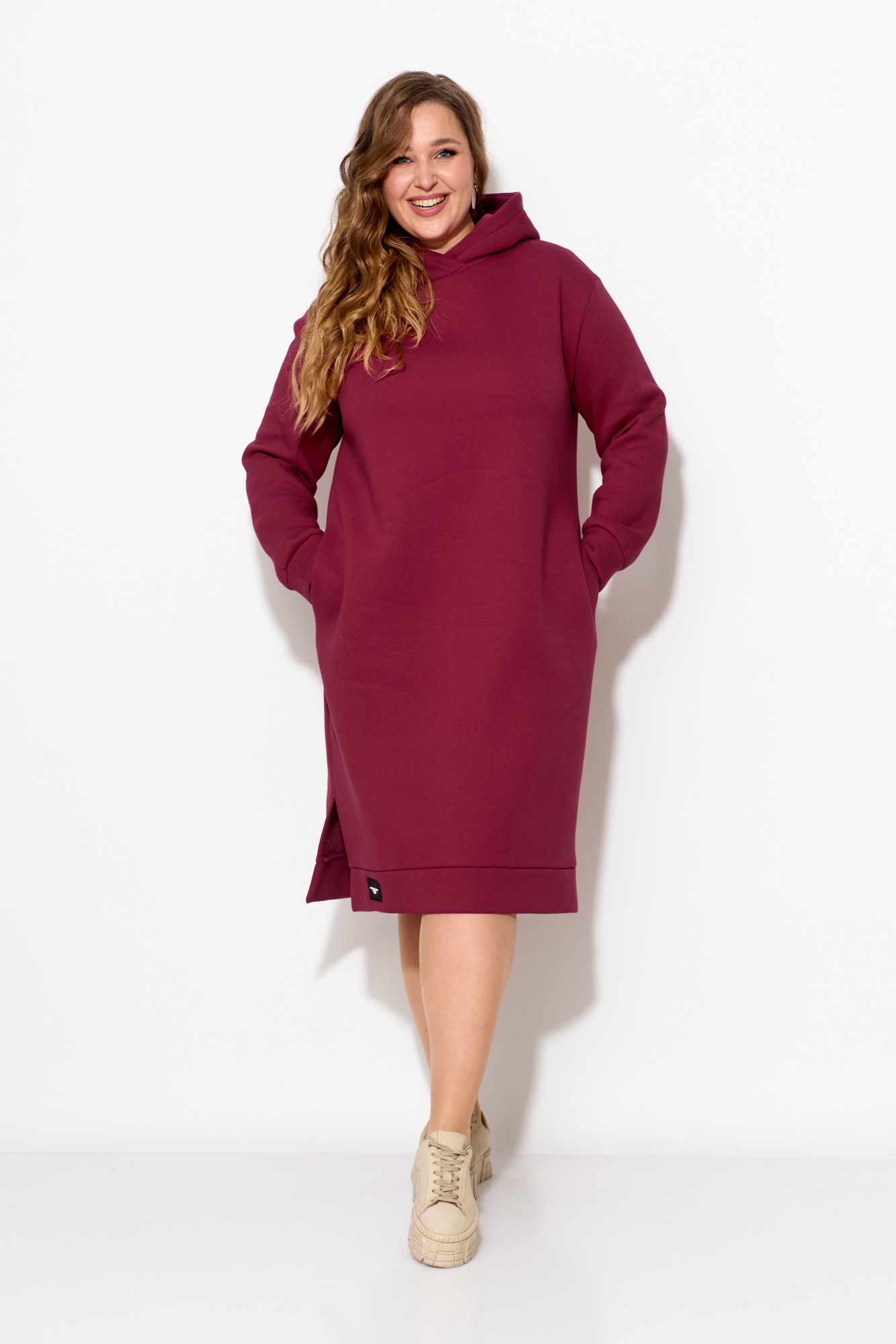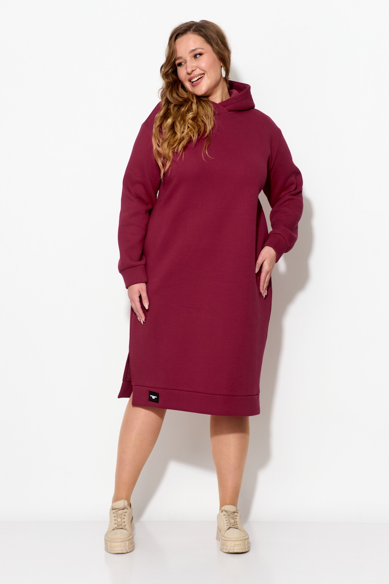Очень теплое женское платье из футера с начесом прямого силуэта длиной за колено согреет Вас в холодную погоду. Рукав со спущенным плечом на манжете. По низу платья идет отрезной пояс с декоративной нашивкой, сбоку разрез. По бокам - карманы. По горловине - двойной капюшон. Данная модель прекрасная покупка на зимний сезон.