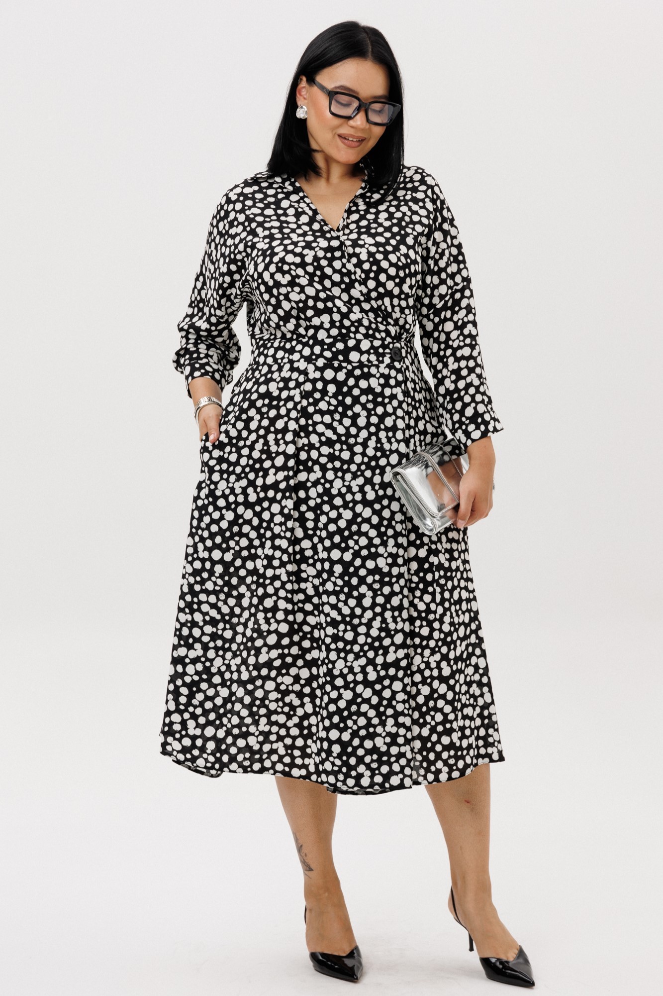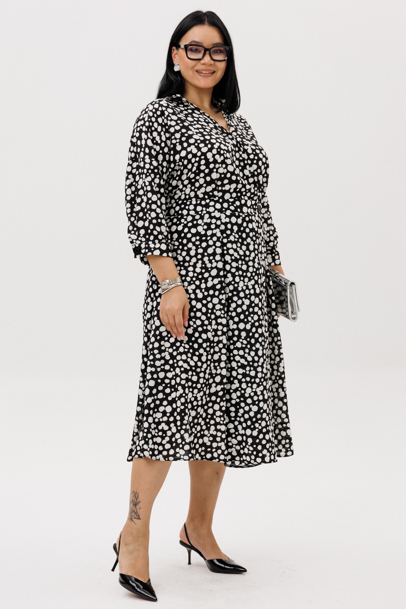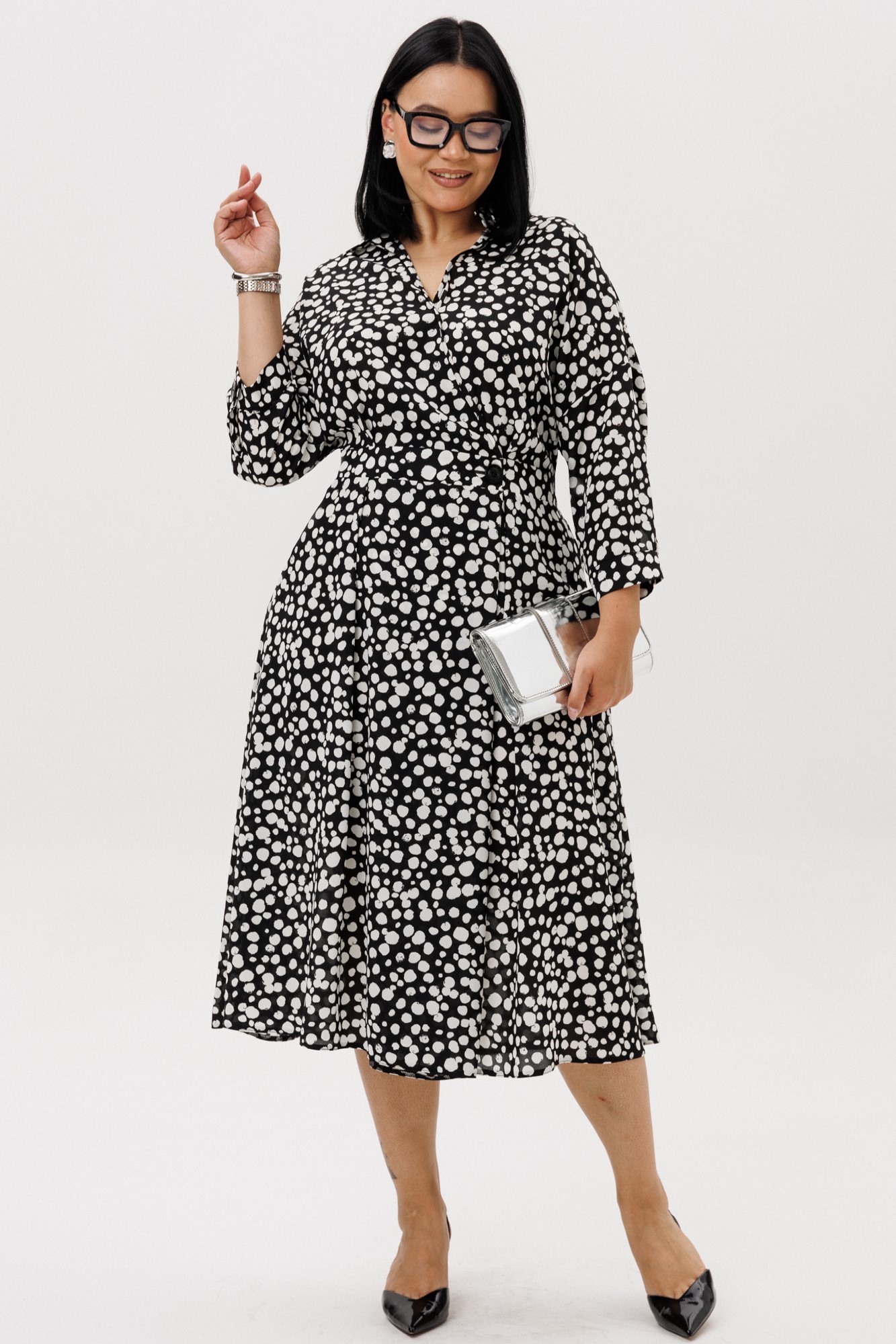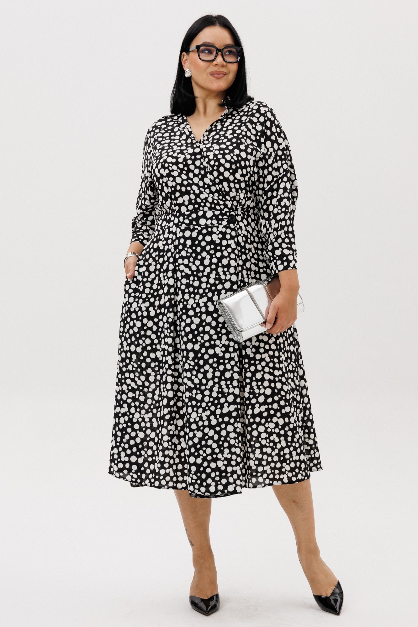 Элегантное женское платье необычного кроя станет изюминкой вашего гардероба. Платье полуприлегающего силуэта, отрезное по линии талии со спущенным плечом. Рукав 3/4 длинный на отрезной манжете. По полочке идут защипы-складки в верхней и нижней частях, запах - на петли и пуговицы по подрезу. По нижней части платья запах идет в виде складки. По спинке кокетка со складкой, по подрезу вставлена резинка. Юбка-полусолнце с односторонними складками по полочке, по бокам карманы. По горловине воротник на отрезной стойке. Платье будет идеально смотреться с туфлями, ботинками и сапогами.
