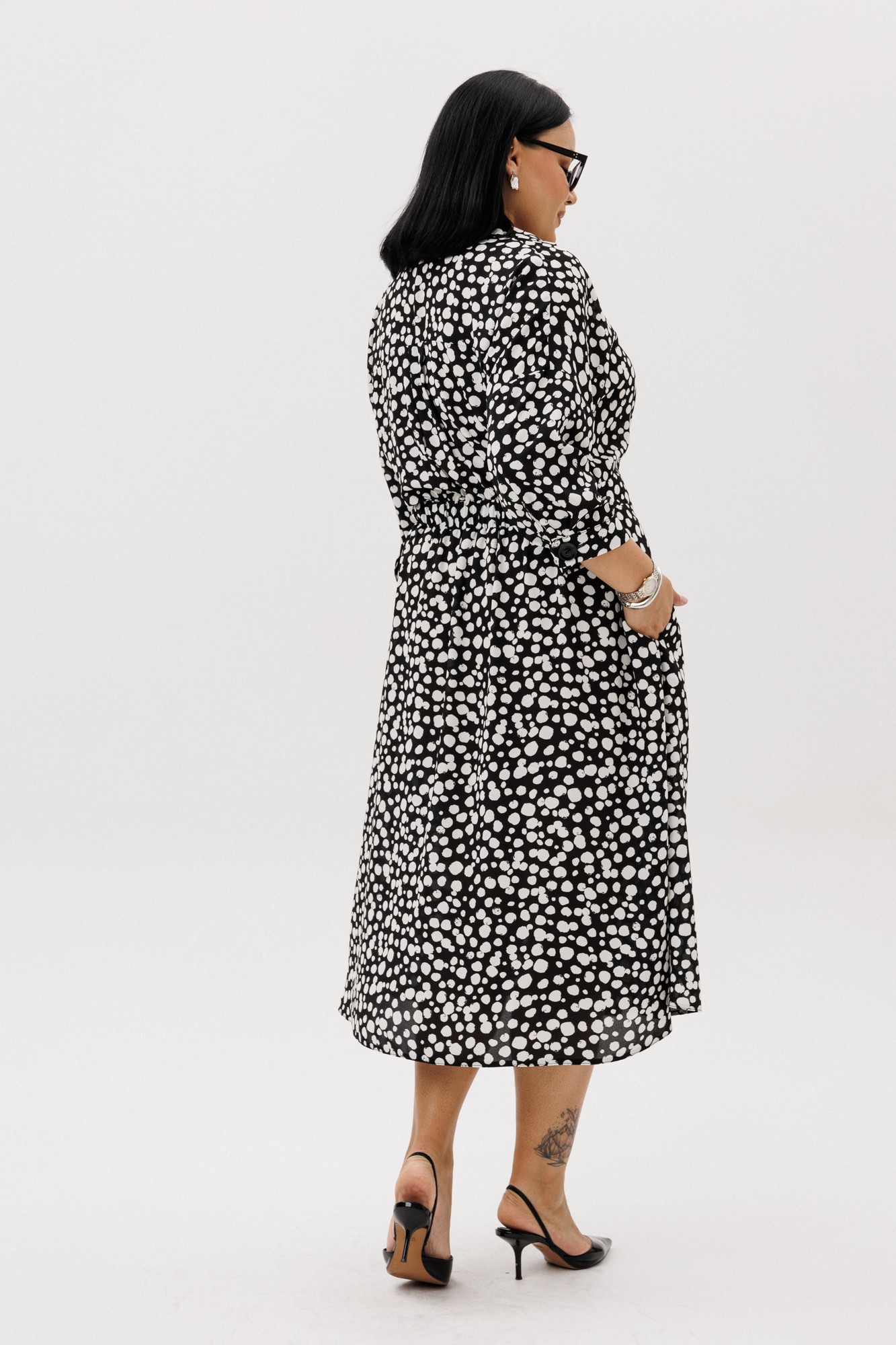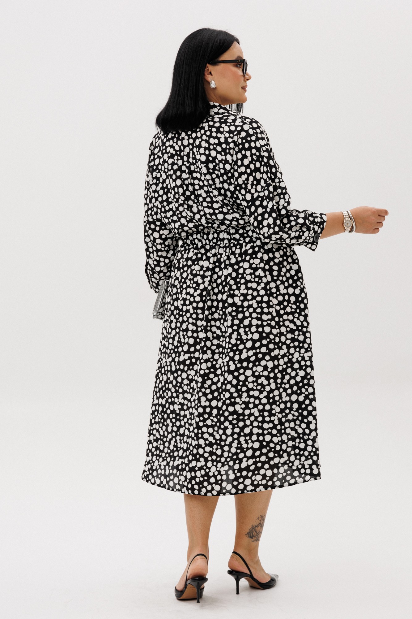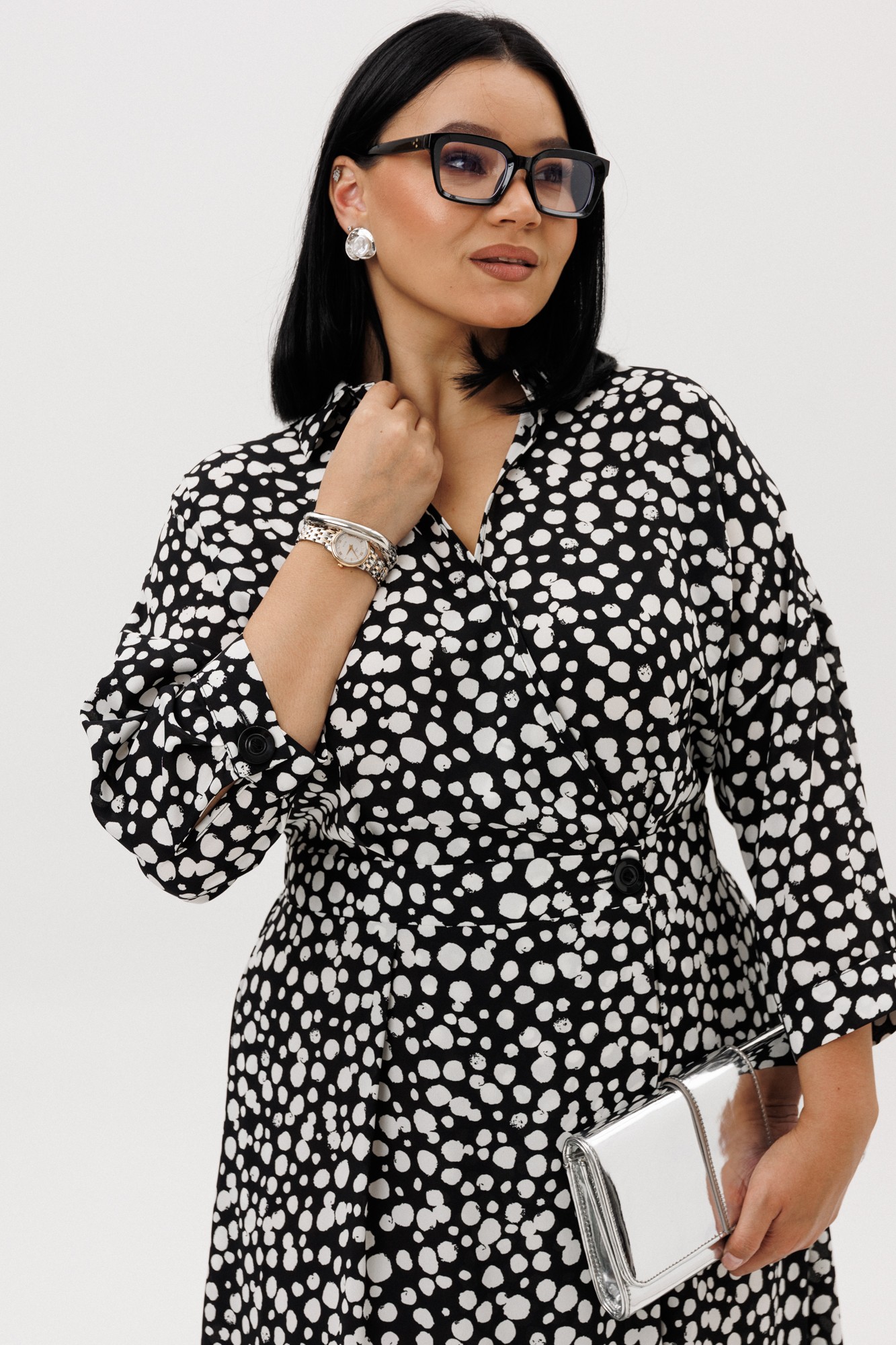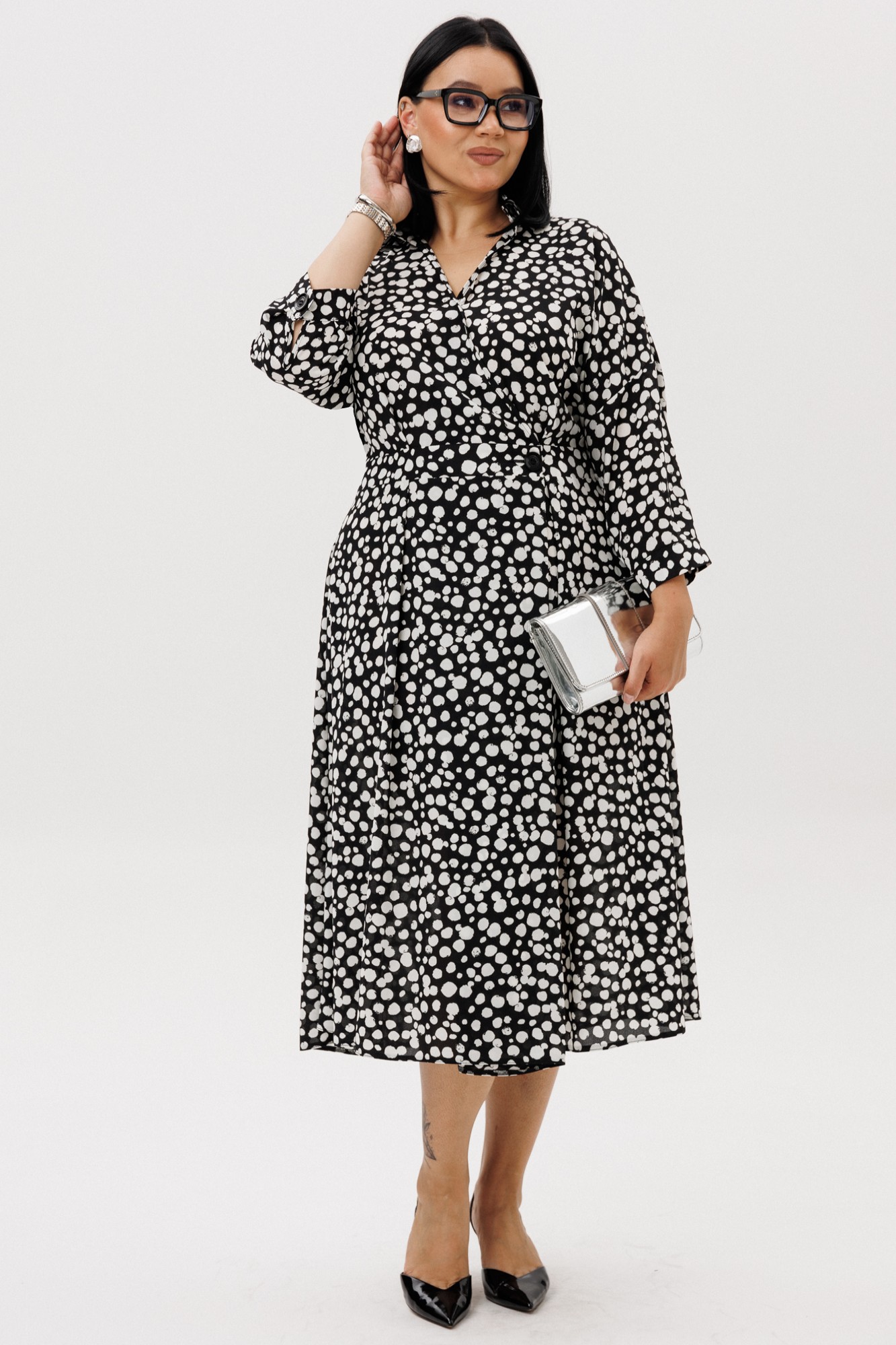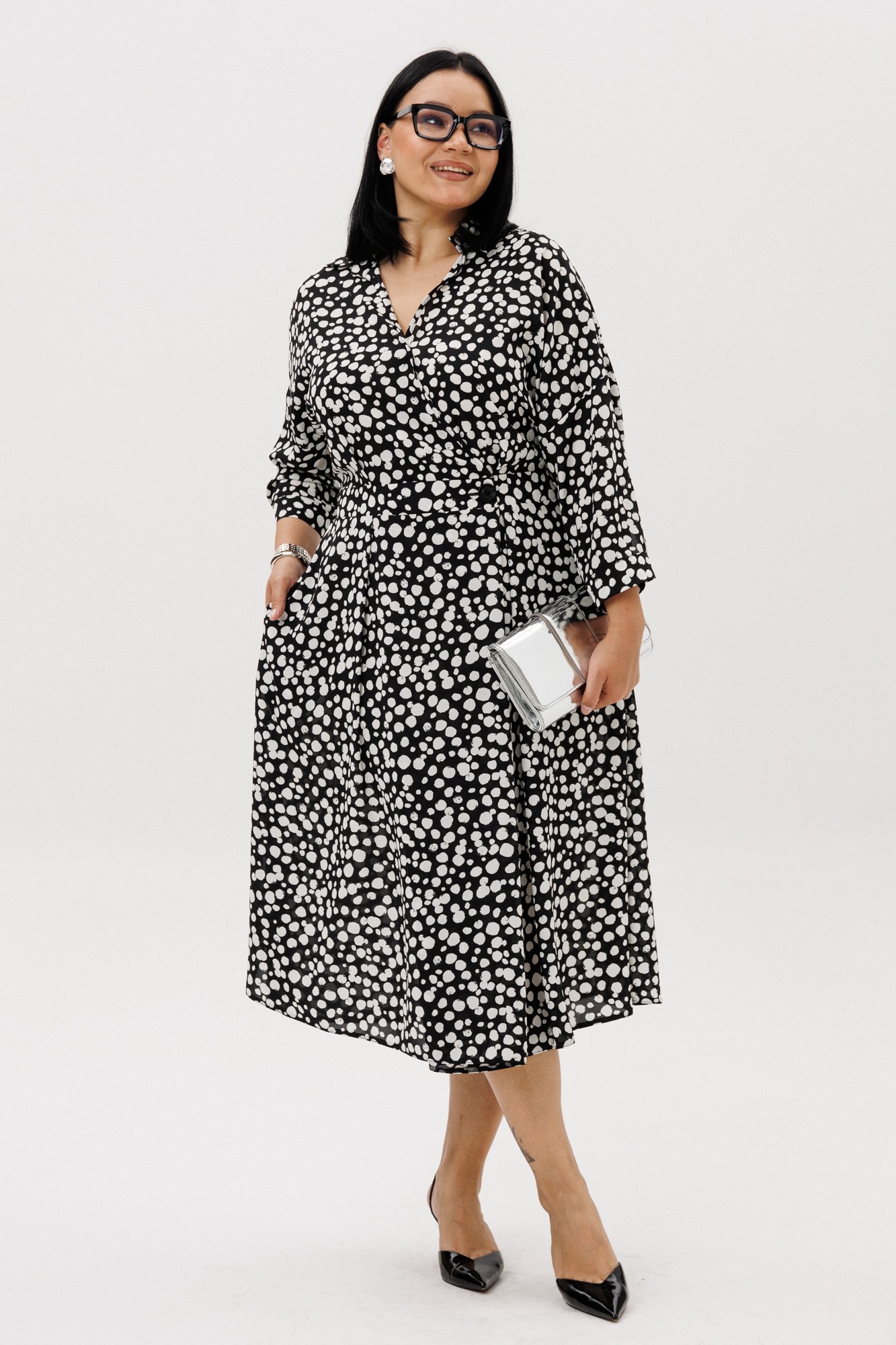 Элегантное женское платье необычного кроя станет изюминкой вашего гардероба. Платье полуприлегающего силуэта, отрезное по линии талии со спущенным плечом. Рукав 3/4 длинный на отрезной манжете. По полочке идут защипы-складки в верхней и нижней частях, запах - на петли и пуговицы по подрезу. По нижней части платья запах идет в виде складки. По спинке кокетка со складкой, по подрезу вставлена резинка. Юбка-полусолнце с односторонними складками по полочке, по бокам карманы. По горловине воротник на отрезной стойке. Платье будет идеально смотреться с туфлями, ботинками и сапогами.