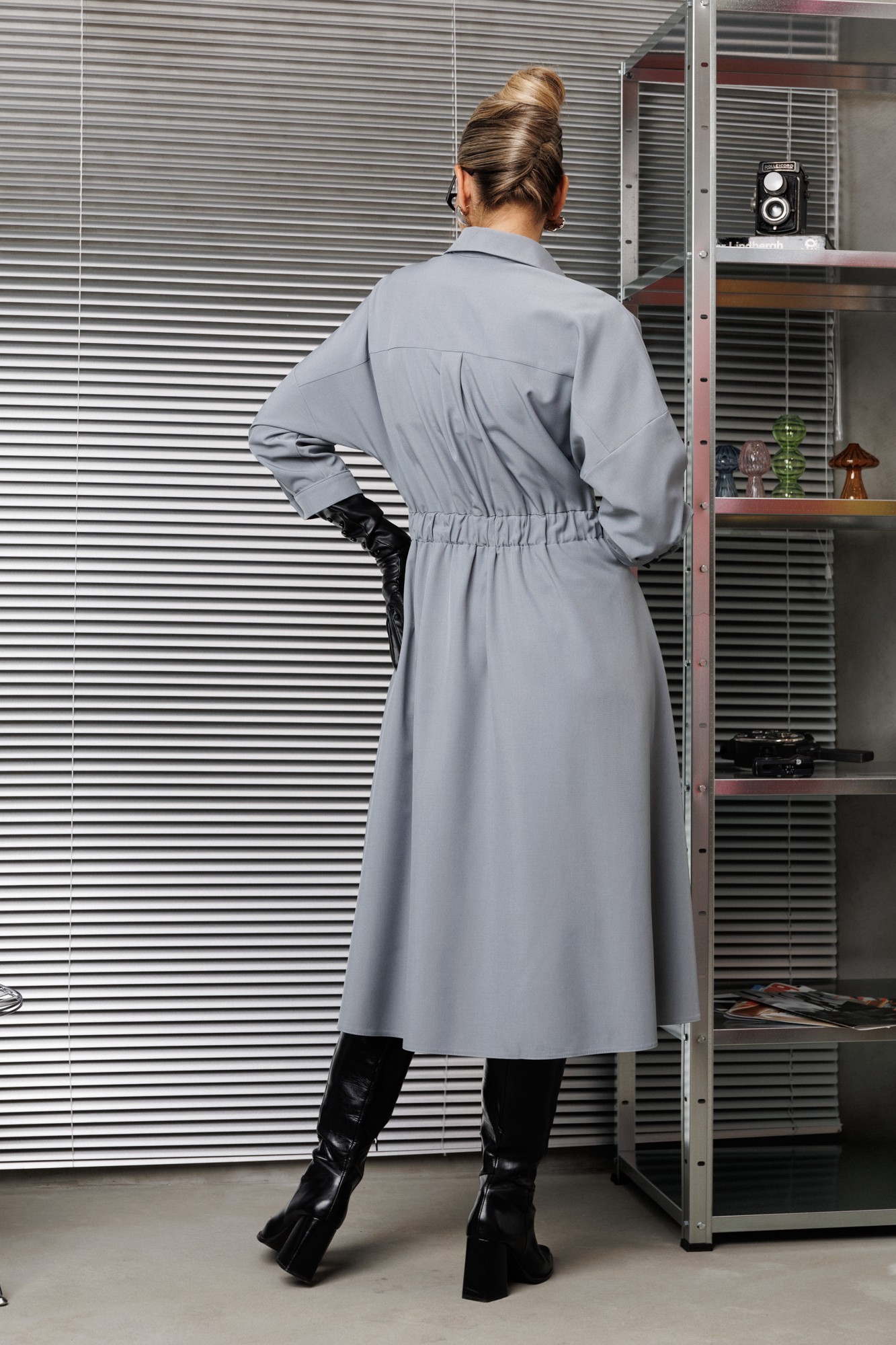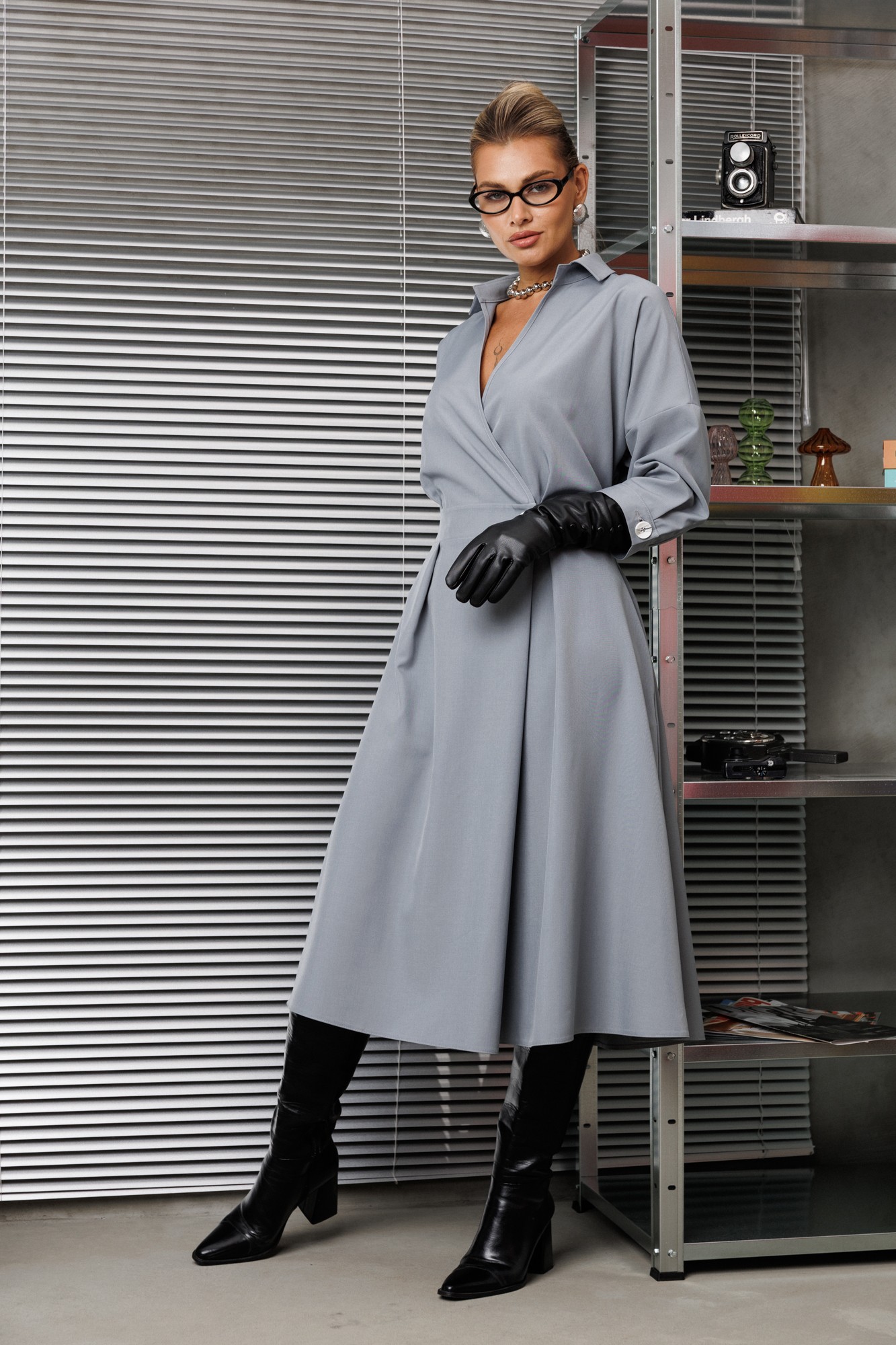 Элегантное женское платье из костюмной ткани необычного кроя станет изюминкой вашего гардероба. Платье полуприлегающего силуэта, отрезное по линии талии со спущенным плечом. Рукав 3/4 длинный на отрезной манжете. По полочке идут защипы-складки в верхней и нижней частях, запах - на петли и пуговицы по подрезу. По нижней части платья запах идет в виде складки. По спинке кокетка со складкой, по подрезу вставлена резинка. Юбка-полусолнце с односторонними складками по полочке, по бокам карманы. По горловине воротник на отрезной стойке. Платье будет идеально смотреться с туфлями, ботинками и сапогами.