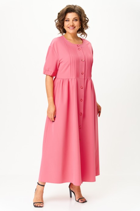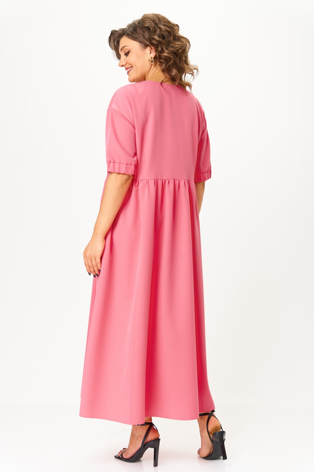 Платье свободного силуэта, длиной макси, выполнено из однотонной ткани. Платье с отрезным лифом и с центральной застежкой на петли и пуговицы. Полочка лифа с нагрудными вытачками и вертикальными защипами, горловина круглой формы с притачной планкой. Спинка с таллиевыми вытачками. Пройма углубленной формы. Рукав рубашечного типа, одношовный, длиной до локтя. По низу рукава обработана притачная манжета с эластичной тесьмой. Юбка платья с вертикальными рельефами по передней и задней частям, со сборкой по шву притачивания к лифу. В боковых швах обработаны прорезные карманы.