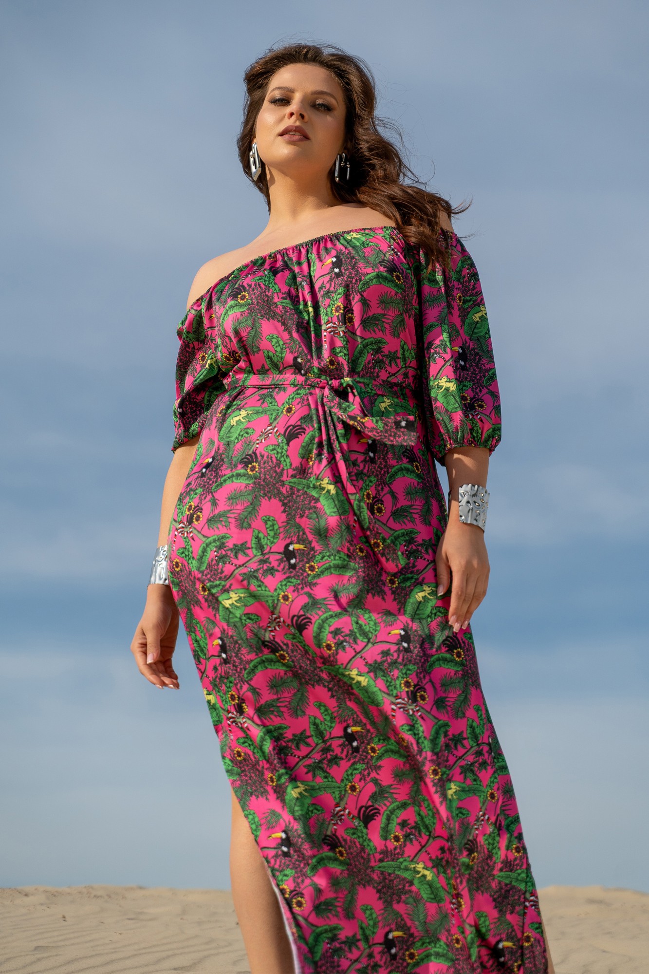 Платье из принтованной ткани, ткань с эффектом шёлка, легкое и очень комфортное, прямого силуэта, приятное к телу, со съёмным поясом. Рукава 3/4, низ рукавов на резинке. В боковых швах обработаны карманы и разрезы. Вырез горловины с эластичной тесьмой, что позволяет носить платье и на плечах, и со спущенными плечами. Принт на ткани платья яркий модный, в таком платье вы будите неотразимы.