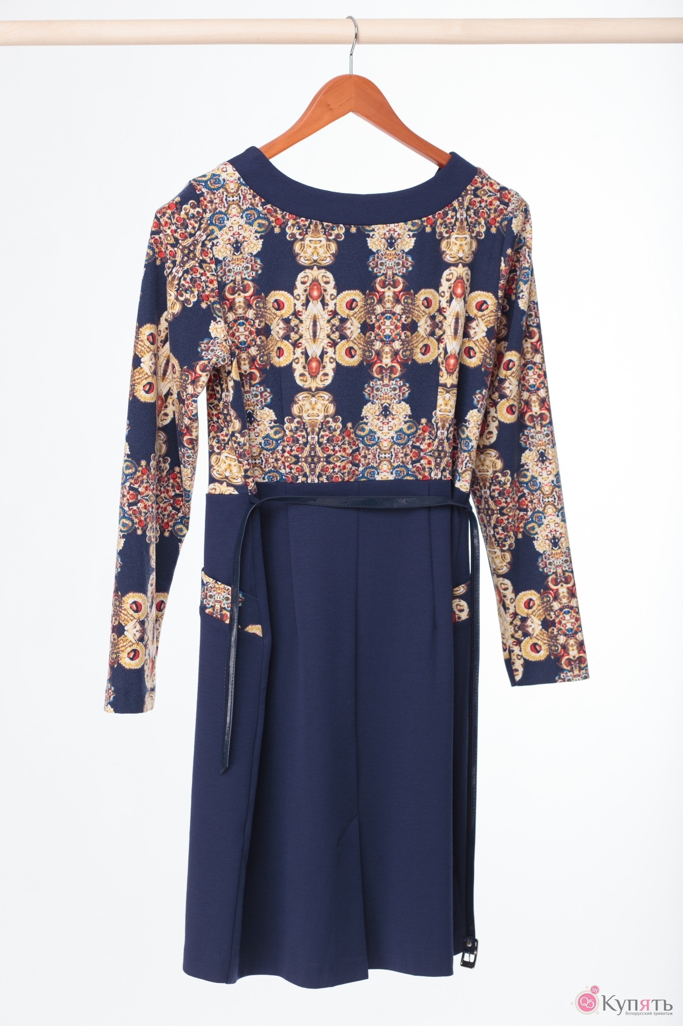 Теплое платье, карманы и съемный пояс. Отрезное по линии талии. Ткань-трикотаж. Хорошо тянется. Представлено в двух расцветках: синий с белым и синий с желтым принтами.