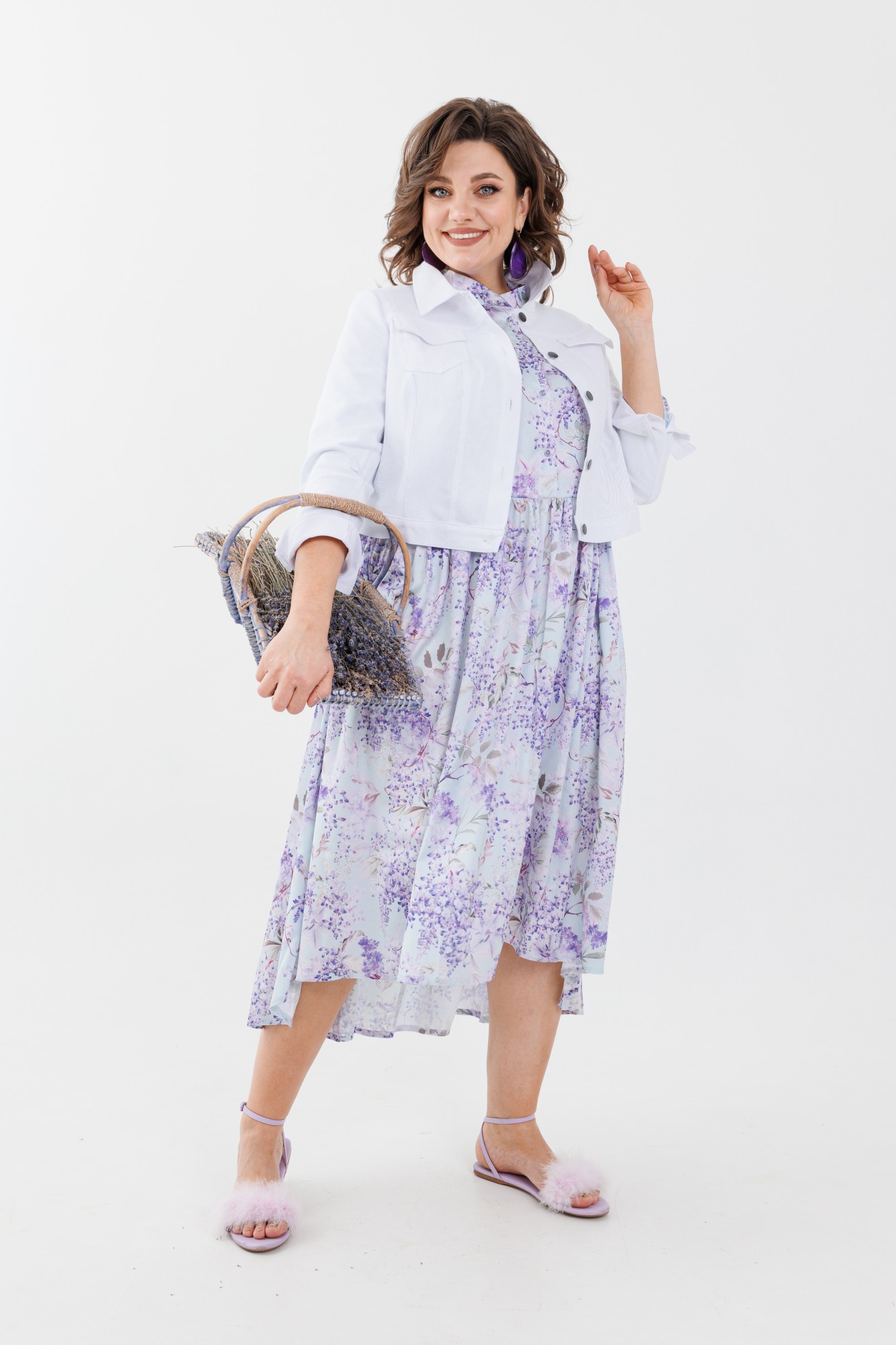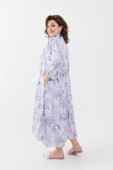 Платье женское, оверсайз силуэта, длина ниже колена по переду, спинка длиннее. Рукав втачной со сборкой по окату, низ на резинке, длина 3/4. Горловина обработана стойкой. По переду нагрудные вытачки и планка на петли пуговицы до линии талии. Платье отрезное по линии талии, юбка на сборке. Платье актуально, как для ежедневной носки, так и для романтических вечеров.