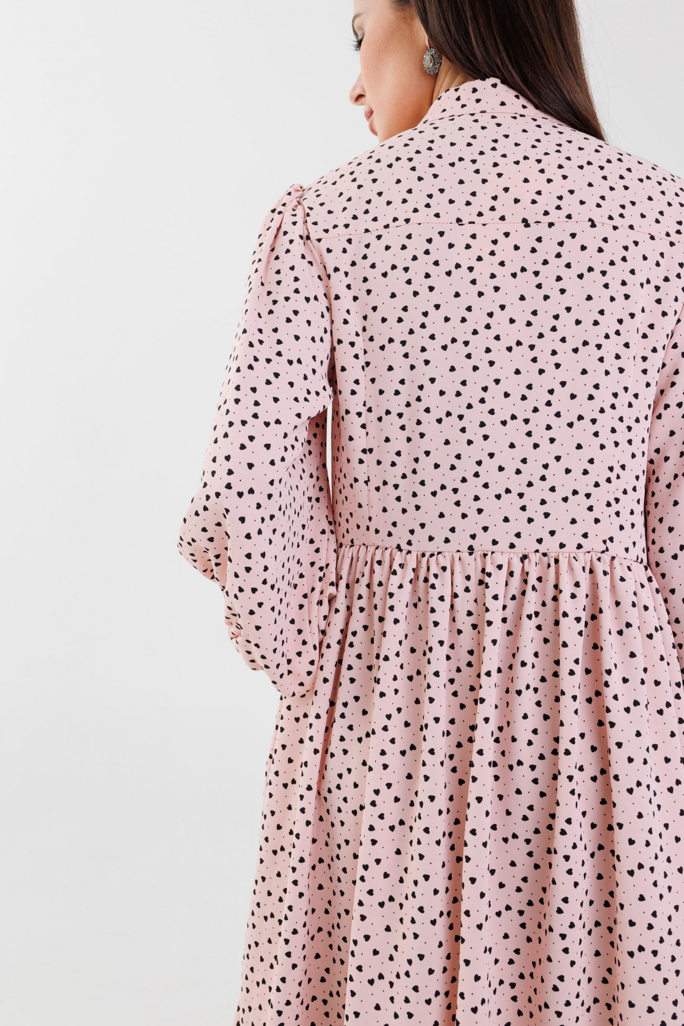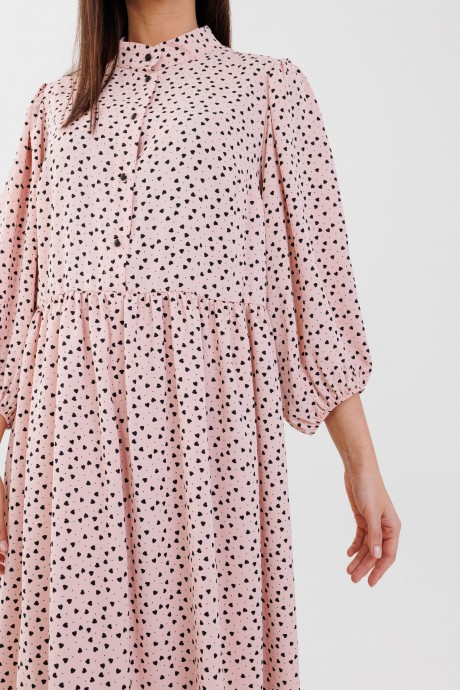 Платье женское, оверсайз силуэта, длина ниже колена по переду, спинка длиннее. Рукав втачной со сборкой по окату, низ на резинке, длина 3/4. Горловина обработана стойкой. По переду нагрудные вытачки и планка на петли пуговицы до линии талии. Платье отрезное по линии талии, юбка на сборке. Платье актуально, как для ежедневной носки, так и для романтических вечеров.