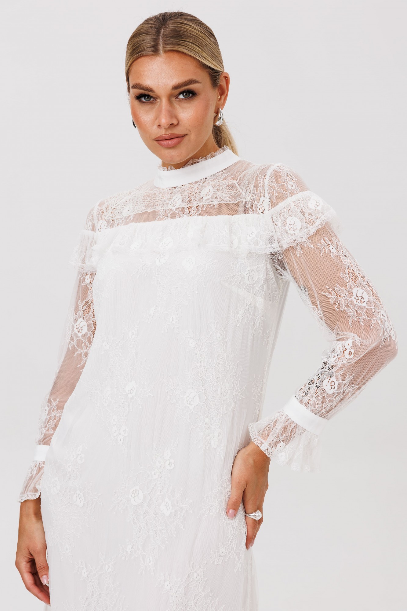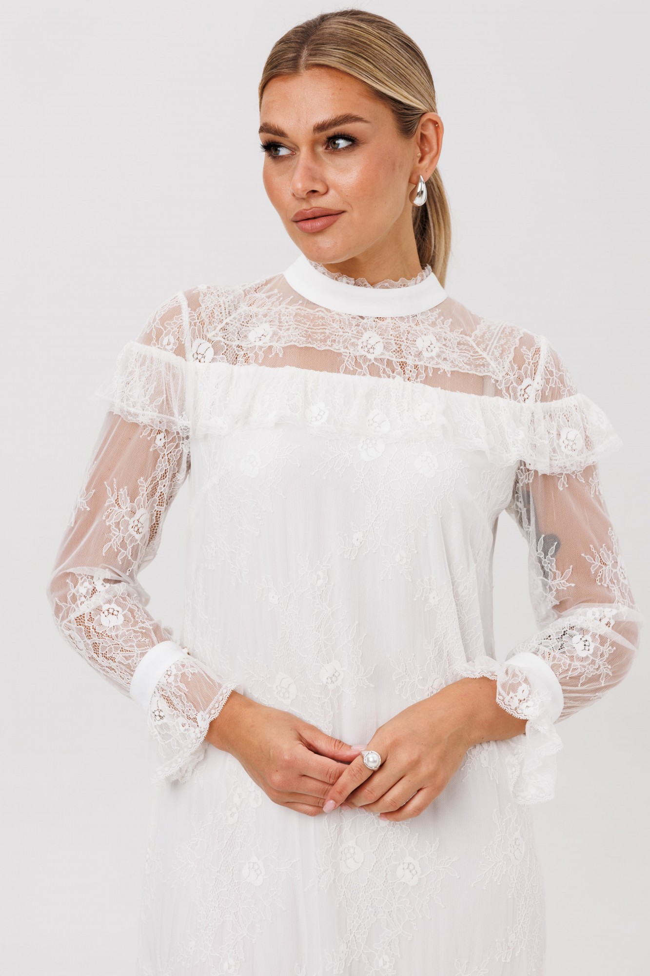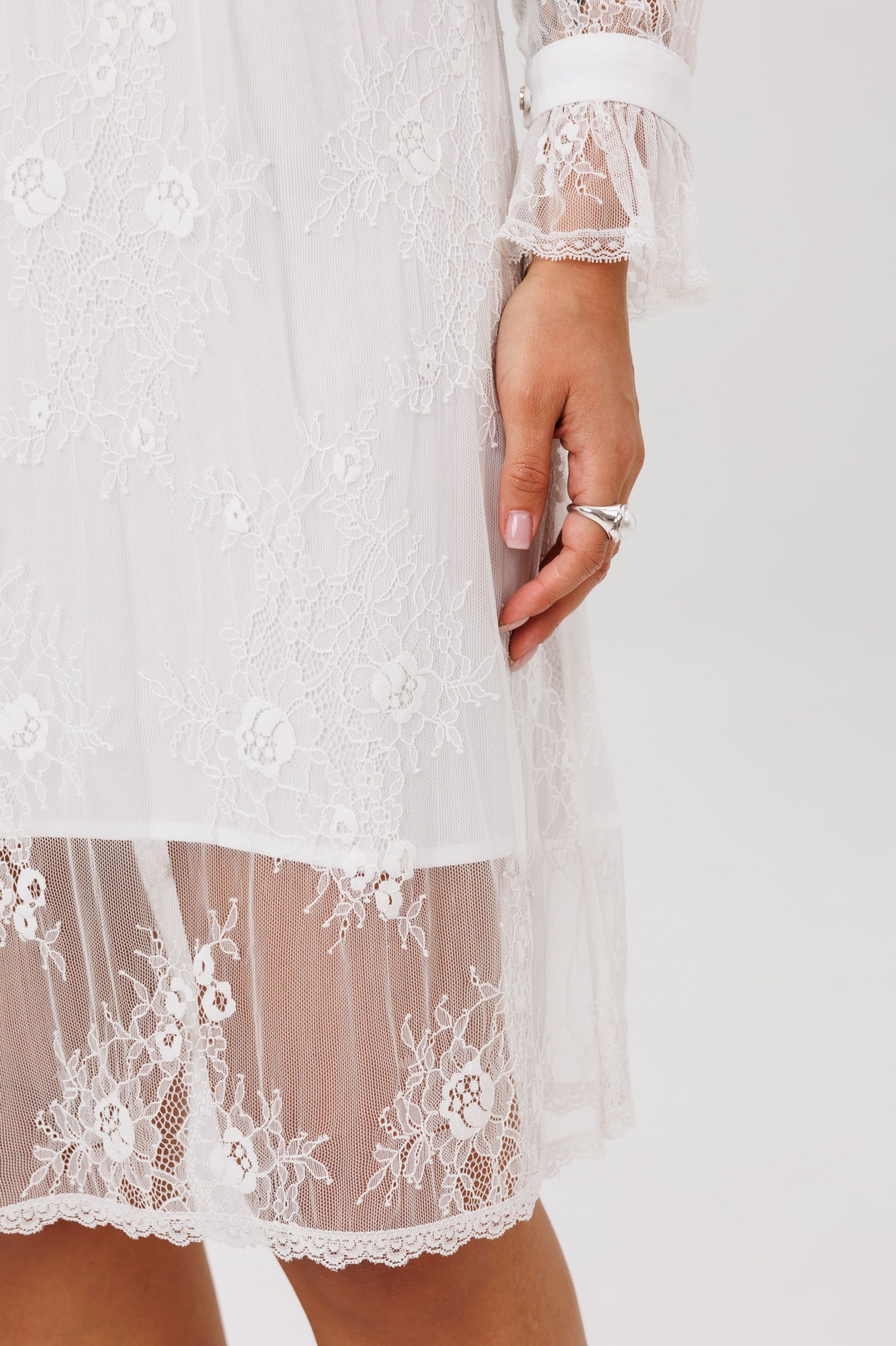 Это платье, сотканное из воздуха и тончайших нитей. Нежное кружевное полотно, подобно легкой дымке, обволакивает силуэт, заключая его в элегантные и строгие линии прямого кроя. Изысканность кроется в деталях: кокетки, украшающие лиф спереди и сзади, мягко ниспадают изящными волнами, подчеркивая линию плеч и даря образу трогательную, почти что хрупкую грацию.