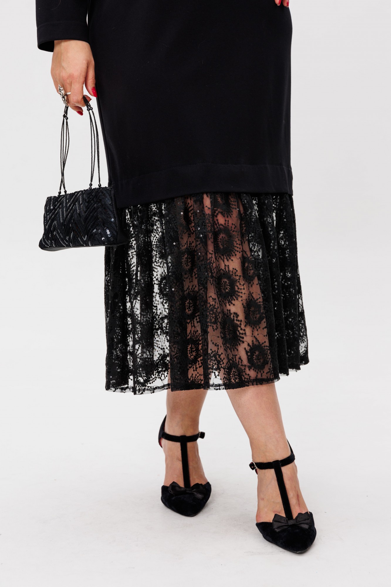 Изысканный дизайн сочетает в себе сдержанную мягкость и легкость в виде отделки низа юбки гипюром, добавляя нотку игривости и романтики, делая платье особенно привлекательным.