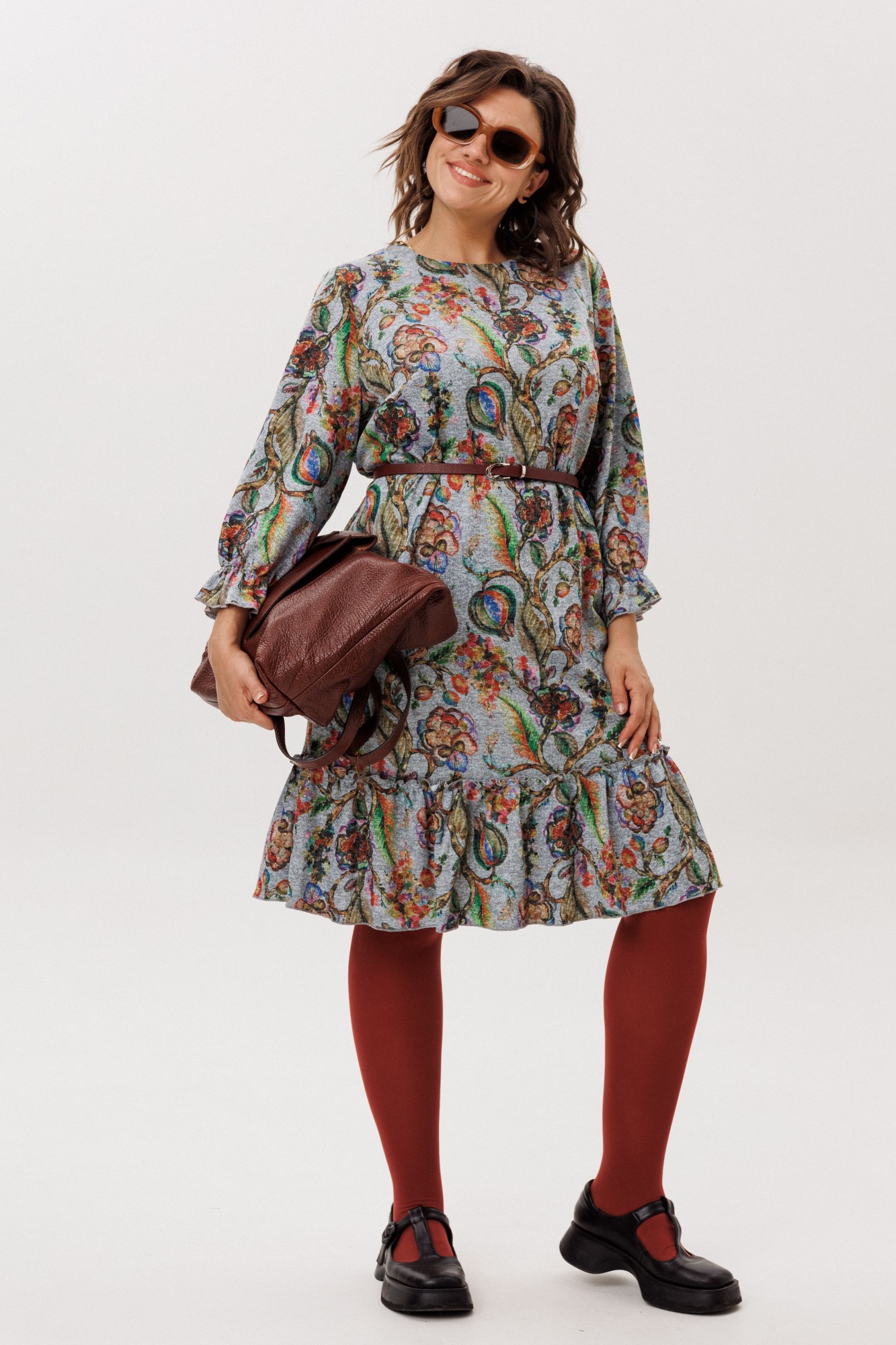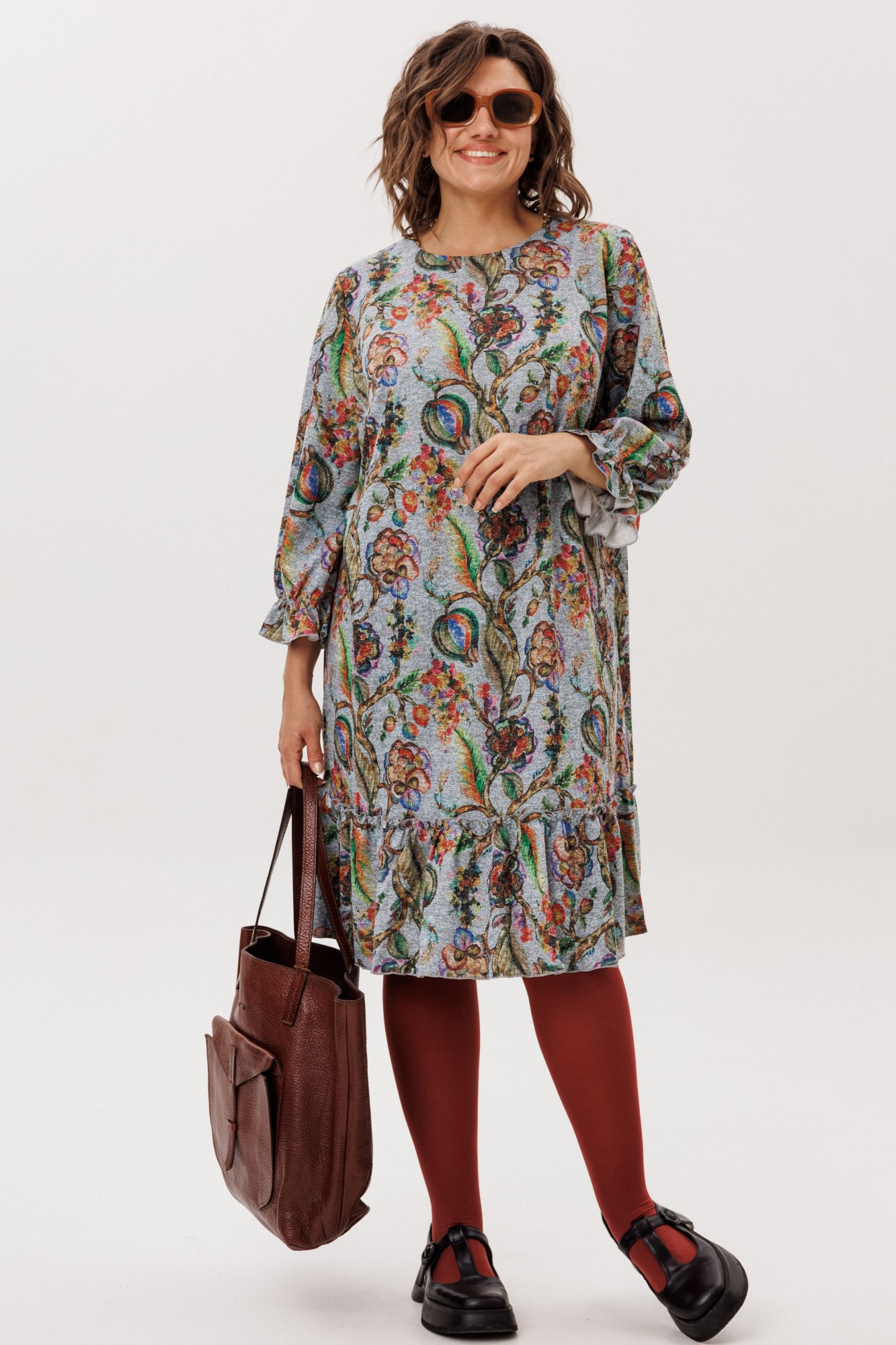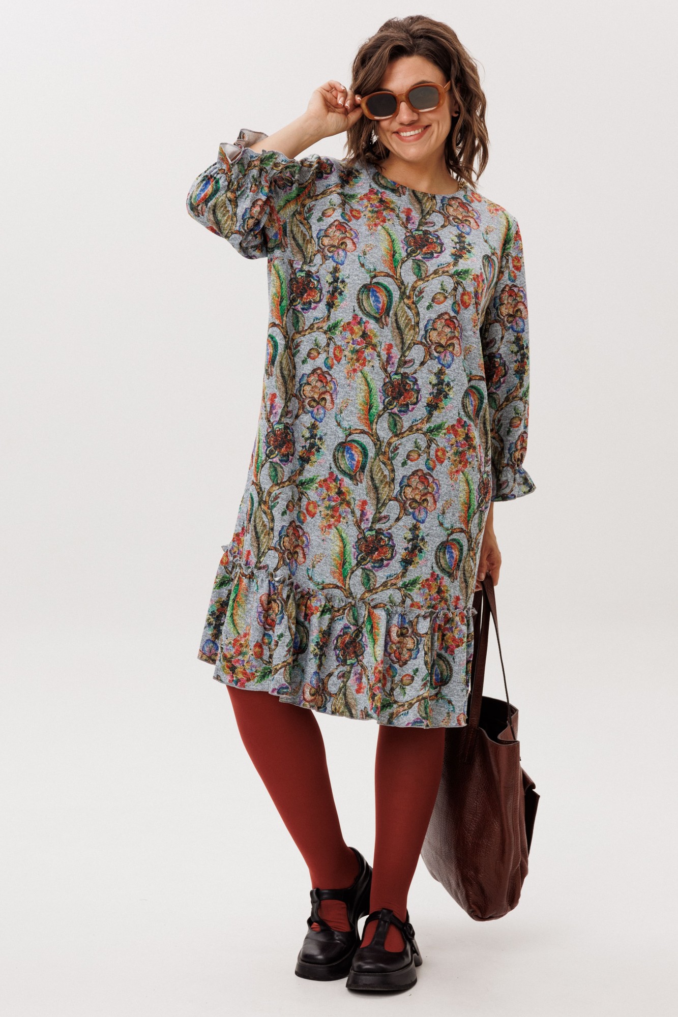 Трикотажное платье прямого кроя, украшенное ярким акварельным принтом, гарантированно станет центром внимания. Укороченные рукава, собранные на резинке, сочетают практичность с изящным акцентом на запястье. Круглый вырез горловины мягко обрамляет шею, а низ платья, оформленный притачным воланом, придает всему образу летящую, воздушную легкость.