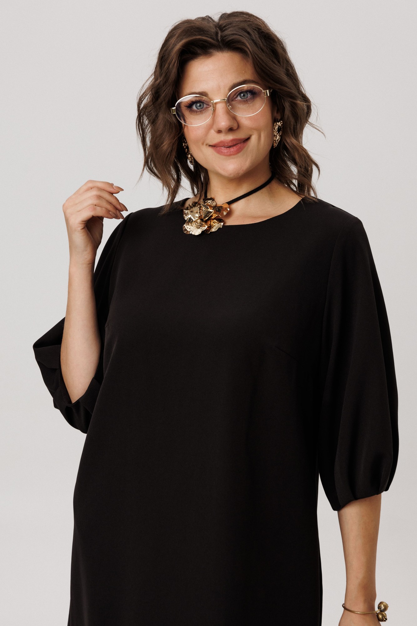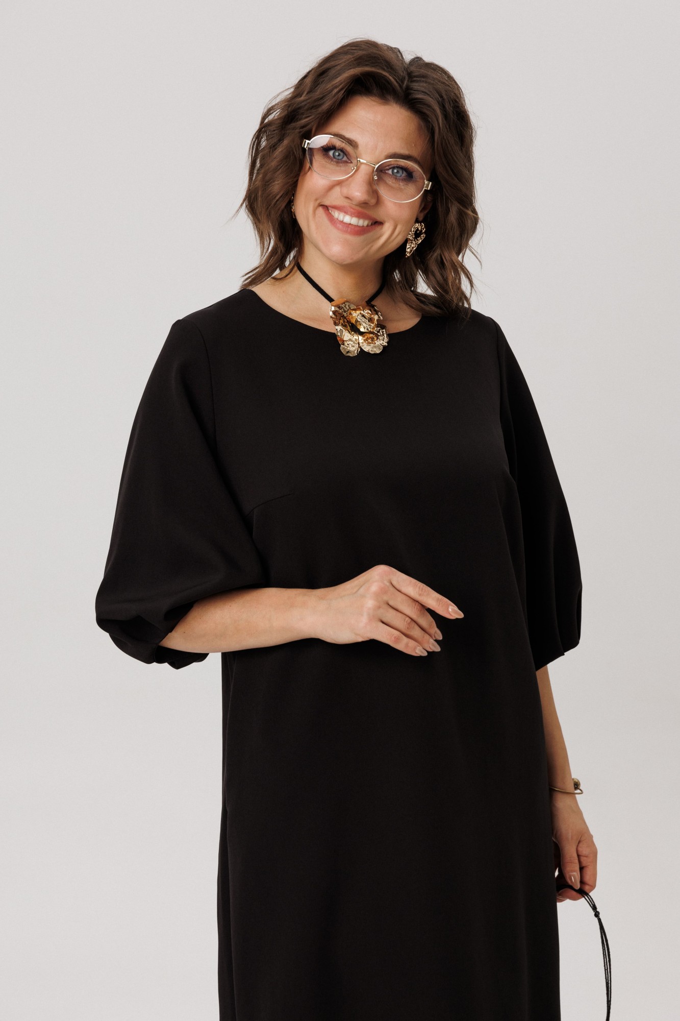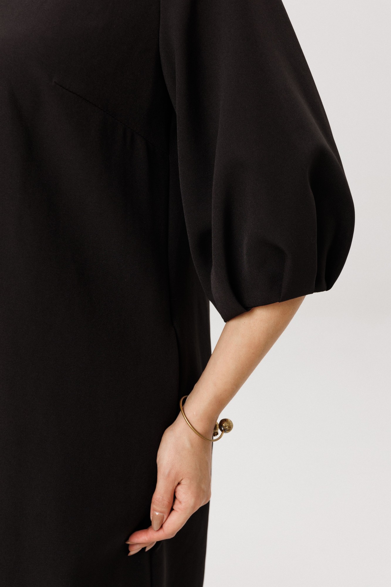 Мягкий рукав платья украшен у запястья изящной сборкой, придающей образу лёгкость и утончённость. Идеальная длина, прикрывающая колени, создана для повседневного комфорта, сохраняя при этом элегантность силуэта.