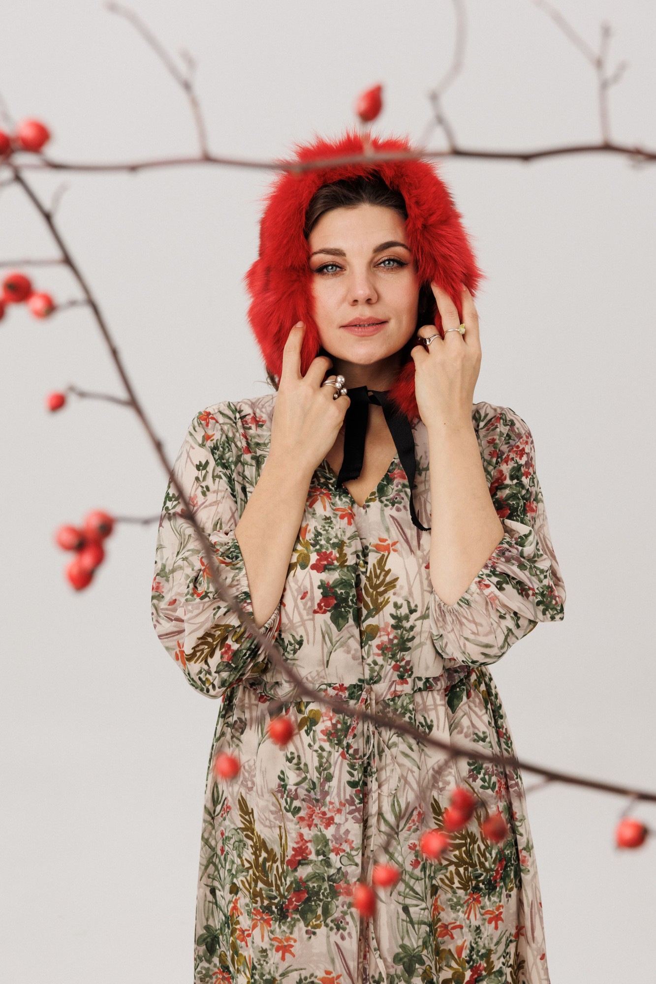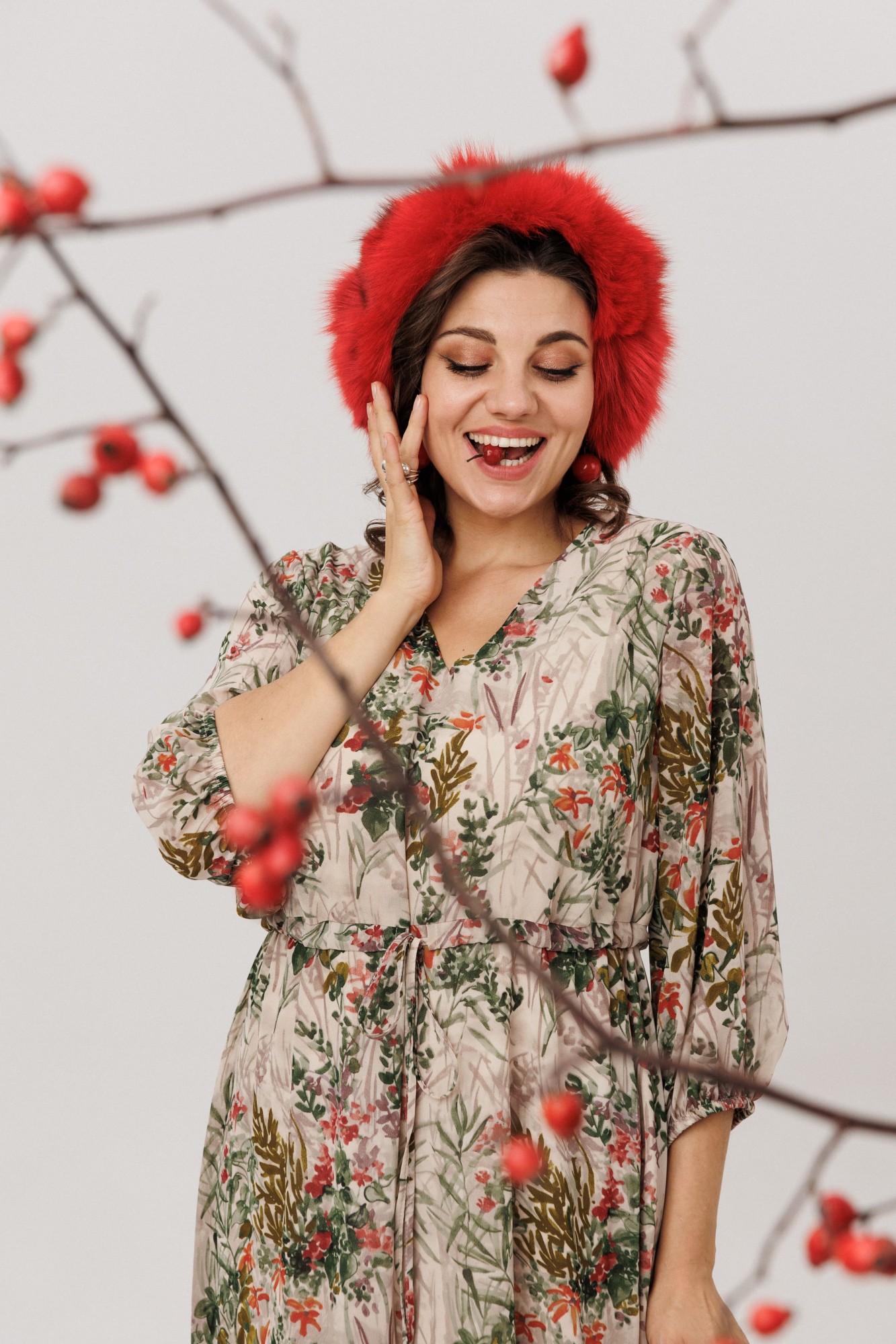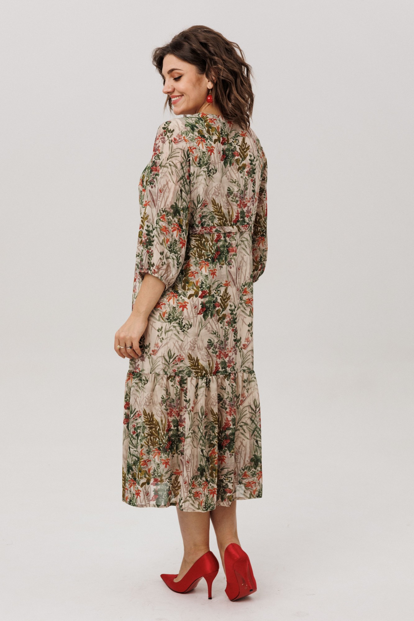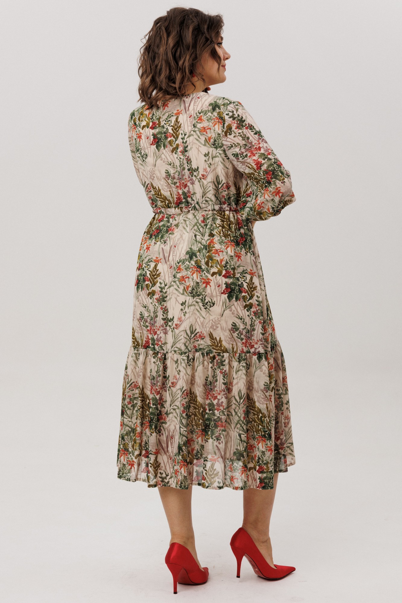 Это платье - олицетворение воздушной грации, где четкий крой встречается с игрой лёгкой ткани. Его основа - изящный А-силуэт, который рождается от завышенной линии талии. Отсюда мягкие складки шифона струятся вниз, расширяясь подобно нежному лепестку, даря фигуре и свободу, и утончённую форму. Глубокий V-образный вырез у горловины служит элегантным акцентом, вырезающим строгий и женственный контур. Рукава, укороченные до трёх четвертей, приобретают особую выразительность: мягко расширяясь от локтя, они завершаются нежным сбором на тонкой резинке, создавая у запястья лёгкий, поэтичный объём, который трепещет при каждом движении руки. Всю эту лёгкость мудро собирает и укрощает скрытая кулиска, позволяя идеально обозначить линию талии, в то время как подкладка бережно скрывает прозрачность шифона, оставляя лишь игру фактуры и цвета. А венчает образ волан, бегущий по всему низу подола. Он не просто окаймляет платье от Анелли - он приводит его в движение, заставляя край колыхаться собственной, едва слышной волной. Это платье в цвете «кремовая виола» для дня, когда хочется чувствовать себя прекрасной без всякого повода - и для того случая, когда повод требует безупречности.