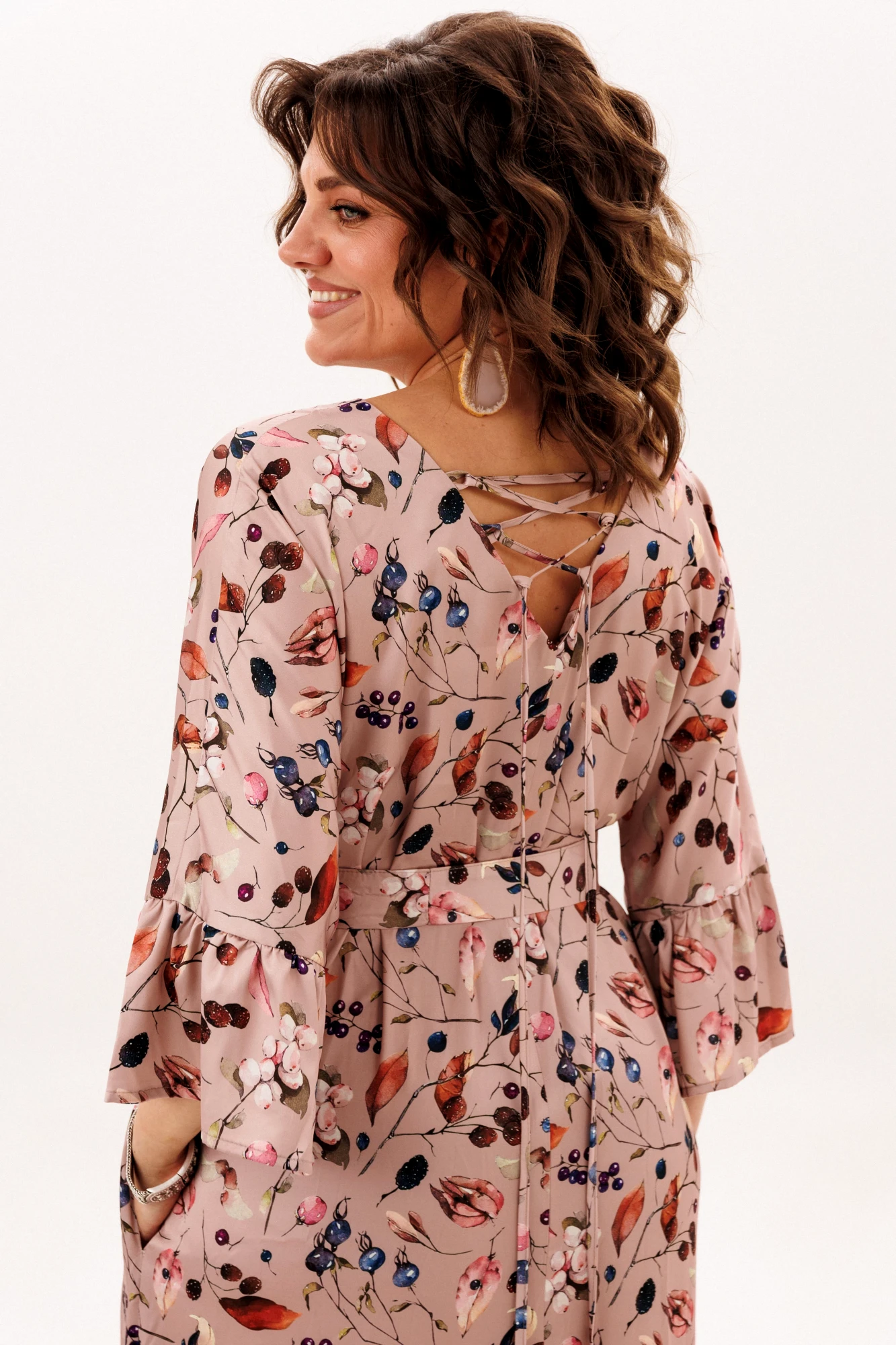 Тонкая, нежная ткань с принтом «листья и ягоды» словно обволакивает тело, даря ощущение легкости и свободы движений, в таком платье хочется кружиться, шутливо игриво расставляя оборки, которые будто отражают настроение и настроение того, кто его носит. Каждый элемент, от шнуровки до воланов, продуман с любовью, создавая гармонию между комфортом и легкой романтичной элегантностью, делая этот образ одновременно воздушным и чувственным.