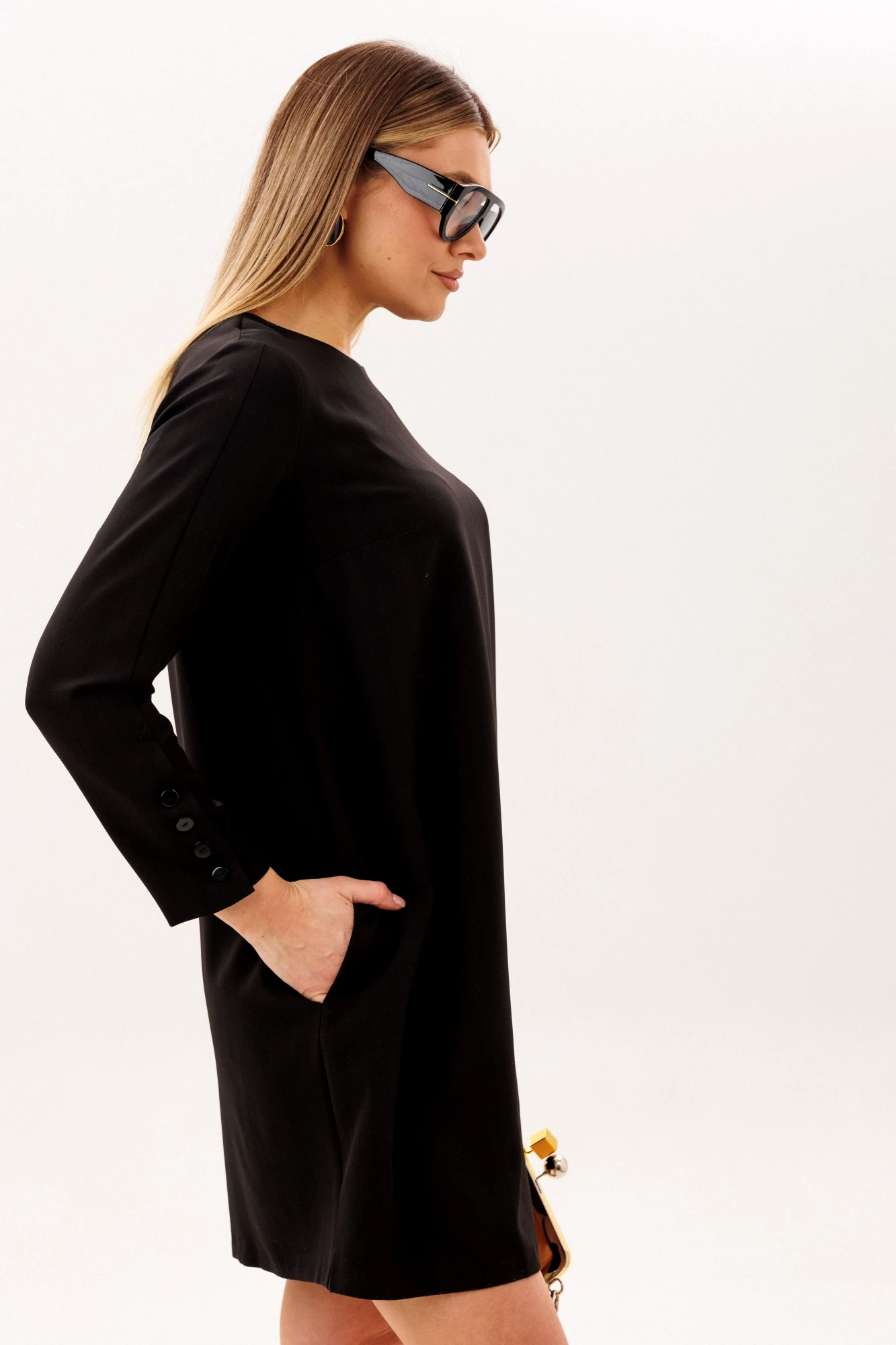 Но главное чудо прячется в воротнике. Он съёмный и двусторонний - маленькая деталь, которая меняет всё. Сегодня он может быть неотъемлемой частью образа, сливаясь с платьем по цвету, завтра - заиграть контрастом, а послезавтра вы решите, что самое красивое - это простота, и оставите горловину открытой. А в боковых швах, словно приятный секрет, спрятаны карманы, куда так удобно прятать руки или мелочи.
