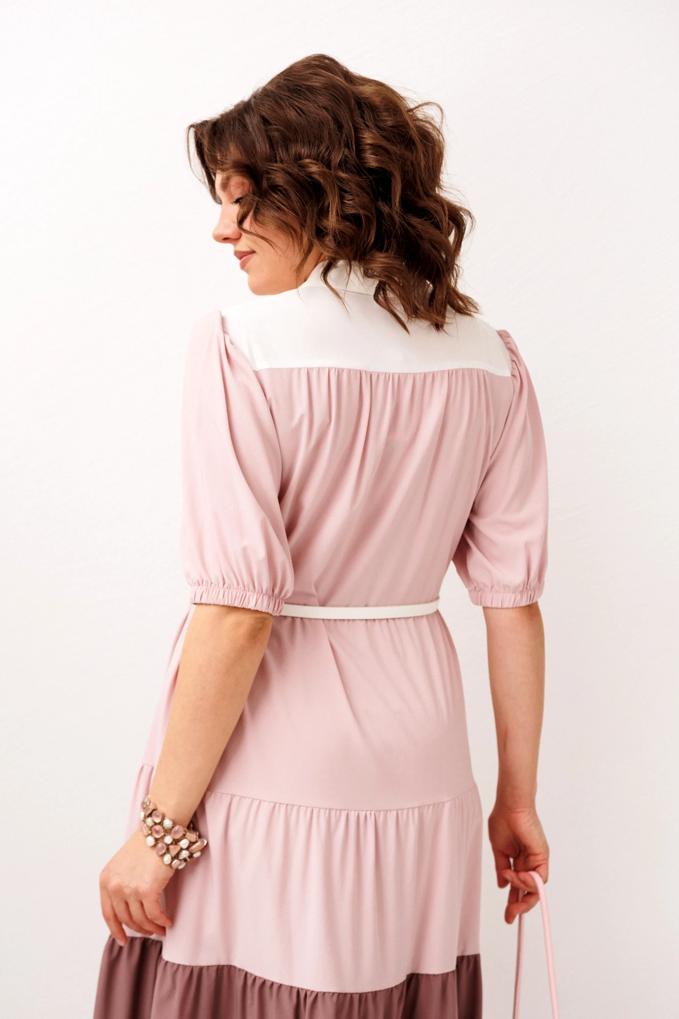 Рубашечный фасон с отрезной талией формирует женственный силуэт, а длина миди добавляет образу спокойной элегантности и утончённости. Классический рубашечный воротник придаёт аккуратность линиям, в то время как рукава 3/4 на резинке создают лёгкий объём и мягкость, делая образ более живым и деликатным.