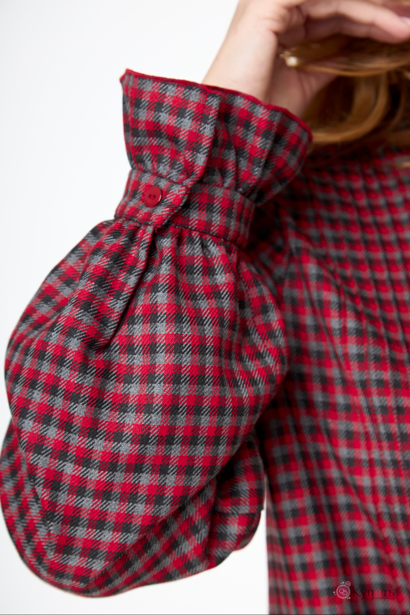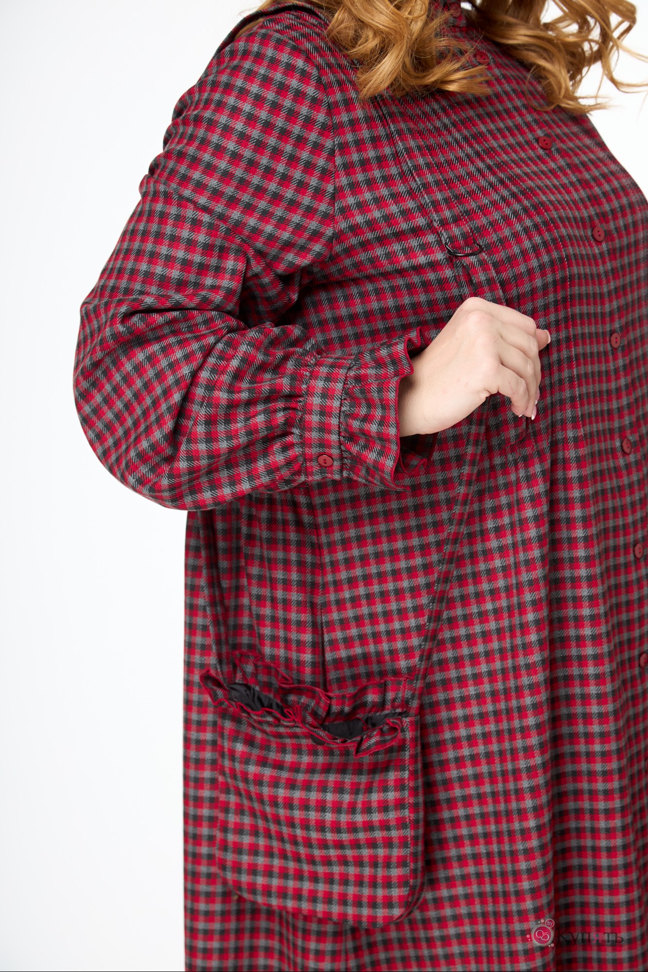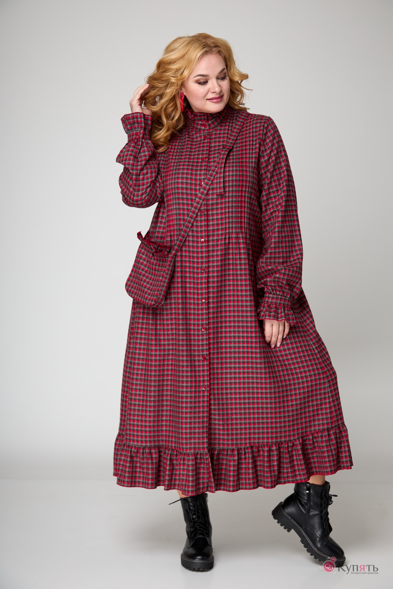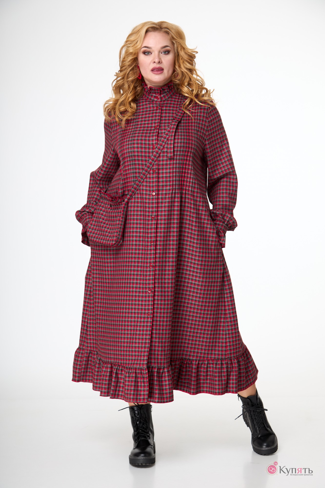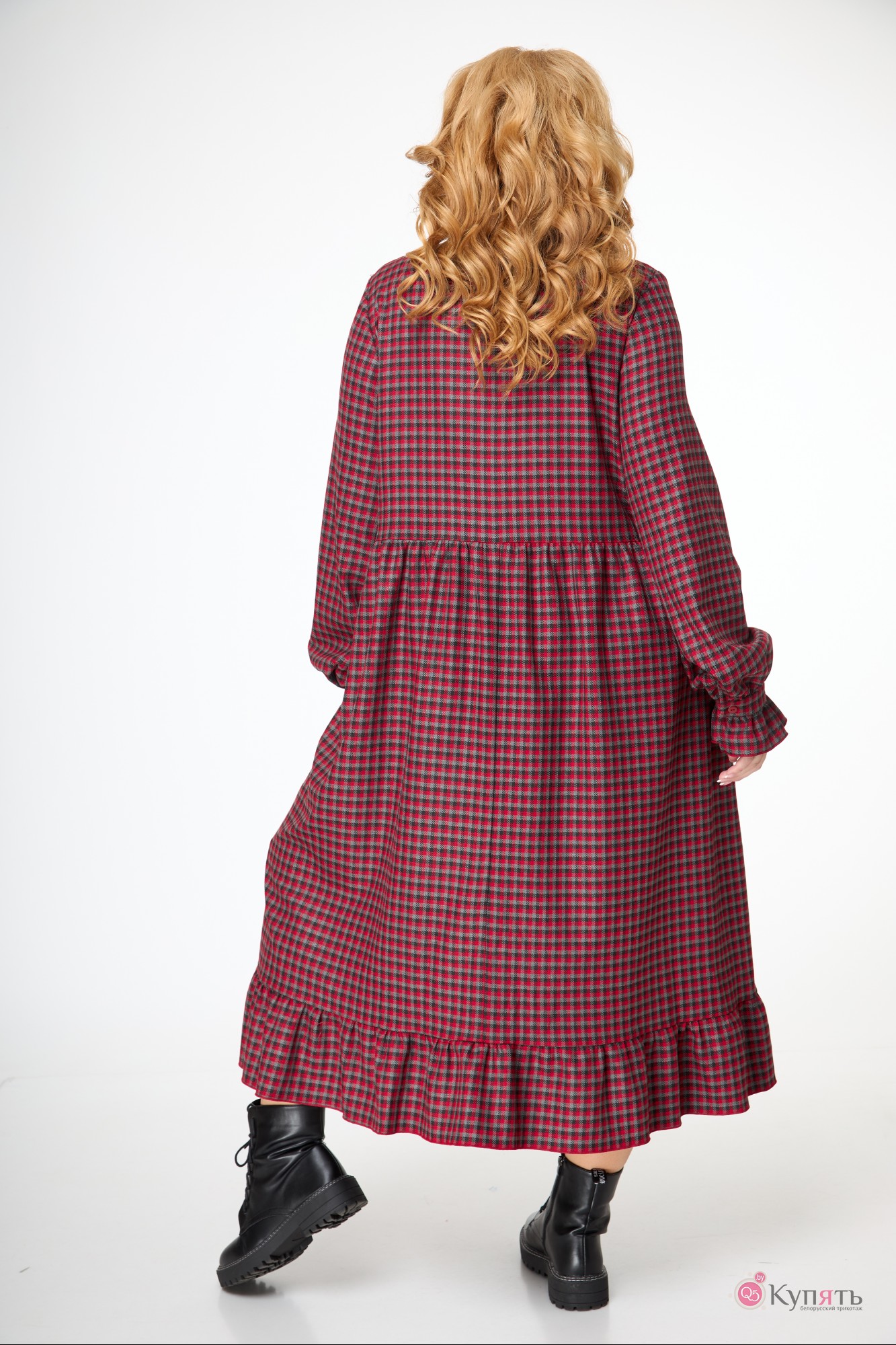 Наше платье в клетку с элементами романтизма: мелкие складочки на полочке, рюша по стойке горловины и по низу манжеты втачного рукава; волан по низу платья и по спинке на уровне талии. Слегка расширенный силуэт, длина миди.