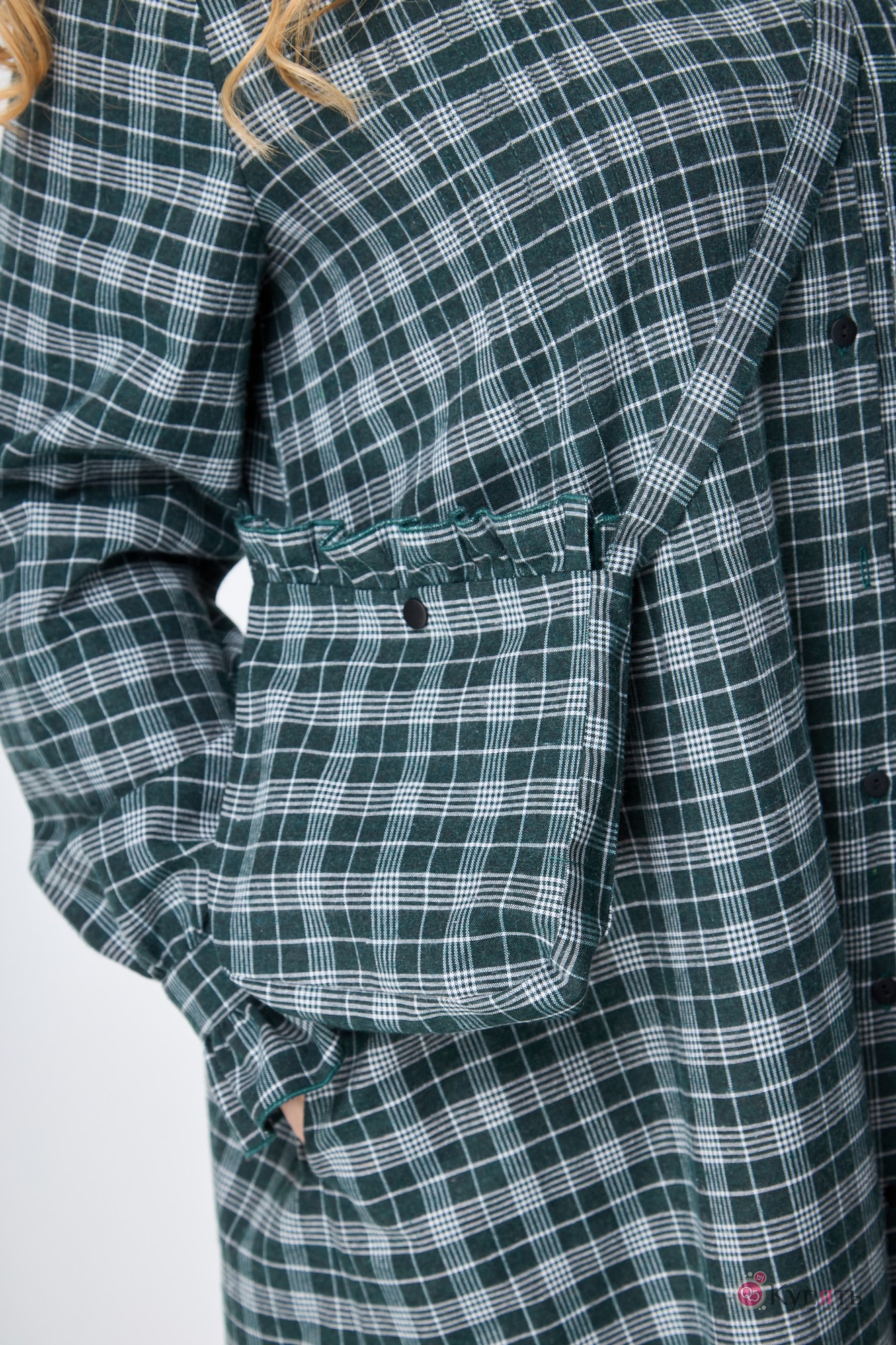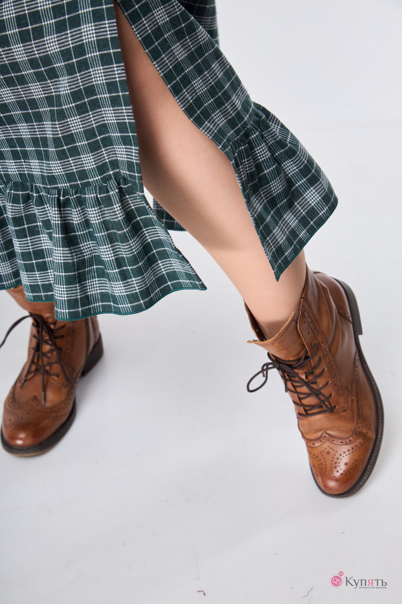 Наше платье в клетку с элементами романтизма: мелкие складочки на полочке, рюша по стойке горловины и по низу манжеты втачного рукава; волан по низу платья и по спинке на уровне талии. Слегка расширенный силуэт, длина миди.
