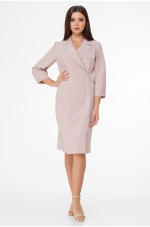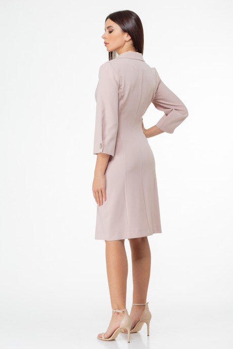 Полуприлегающий силуэт, вертикальные рельефы от проймы по переду и спинке платья, двубортное с отложными лацканами и воротником, ассиметричная застёжка на молнии, втачные рукава 3/4 длины со складкой по низу.