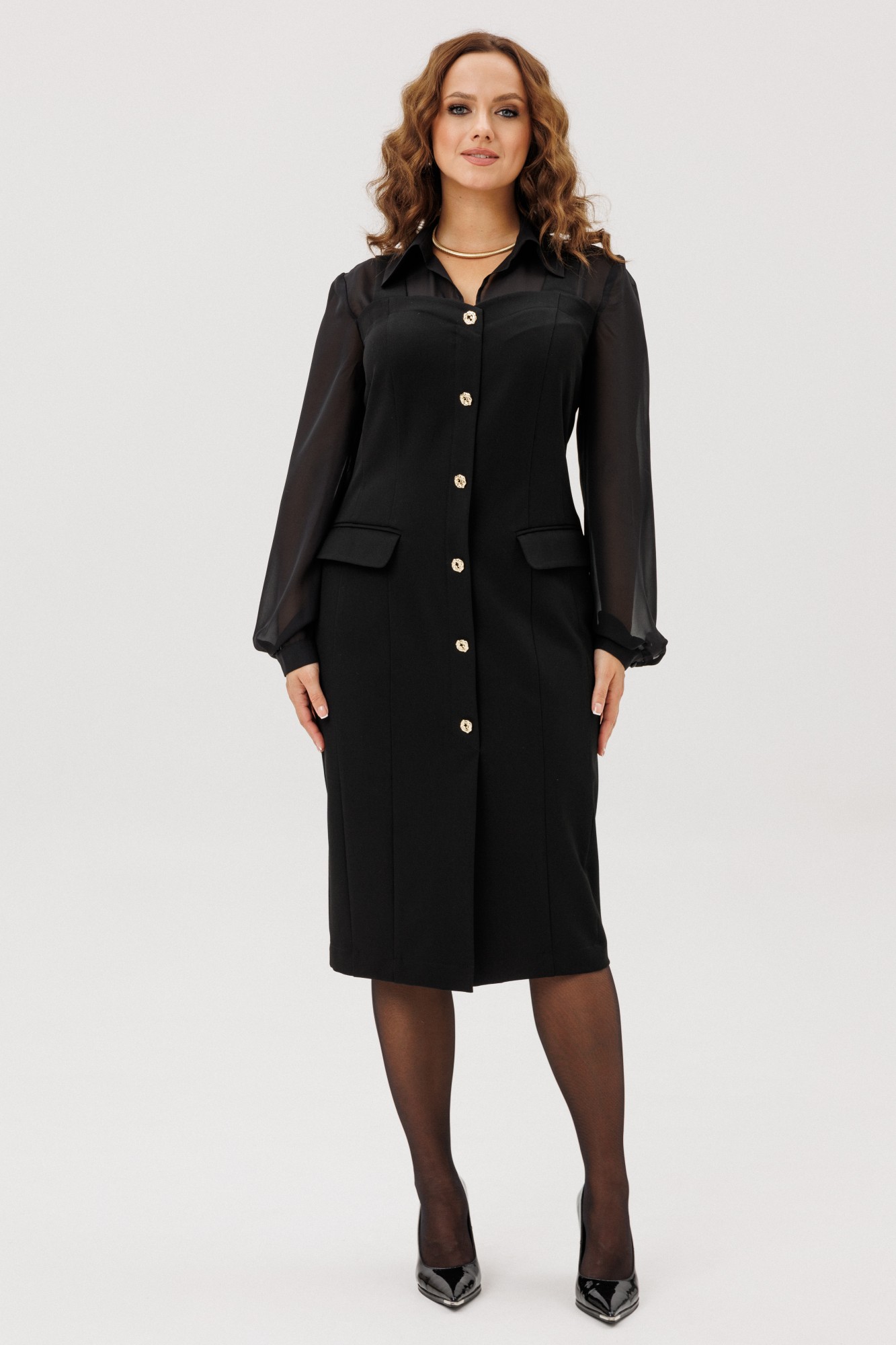Платье из костюмной ткани малого объема, приталенного силуэта с имитацией рубашки из шифона. На широких бретелях.