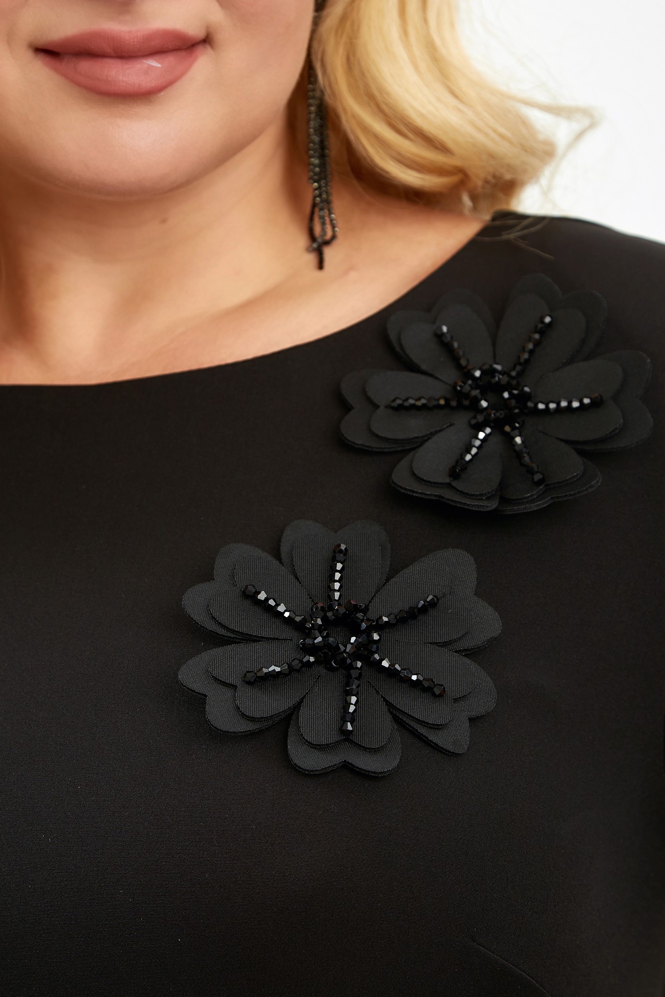 Стильное базовое черное платье от бренда «AXXA» О-образного силуэта, выполнено из качественной плательной ткани, что придает изделию определенную элегантность. В области низа спинки и полочки изделия расположены вытачки, благодаря которым силуэт платья принимает слегка зауженную форму. Спинка со средним швом. Сзади платье на потайной молнии. Горловина округлая типа лодочка. Рукав втачной одношовный, длина 3/4. В области груди платье декорировано съёмными цветами, что придает нежность и изящество данному изделию. Это платье станет настоящей находкой для торжественных случаев, когда особенно важно выглядеть безупречно. Выбирайте наше платье для уверенности и шарма, который раскроет Вашу индивидуальность и поможет Вам блистать в любой компании круглый год. Красота этого платья не оставит Вас незамеченной и подчеркнет Ваш безупречный вкус и станет фаворитом в вашем гардеробе!