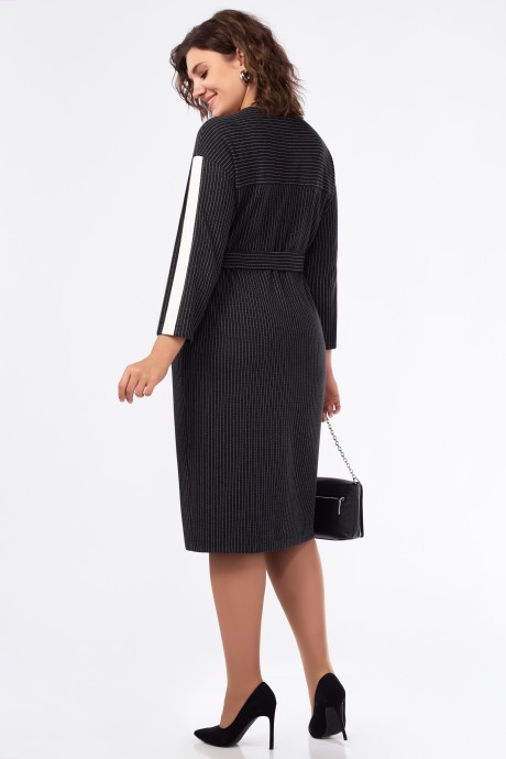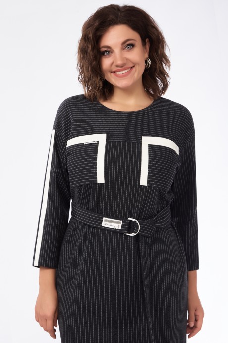 Платье женское прямого силуэта выполнено из трикотажного полотна в полоску.Перед с отрезной кокеткой и накладными карманами с планками из экокожи и декоративной нашивкой.Спинка цельная с отрезной кокеткой.Плечо спущено.Рукава длиной 3/4 с вставками из экокожи.Платье дополнено поясом.