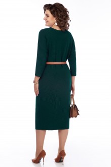 Женское платье полуприлегающего силуэта длиной до середины икры, выполнено из тонкого мягкого трикотажного полотна с рельефным геометрическим рисунком. Плечи спущены. Рукава одношовные длиной 3 / 4. По переду выполнена кожаная аппликация с дизайнерской вышивкой. Платье укомплектовано ремнем.