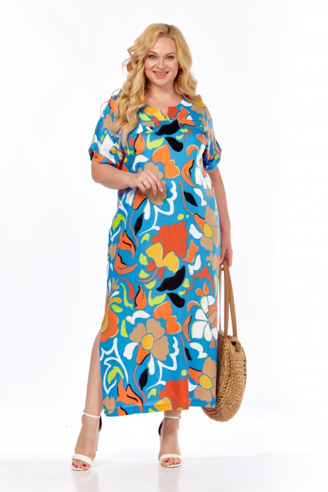 Женское летнее платье длиной макси, выполнено из штапеля в оригинальном дизайне. Перед с отрезной кокеткой, в шве клапаны с декоративными пуговицами. Спинка со средним швом. Рукава короткие цельнокроеные с отрезными отложными манжетами с патами и декоративными пуговицами. В боковых швах функциональные карманы. По бокам разрезы.