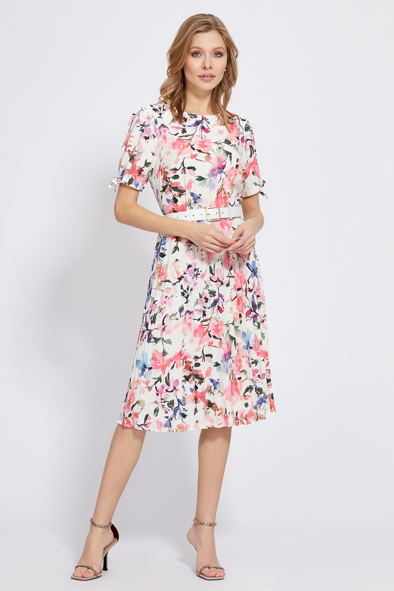 Красивое платье Х-образного силуэта из приятной ткани с романтическим акварельным, цветочным принтом, округлым вырезом горловины, рукавами-фонариками с завязками в виде бантиков, плиссированной юбкой, придающей невероятную лёгкость модели и талией на резинке. Изюминка модели – неспадающие завязки по спинке, которые можно завязать бантом из шифона в тон. Завершить образ помогает пояс-ремень с пряжкой.