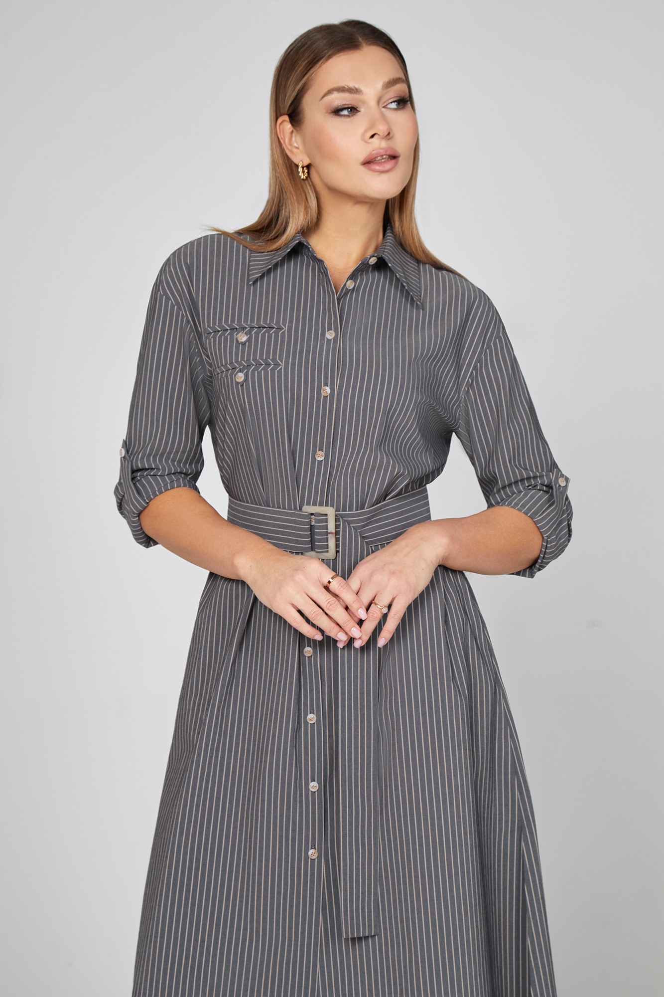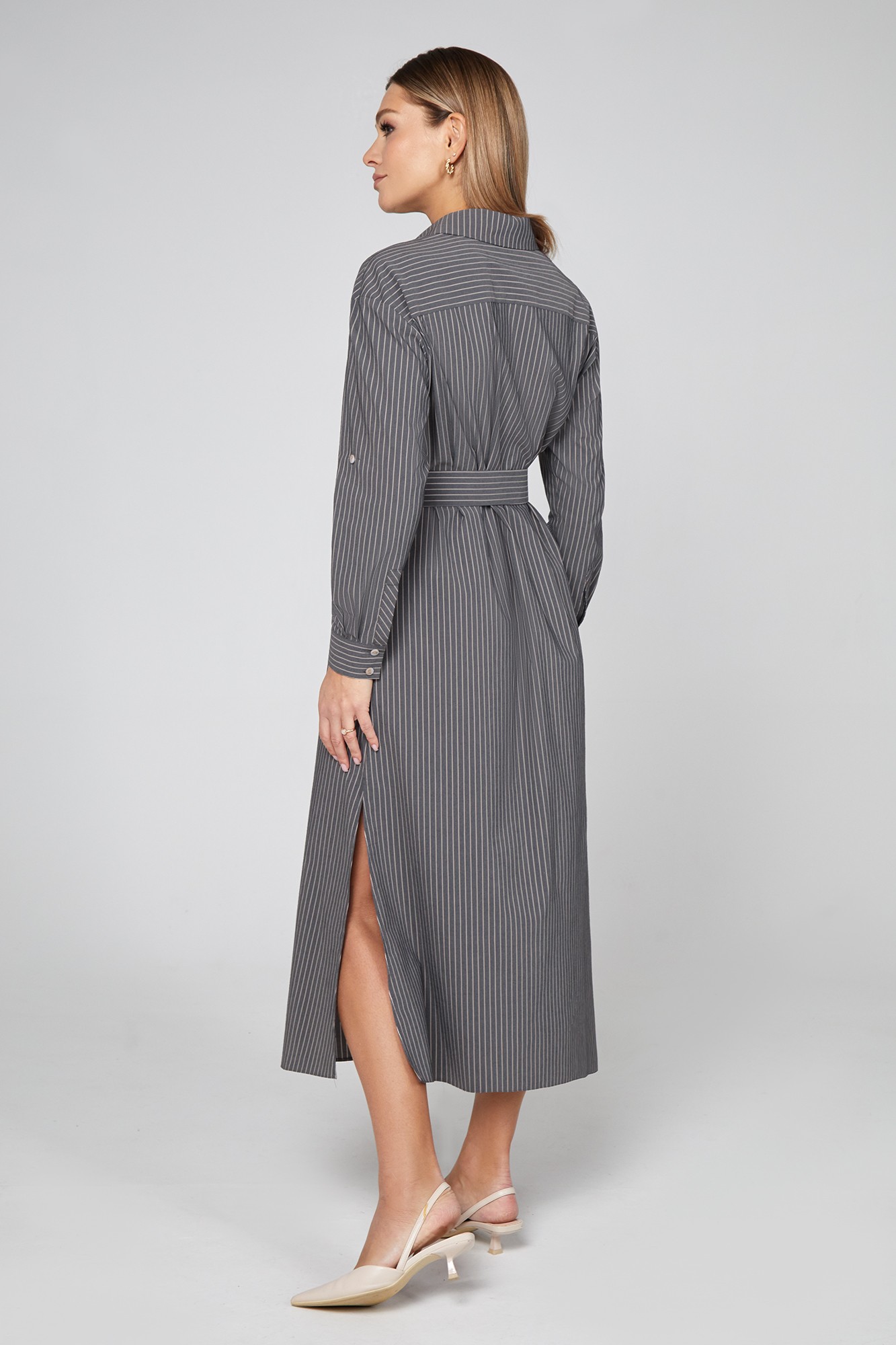 Платье-рубашка Это модное платье-рубашка с тонкими полосками, сочетает в себе шик и современность. Модная длина мидакси, разрезы в боковых швах и пояс, подчёркивающий талию- придают платью женственный характер. Рубашечный воротник добавляет образу грациозности, а застёжка на пуговицы по всей длине позволяет регулировать глубину выреза декольте. Нагрудные карманы-обманки и длинные рукава с манжетами, которое при желании можно подвернуть и зафиксировать при помощи пат и пуговиц - завершают дизайн. Для придания комфорта использована приятная хлопковая ткань производства Голландии. Лучше не бывает!