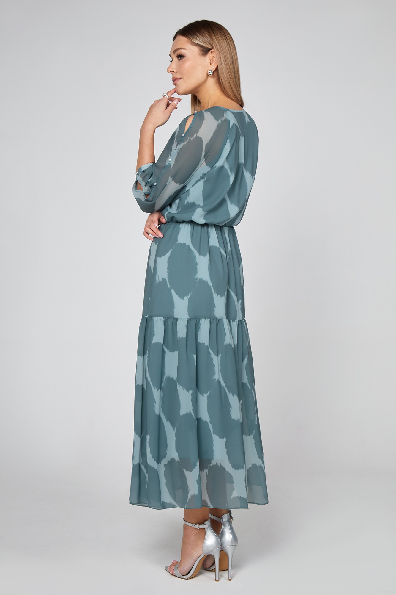 Изящное платье длины макси из приятного, струящегося польского шифона с абстрактным принтом. Перед со щелевидным вырезом горловины и застёжкой на навесную петлю и пуговицу-бусину. Модель отрезная по талии, со скрытой резинкой, обеспечивающей удобную и красивую посадку на фигуре и декоративной кулисой, добавляющей оригинальности модели. Укороченные, полупрозрачные рукава-реглан и перед лифа дополнены эффектными вырезами с декоративной фурнитурой. Летящая юбка добавляет силуэту динамики, а благодаря подкладке из 100% вискозы Вы будете чувствовать себя комфортно. Модная изюминка для самых разных случаев!