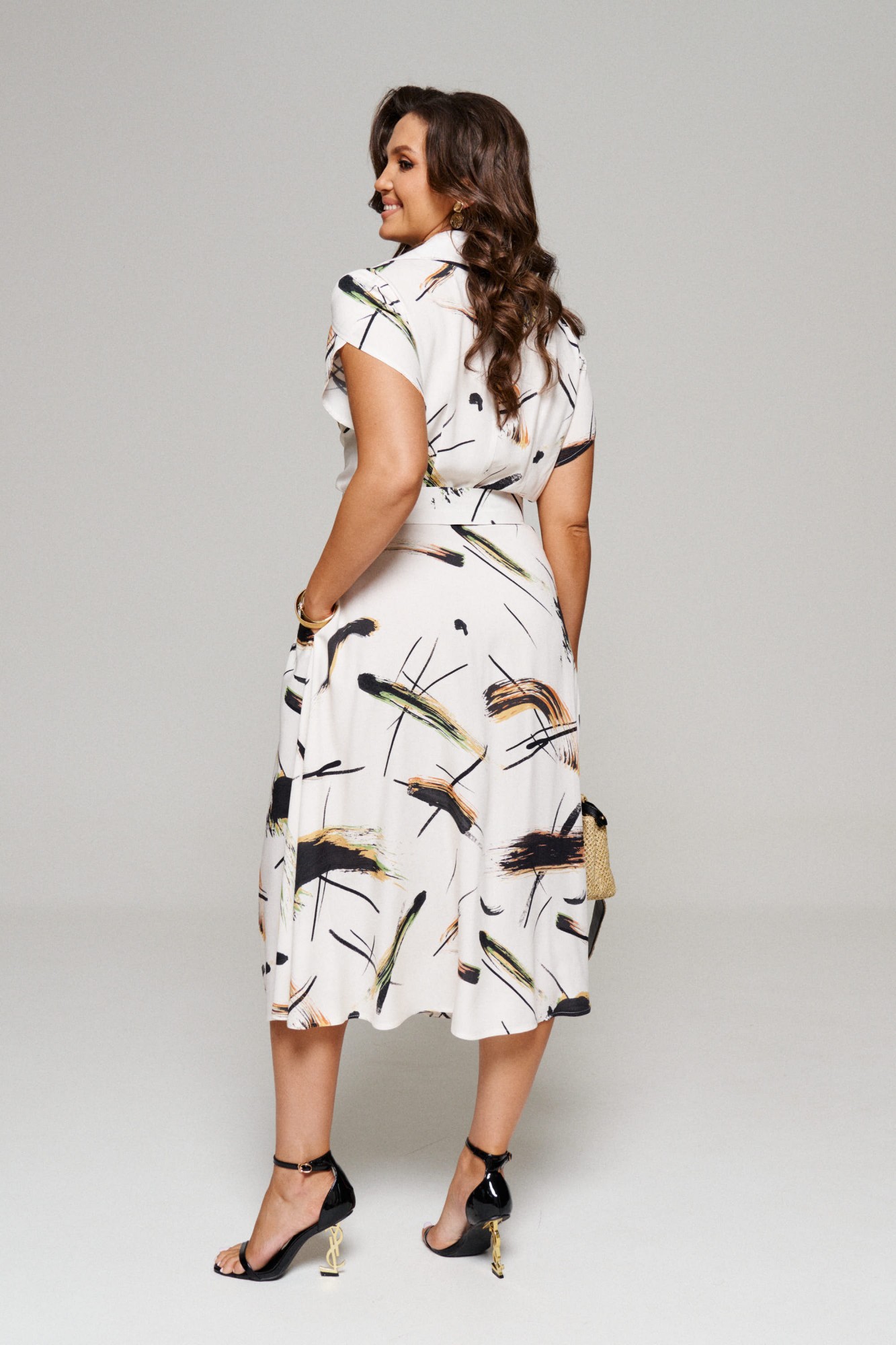 Нижняя часть платья свободного кроя, на запах, выполнена в стиле «средний колокол».