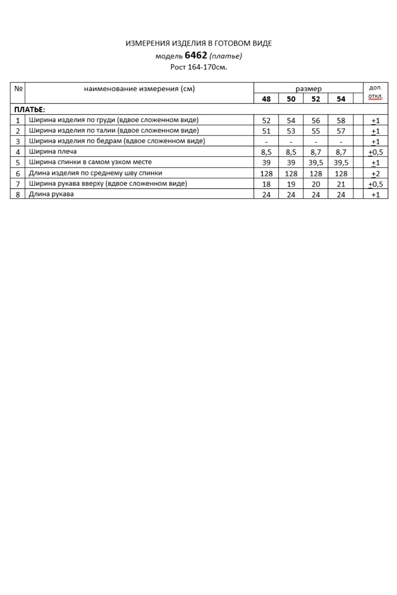 Таблица измерений