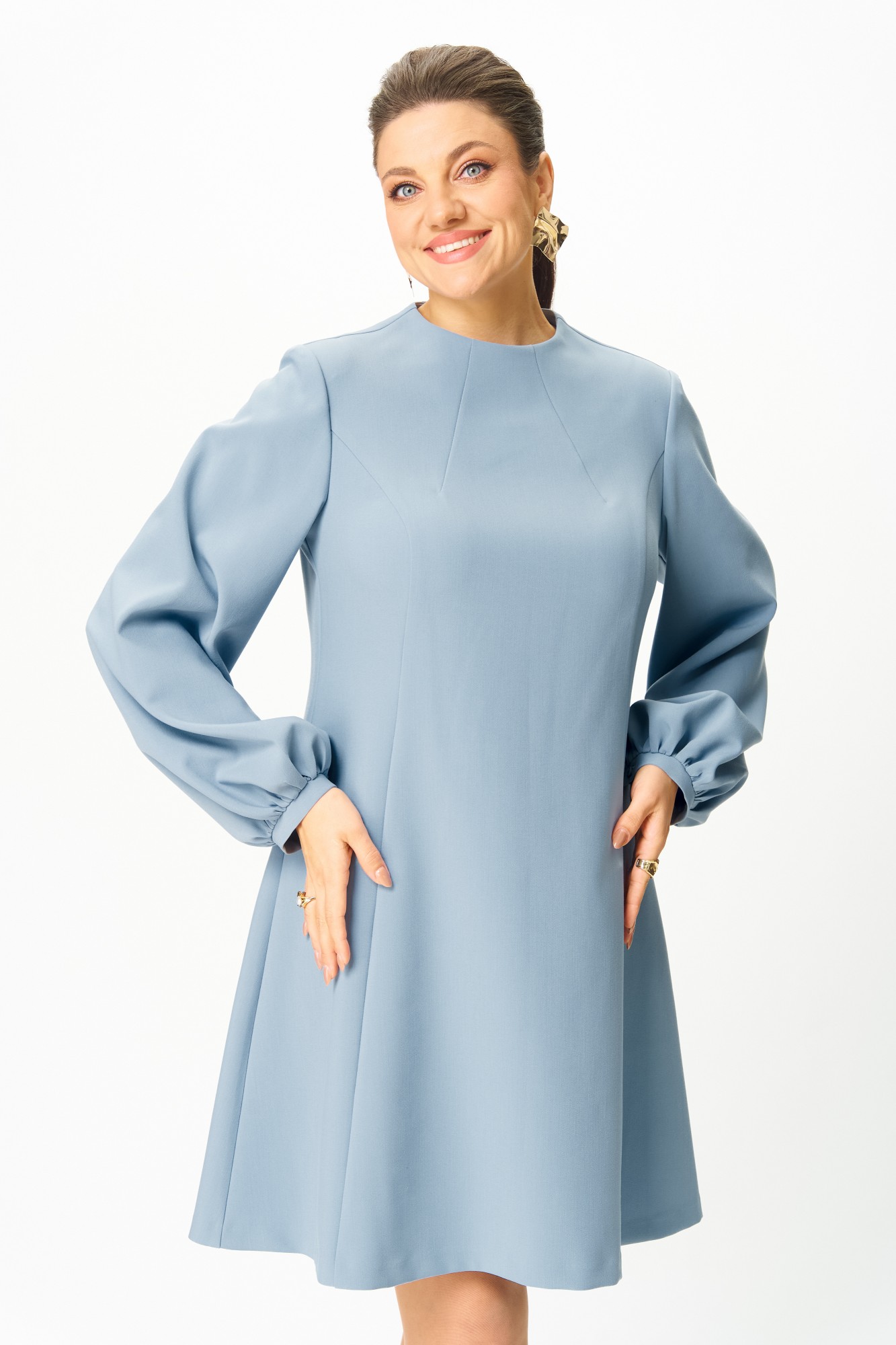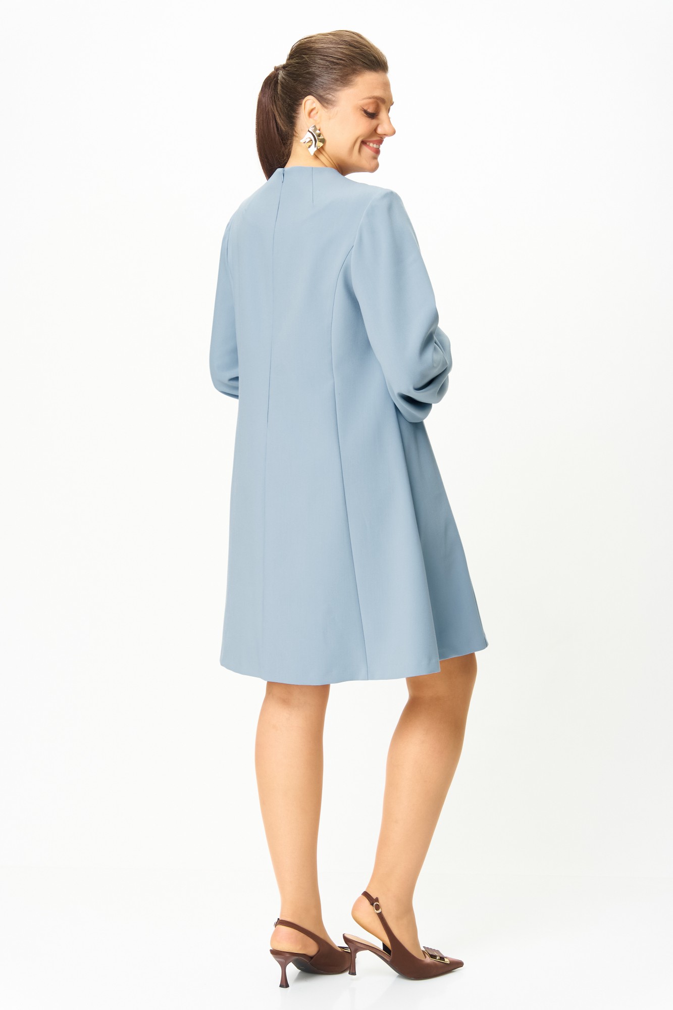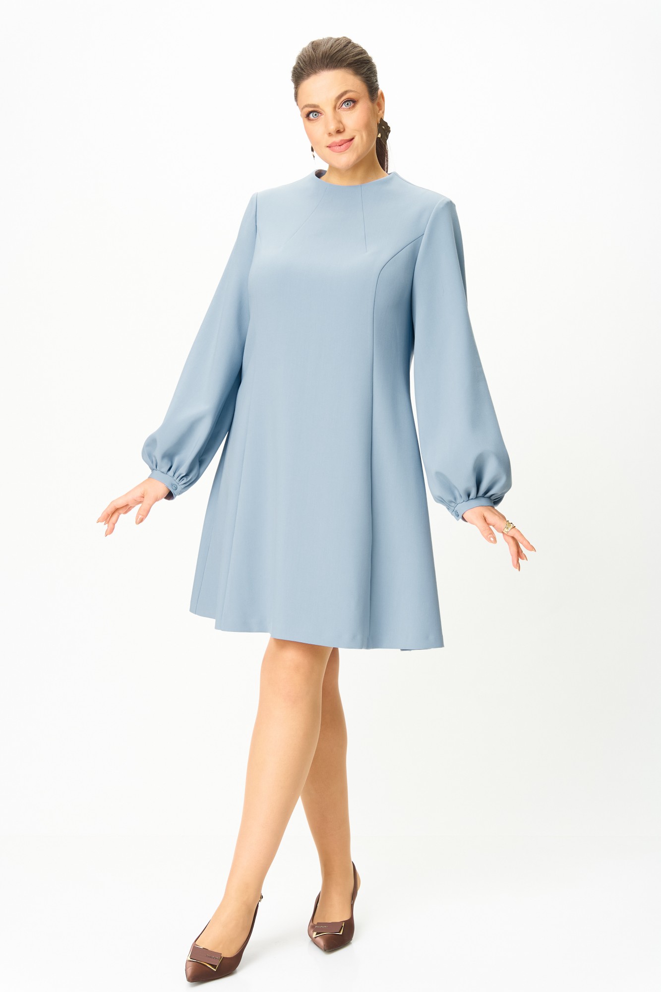 Стильное женское платье из плательной ткани с содержанием вискозы. Платье «А» образного силуэта с рельефными швами по переду и спинке. Горловина круглая с цельновыкроенной стойкой. Застежка на тесьму молния в центральном шве спинки. Рукава втачные, со сборкой по низу, на узком манжете с застежкой на петлю и пуговицу. Платье без подкладки.