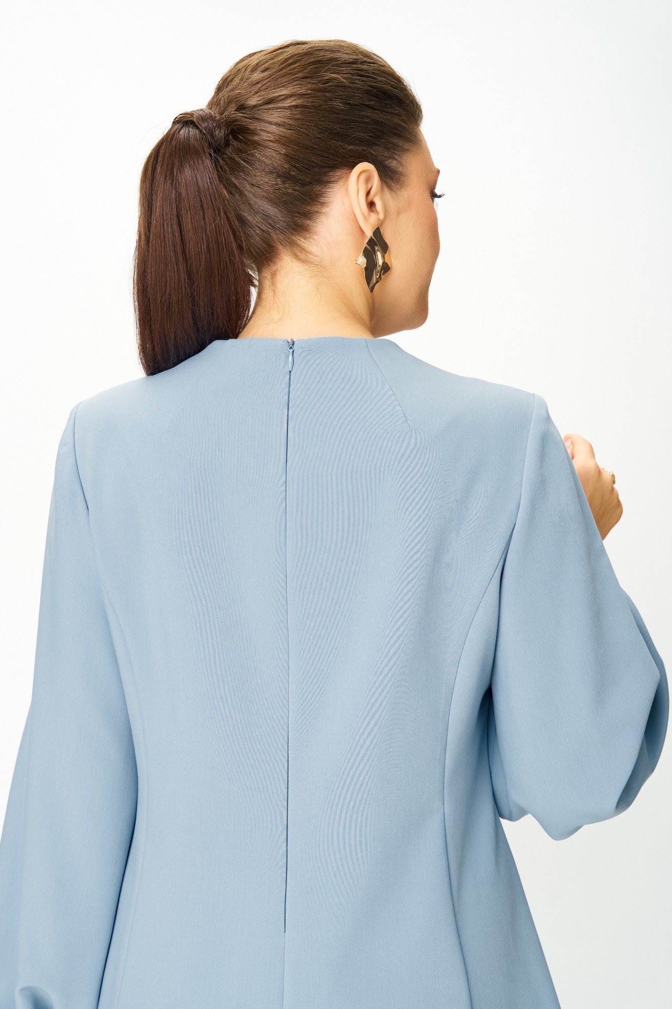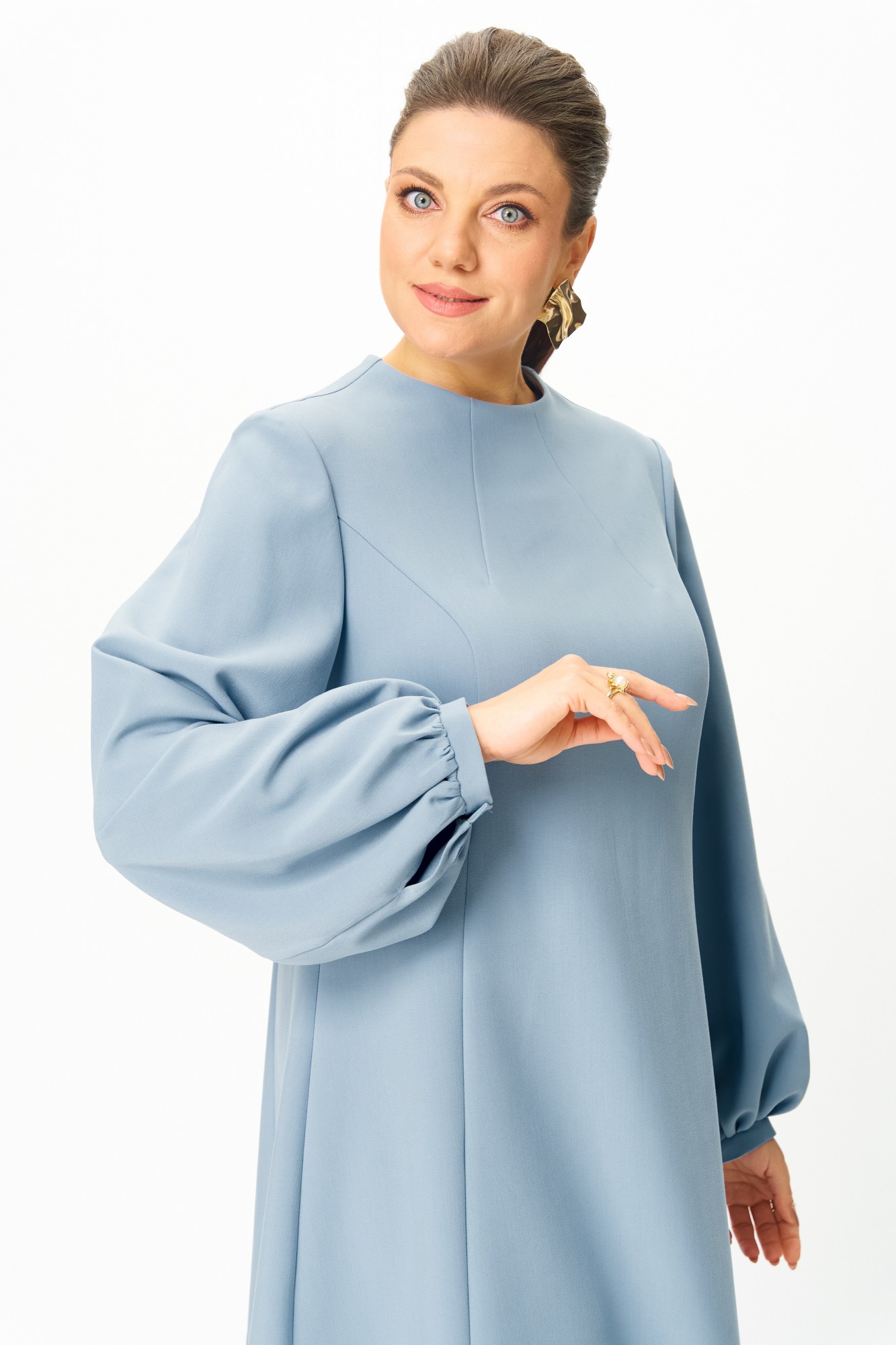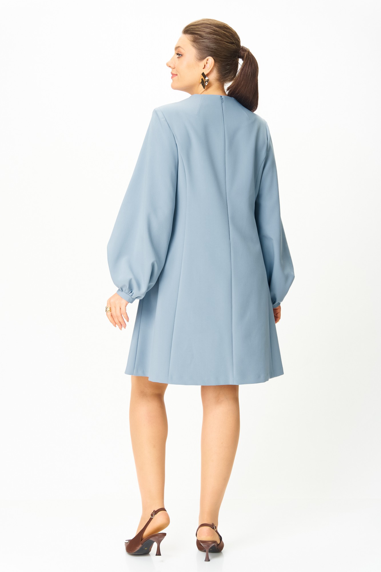 Стильное женское платье из плательной ткани с содержанием вискозы. Платье «А» образного силуэта с рельефными швами по переду и спинке. Горловина круглая с цельновыкроенной стойкой. Застежка на тесьму молния в центральном шве спинки. Рукава втачные, со сборкой по низу, на узком манжете с застежкой на петлю и пуговицу. Платье без подкладки.
