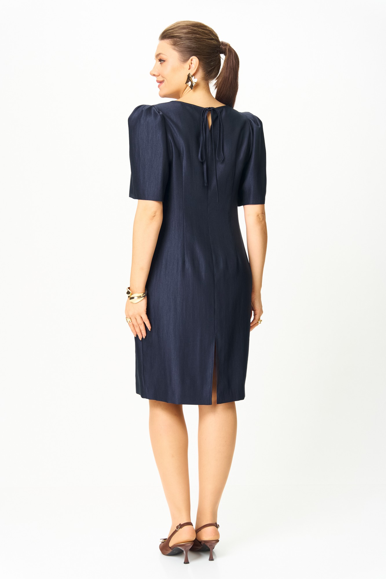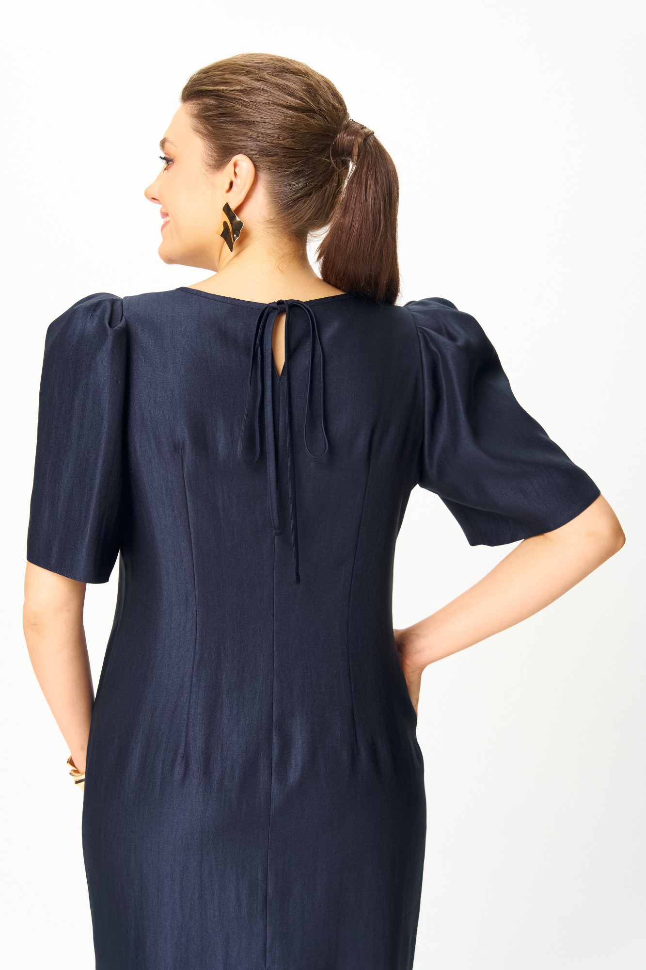 Элегантное женское платье, выполнено из плательной ткани с небольшим блеском. Платье полуприлегающего силуэта, горловина круглая. По спинке в центральном шве разрез возле горловины с завязкой и разрез по низу. Платье без подкладки.