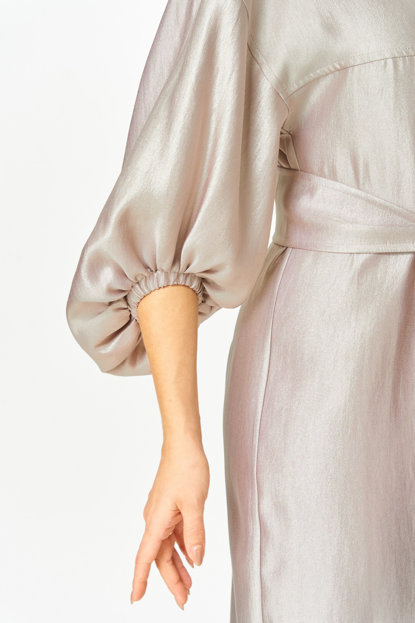 Стильное женское платье, выполнено из плательной ткани с небольшим блеском. Платье прямого силуэта, с отрезными бочками и разрезом по низу платья. Застежка на декоративную молнию в центральном шве спинки. Горловина круглая. Рукава со спущенной проймой. Рукав широкий, с асимметричным низом, собранным на резинку. В комплект входит пояс их основной ткани. Платье без подкладки.
