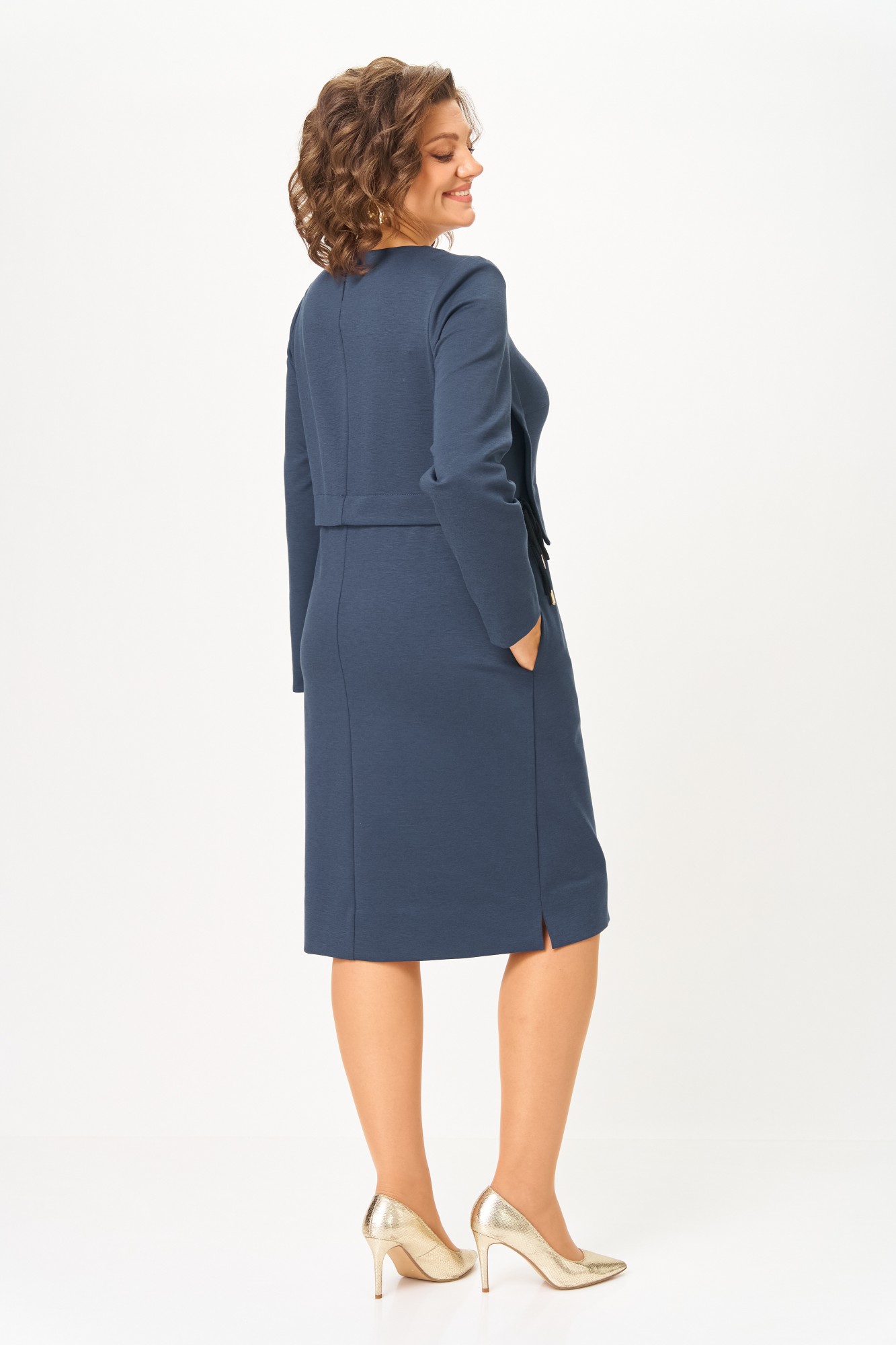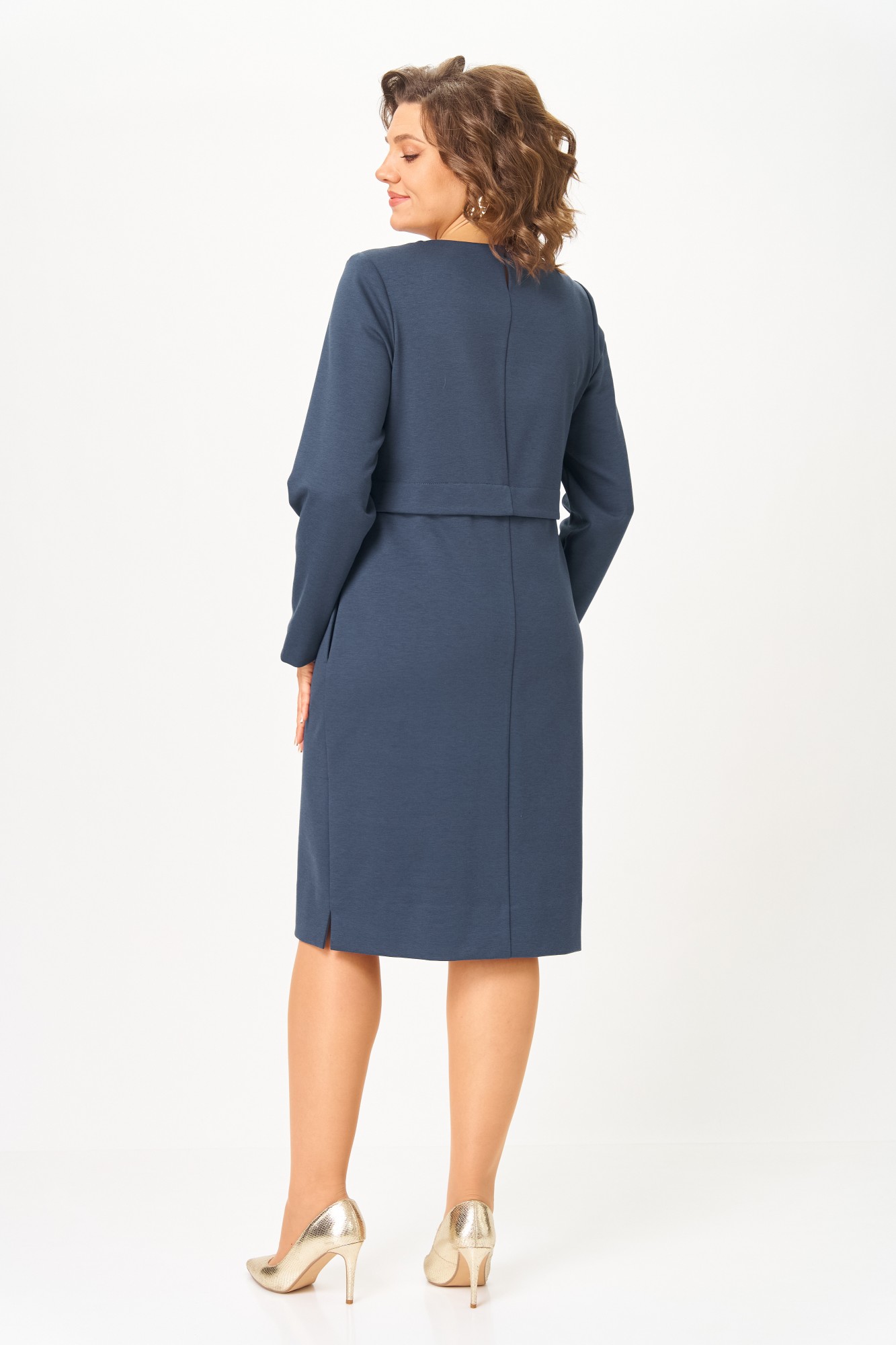 Элегантное женское платье, выполнено из трикотажного полотна. Платье полуприлегающего силуэта. По переду и спинке фигурный подрез на уровне талии. По левой стороне переда на уровне груди накладной карман с пришивной брошкой, горловина круглая, талия собрана на кулису. Рукава втачные. Брошка на груди может отличаться!