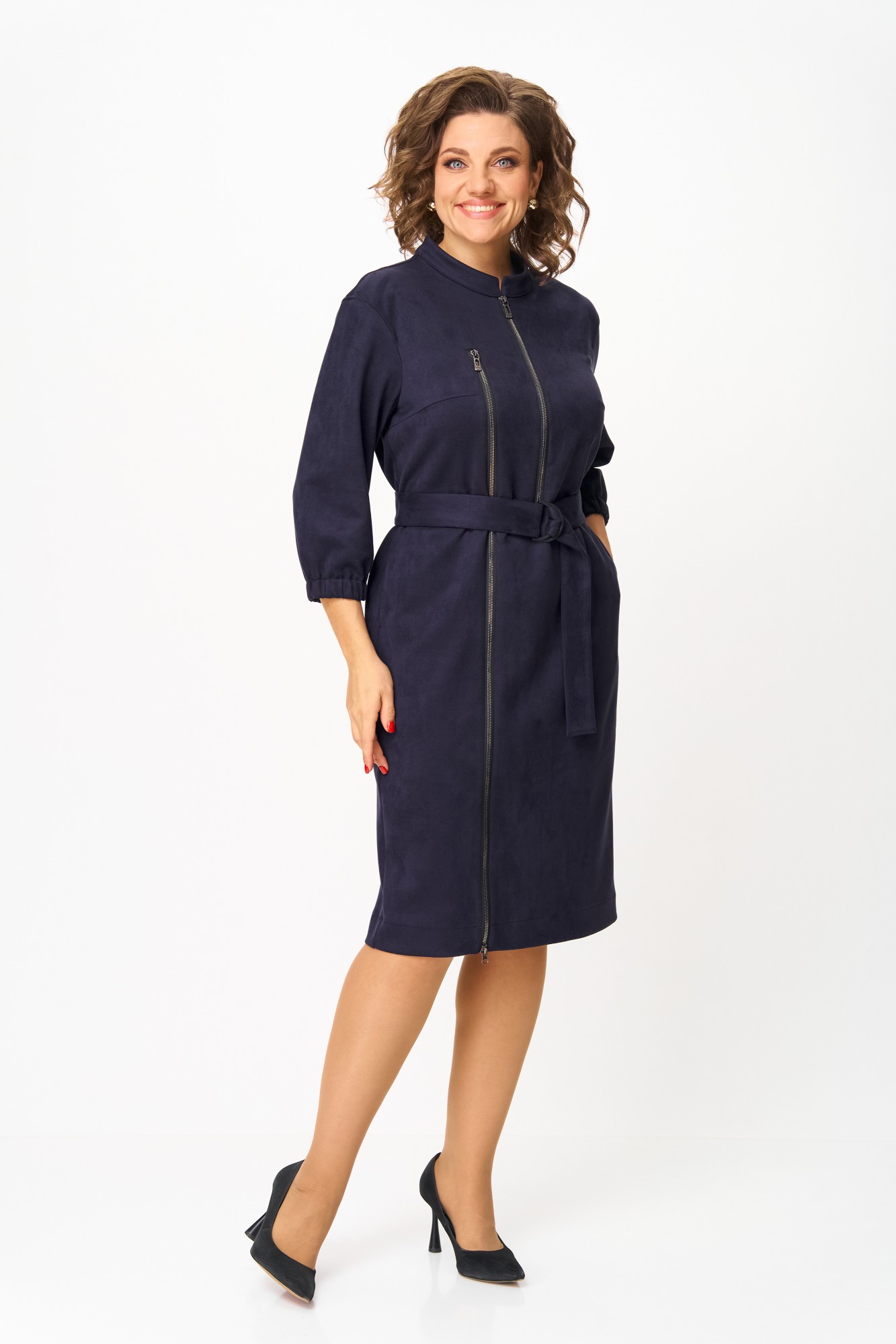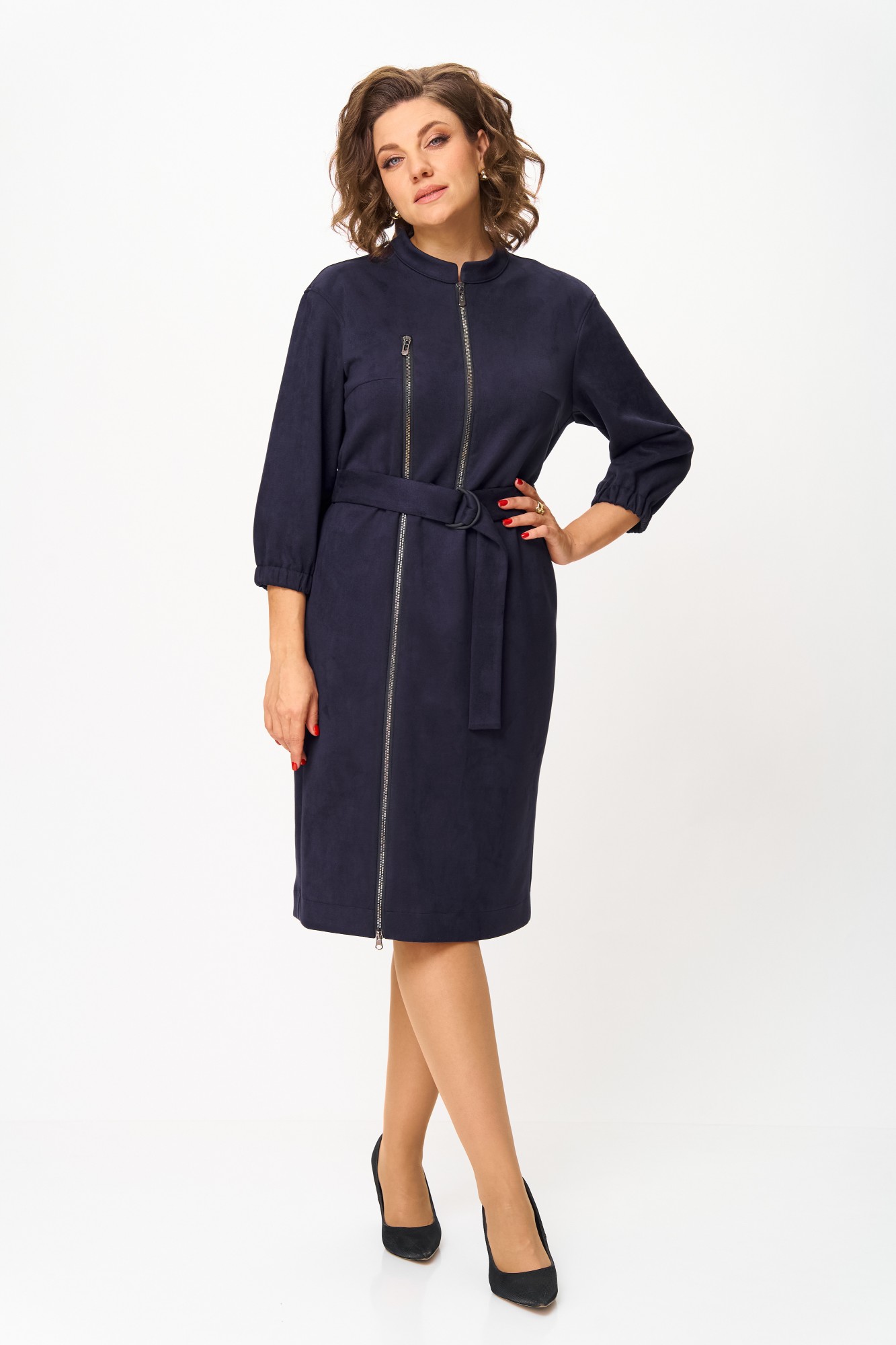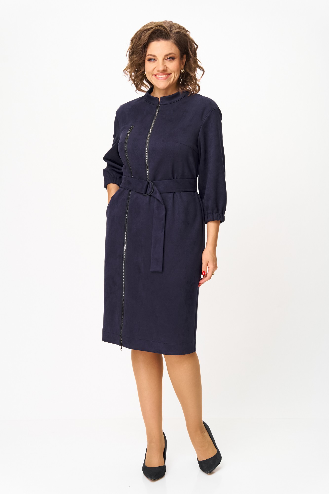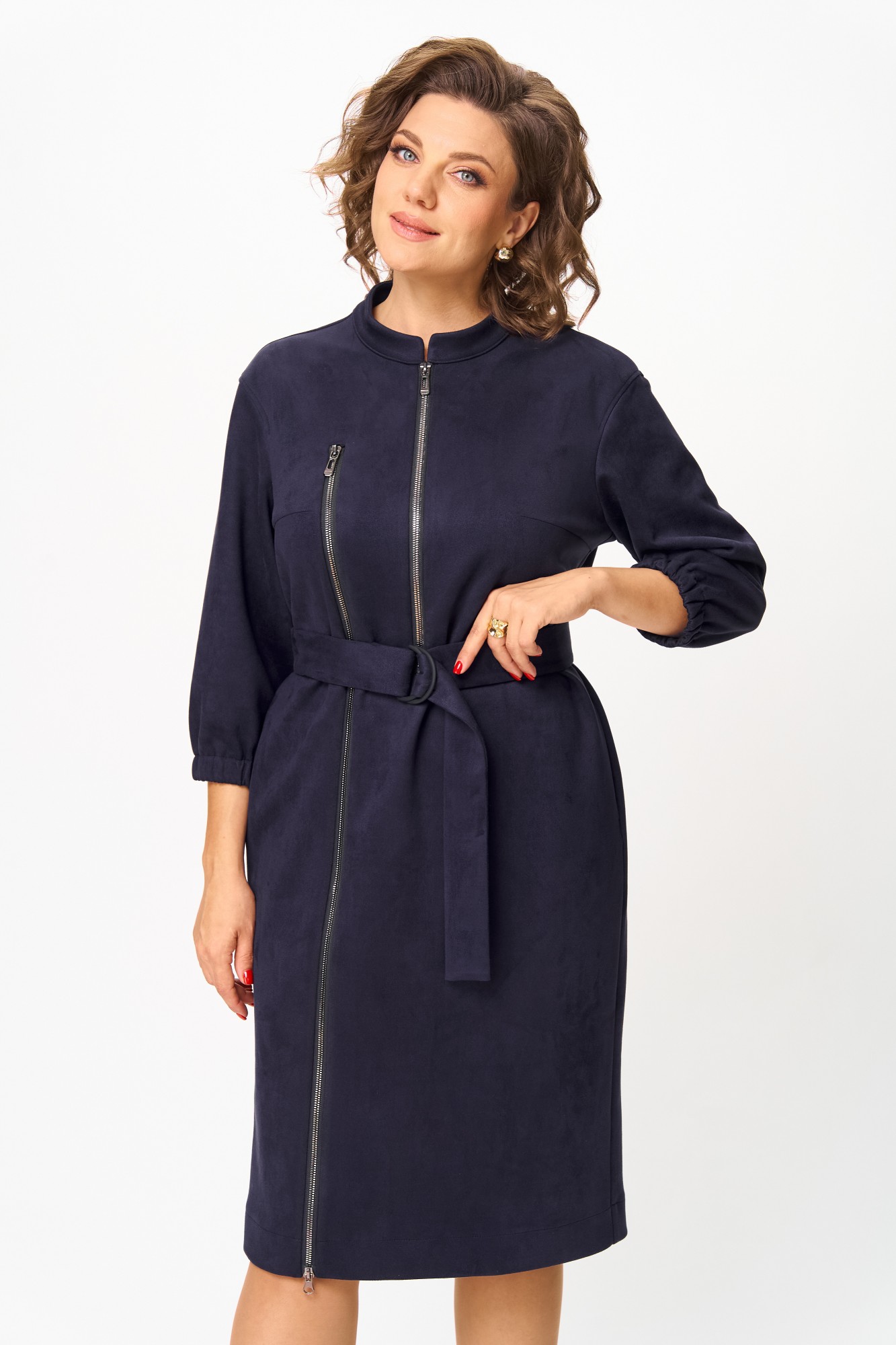 Элегантное женское платье из ткани искусственная замша. Платье полуприлегающего силуэта. По переду платье декорировано двумя рядами молнии. Горловина оформлена воротником стойка, в боковых швах на уровне бедер карманы. Спинка с центральным швом. Линия плеча спущена. Рукава втачные, длина ¾, низ на резинке.